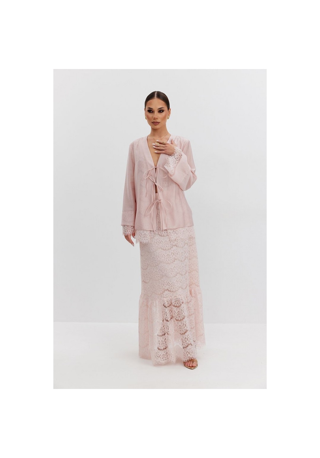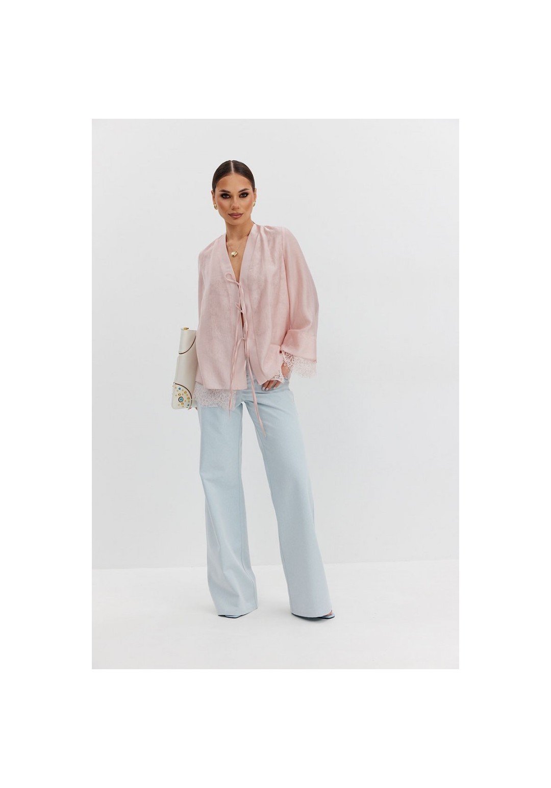 Блузка женская свободного силуэта, из полупрозрачной вуали. Спинка и перед на кружевной подкладке. Застежка на планку с тремя завязками. Рукав втачной длинный расширенный книзу, по низу рукава кружевная широкая манжета, имитирующая многослойность. Длина рукава с кружевом 60 см. 44 р-р: ОГ - 106 см., ОБ - 112 см. 46 р-р: ОГ - 110 см., ОБ - 116 см. 48 р-р: ОГ - 114 см., ОБ - 120 см. 50 р-р: ОГ - 118 см., ОБ - 124 см. 52 р-р: ОГ - 122 см., ОБ - 128 см.