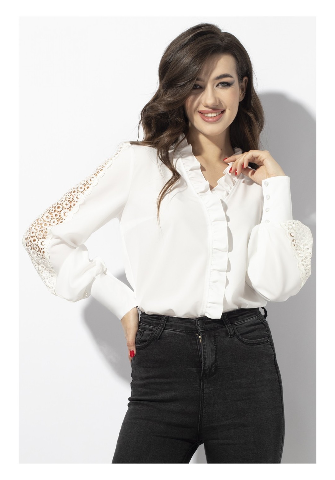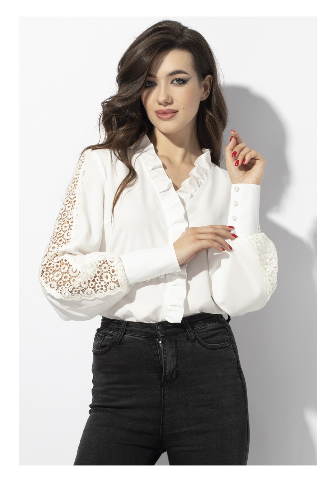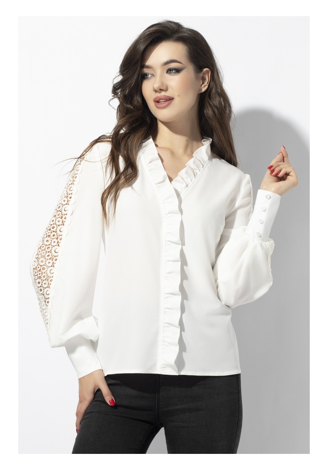 Блуза женская делового стиля, прямого силуэта. Перед из двух частей с нагрудными выточками. По центру переда и горловины вставлена рюша. Спинка цельная. Рукав втачной из двух частей, по центру с настроченным кружевом, с притачной манжетой и застегивающейся на 4 пуговицы. Уход: ручная стирка при температуре не выше 30 С.