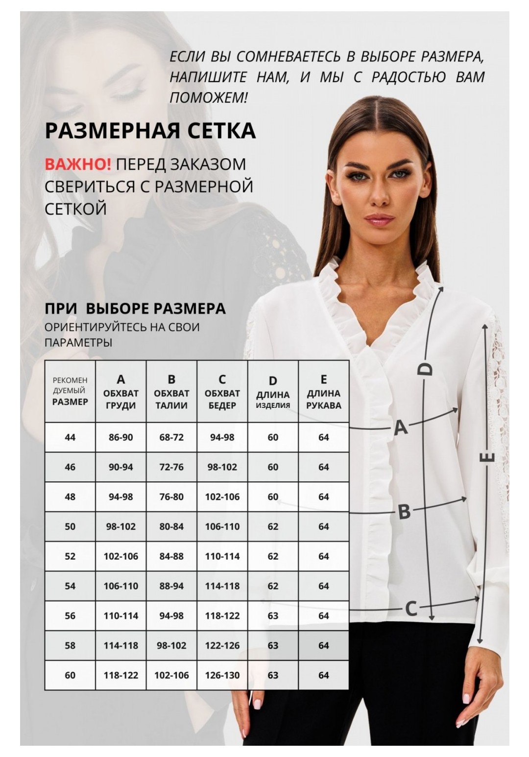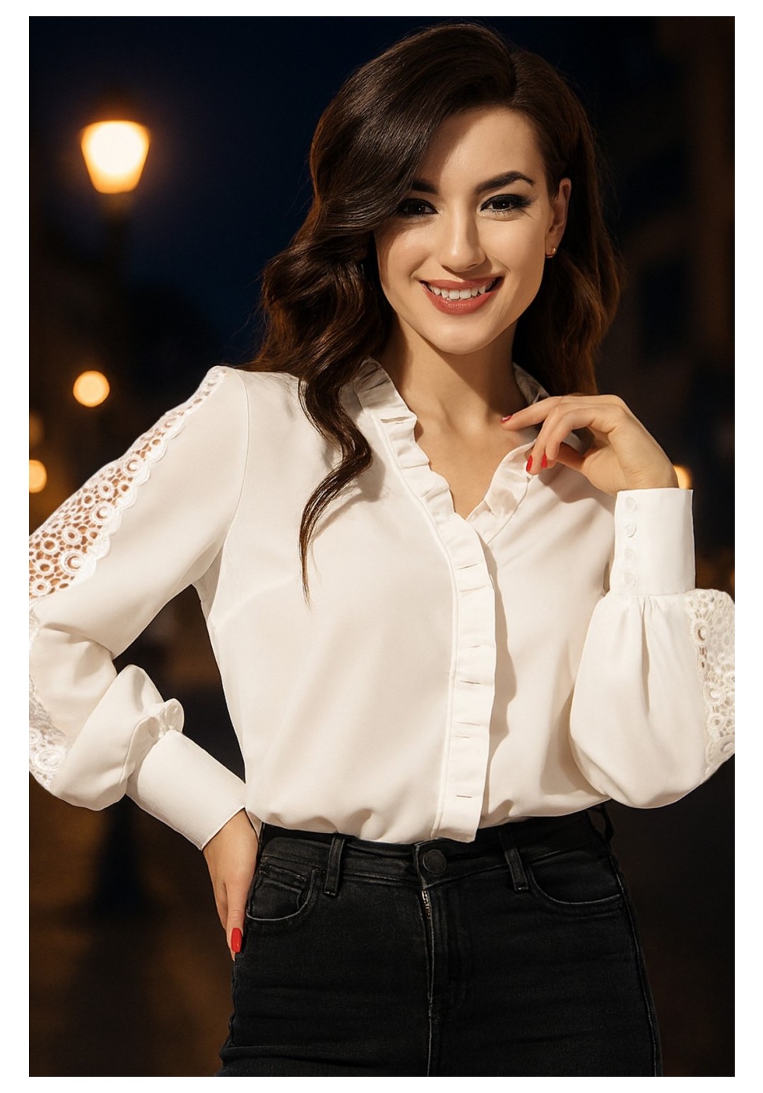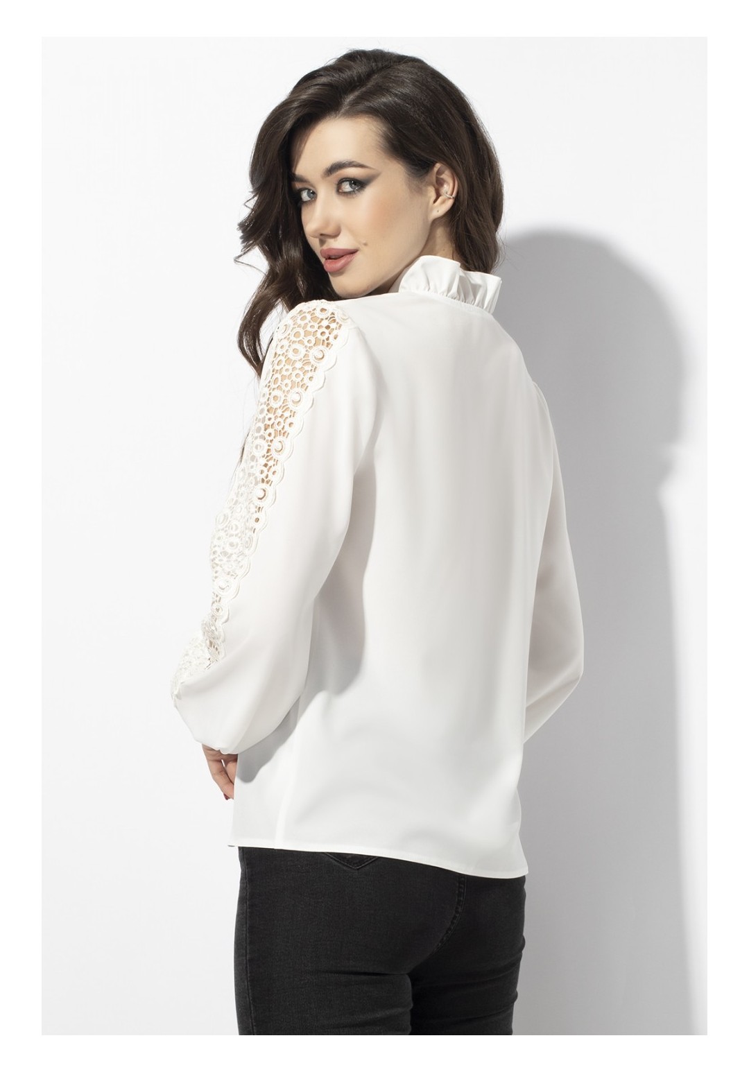 Блуза женская делового стиля, прямого силуэта. Перед из двух частей с нагрудными выточками. По центру переда и горловины вставлена рюша. Спинка цельная. Рукав втачной из двух частей, по центру с настроченным кружевом, с притачной манжетой и застегивающейся на 4 пуговицы. Уход: ручная стирка при температуре не выше 30 С.