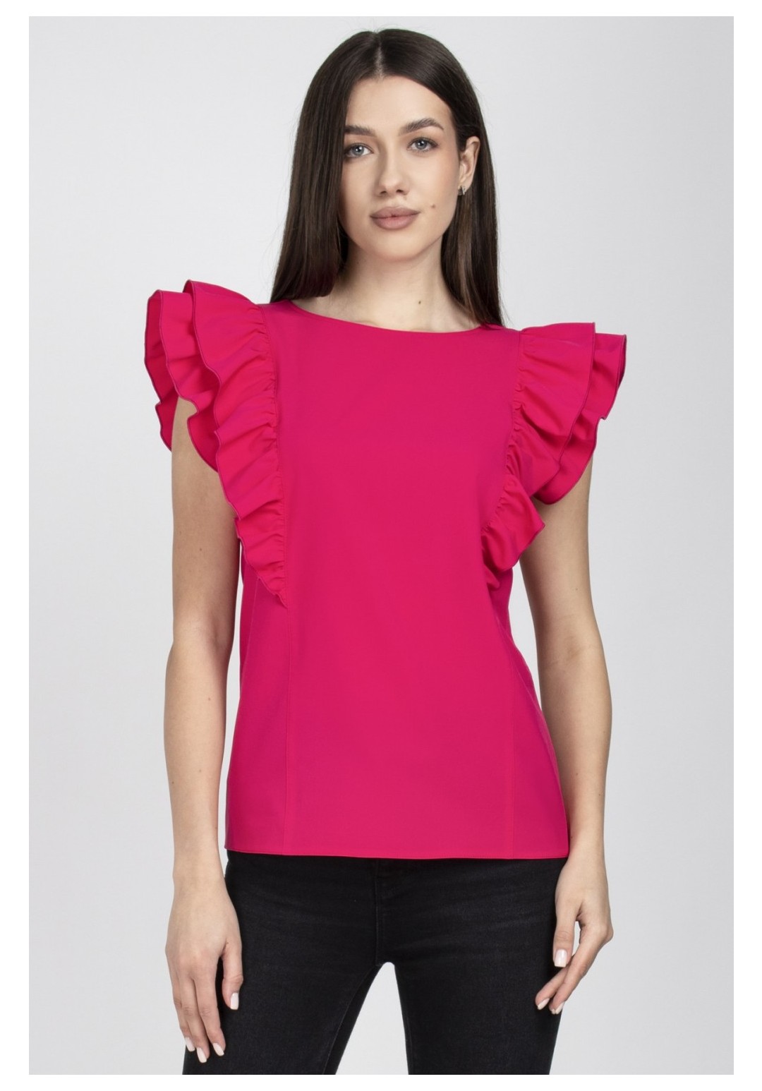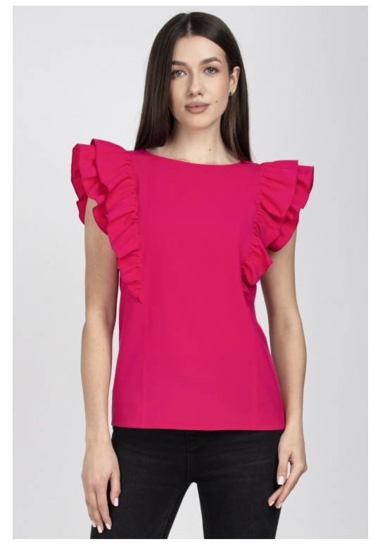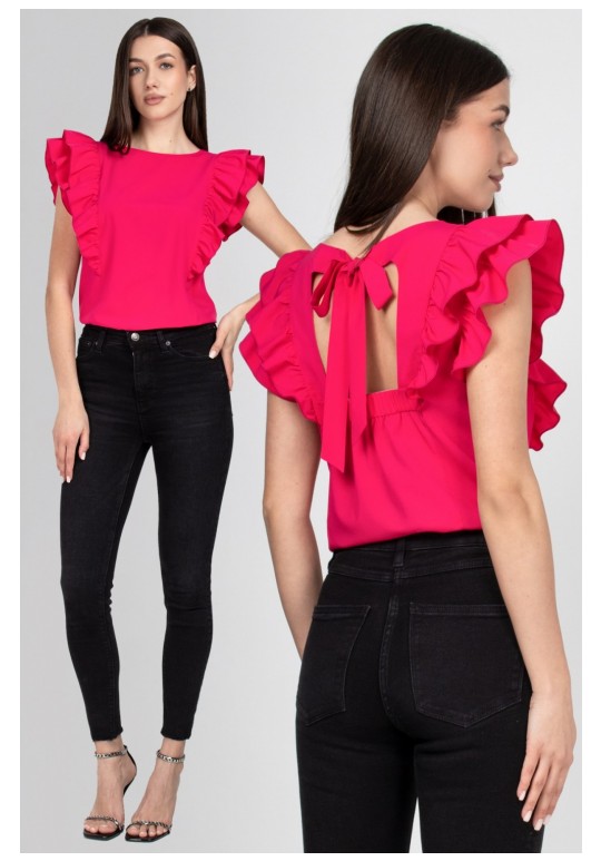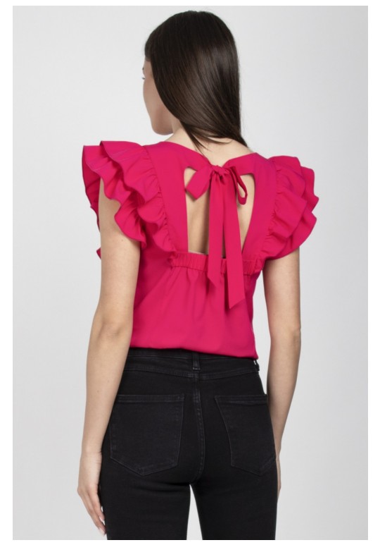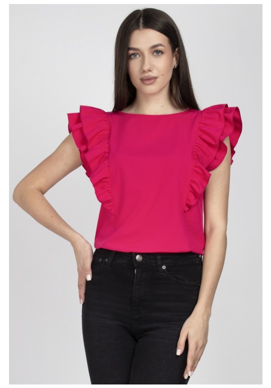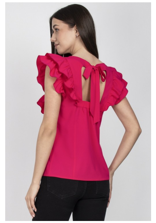 Блуза женская прямого силуэта. Перед и спинка с рельефами. В рельеф по переду и спинке вставлена рюша. На спинке завязывающийся бант. В пройму вставлено крылышко. Длина изделия (р.44, 46, 48): 58см.  Длина изделия (р.50, 52, 54): 60см.  Уход: ручная стирка при температуре не выше 30 С.