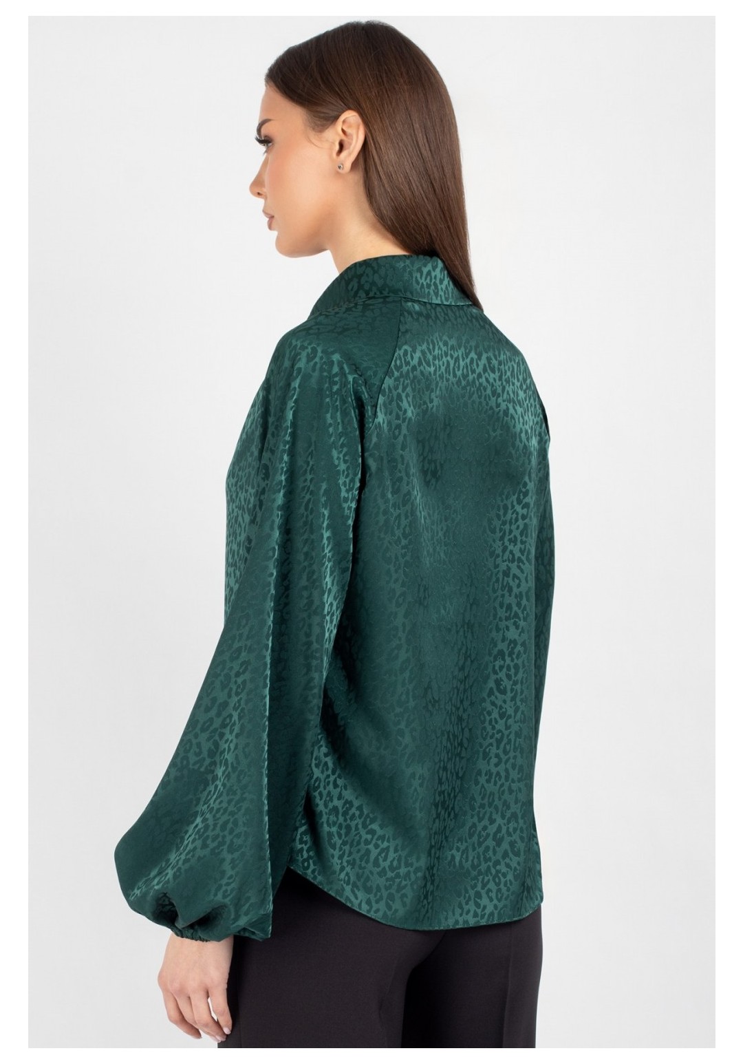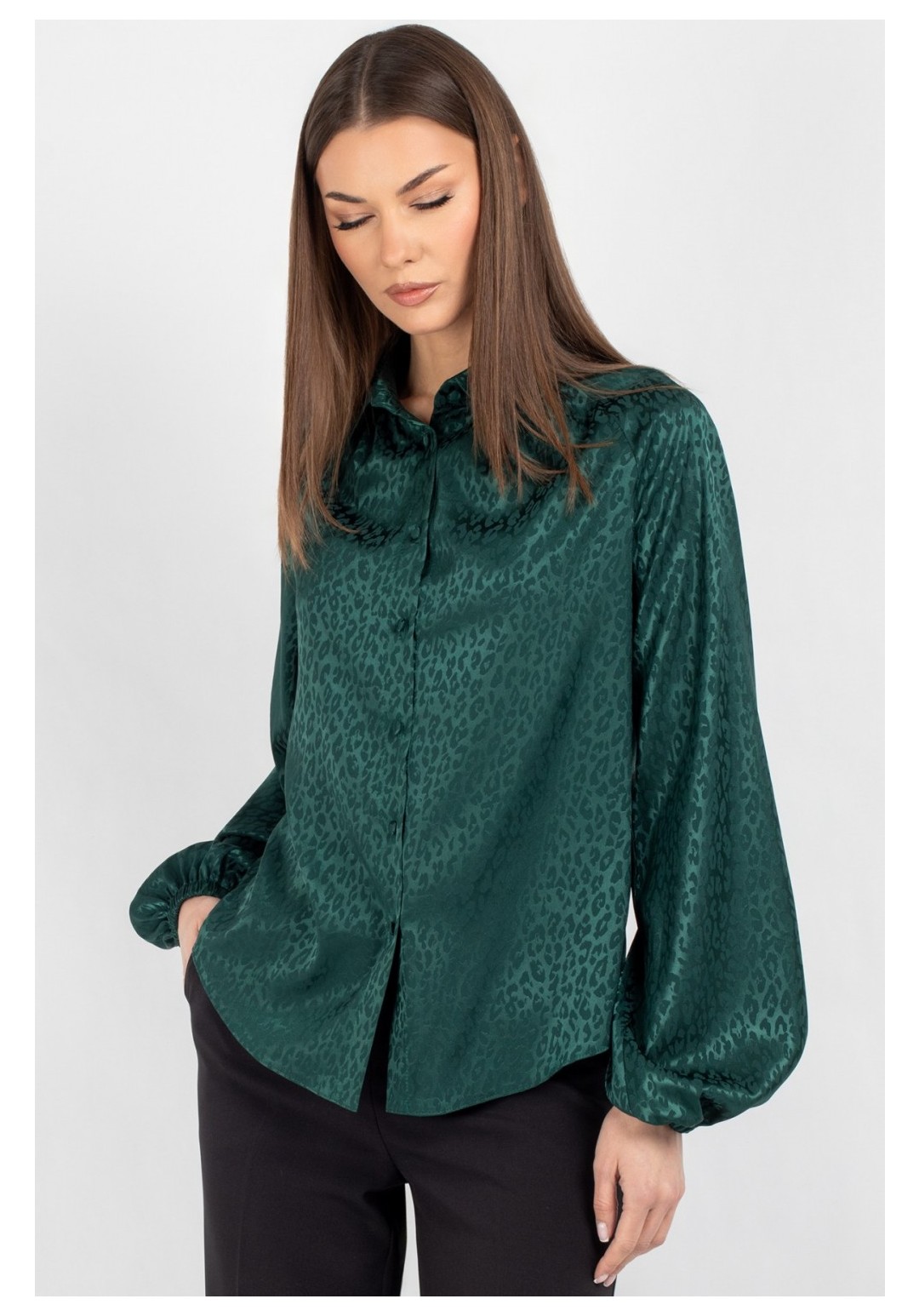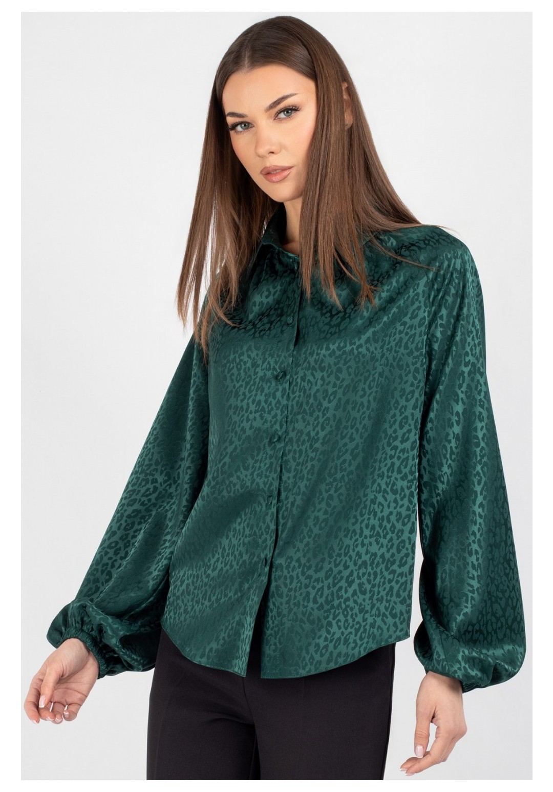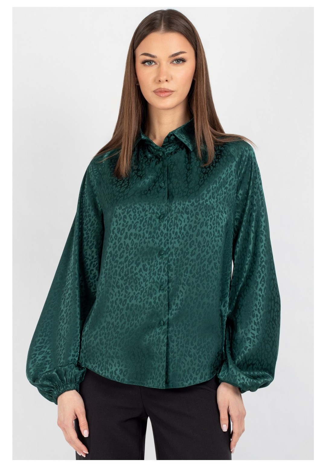 Эта женская блузка полуприлегающего кроя — безупречный союз классической строгости и актуальных трендов. Это воплощение элегантности с характером: модель с центральной застёжкой на пуговицы и классическим рубашечным воротником привлекает внимание не только идеальной посадкой, но и уникальным колоритом. Главный акцент модели — стильный леопардовый принт в благородном исполнении. Глубокий зеленый оттенок фона переливается насыщенными нотками драгоценного изумруда, добавляя образу ноту смелости, актуальности и визуальной роскоши. Продуманный крой подчеркивает достоинства фигуры: мягкий рукав реглан украшен сборкой по низу, а горловина переда дополнена лёгкими объёмными складами. Блузка выполнена из благородной ткани высокого качества (напоминающей плотный шифон, шелк или легкий атлас), которая приятна на ощупь, непрозрачна и практически не мнется, сохраняя безупречный вид в течение всего дня. Эта блузка — универсальный инструмент для создания стильных образов. Благодаря благородному изумрудному цвету и идеальной посадке, вы будете чувствовать себя уверенно в любой ситуации. Уход: бережная стирка при температуре не выше 30°С.