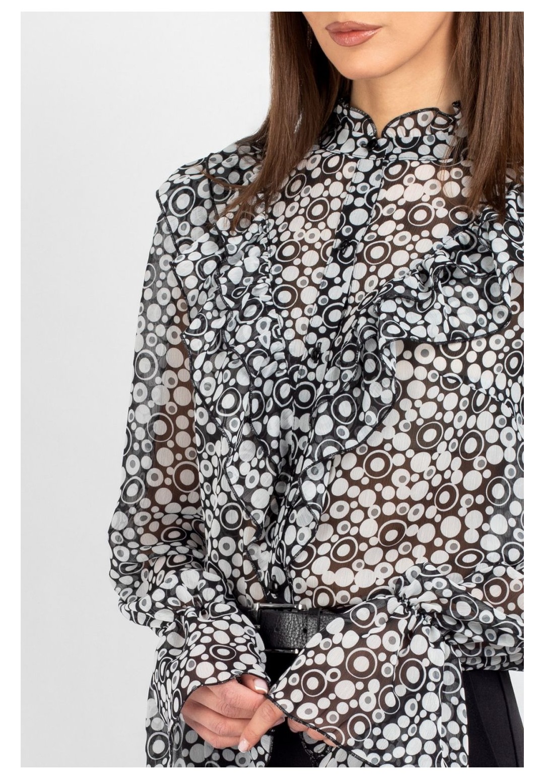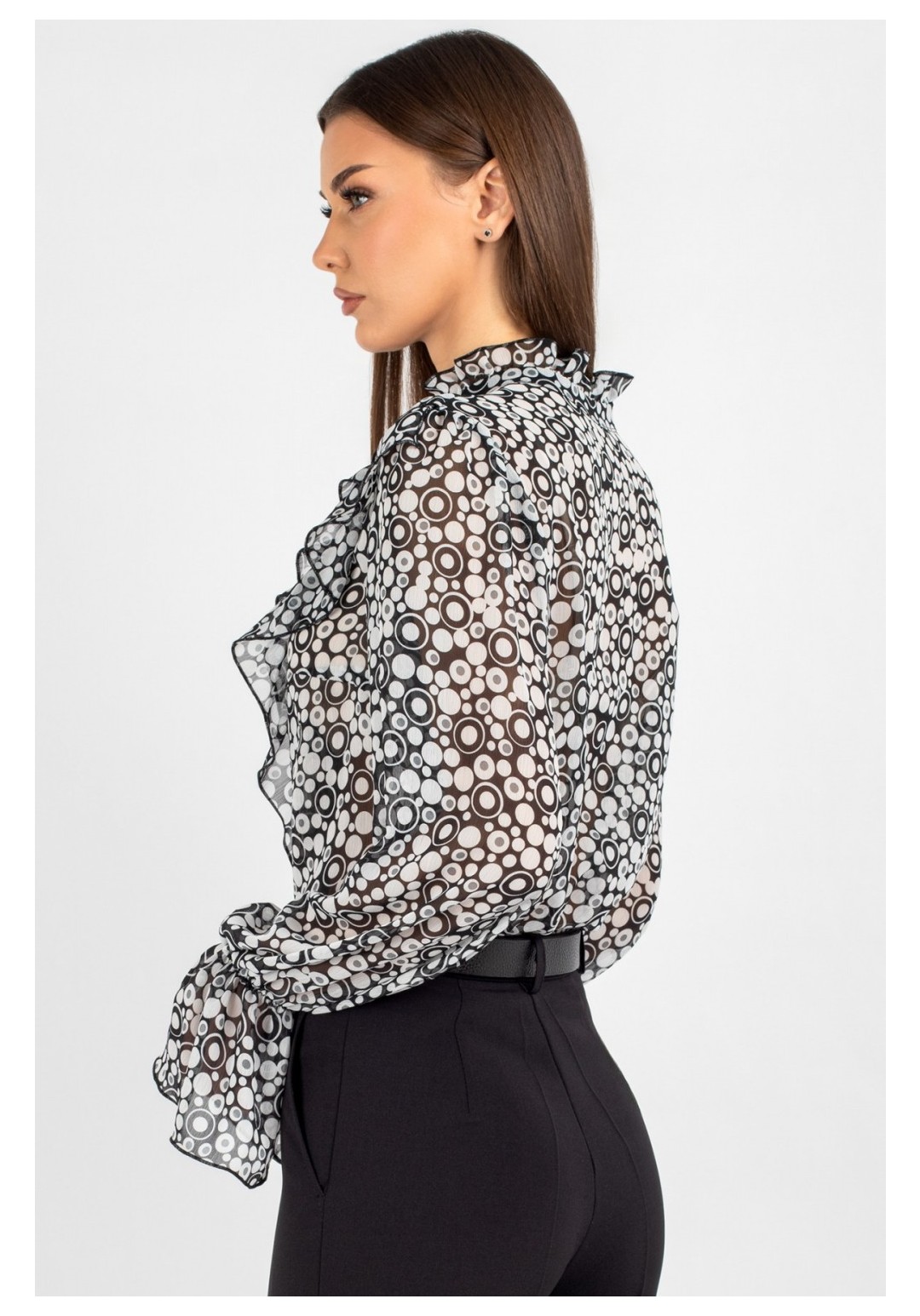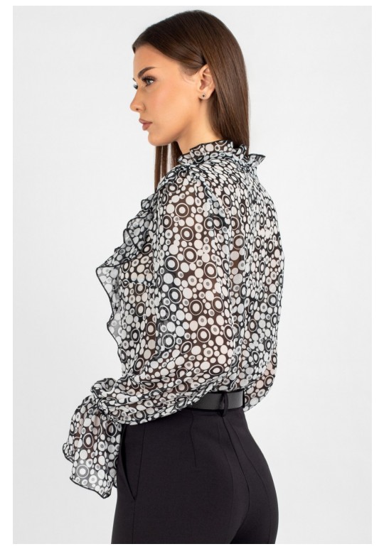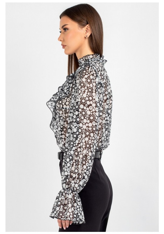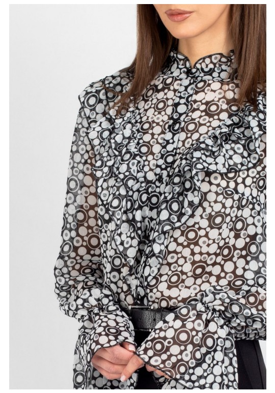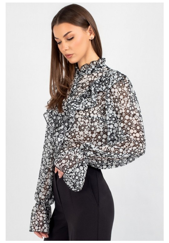 Блузка из лёгкого шифона — идеальное решение для создания как повседневных, так и деловых образов. В современном мире женской моды блузки с принтом остаются неизменно актуальными: они помогают выделиться из толпы, подчеркнуть индивидуальность и добавить яркости даже самому сдержанному гардеробу. Полуприлегающий силуэт этой модели выгодно подчёркивает фигуру, не сковывая движений, — а значит, она подойдёт для самых разных ситуаций: от офисной встречи до вечернего выхода. Шифоновая блузка с принтом — это воплощение лёгкости и женственности. Передняя часть изделия оформлена центральной бортовой застёжкой на 8 петель и пуговиц: это не только обеспечивает удобство ношения, но и придаёт модели классический шарм. Нагрудные выточки и кокетка создают безупречную посадку по фигуре, а вставленные в шов кокетки рюши добавляют романтичности и утончённости. Спинка блузки выполнена цельной. Втачной рукав со сборкой по окату подчёркивает линию плеча и придаёт силуэту мягкость, а присборенная на эластичную тесьму нижняя часть рукава создаёт изящный акцент и обеспечивает комфортную посадку на запястье. Завершает дизайн горловина со стойкой и рюшей — этот элемент делает образ более нарядным. Такая блузка легко комбинируется с разными элементами гардероба: её можно носить с классическими брюками, юбкой‑карандашом или джинсами с высокой талией. Лёгкий шифон приятен к телу, хорошо пропускает воздух и не вызывает дискомфорта в течение дня — идеальный выбор для тёплого сезона. Создавайте неповторимые образы, подчёркивающие Вашу индивидуальность и чувство стиля. Уход: бережная стирка при температуре не выше 30°С.