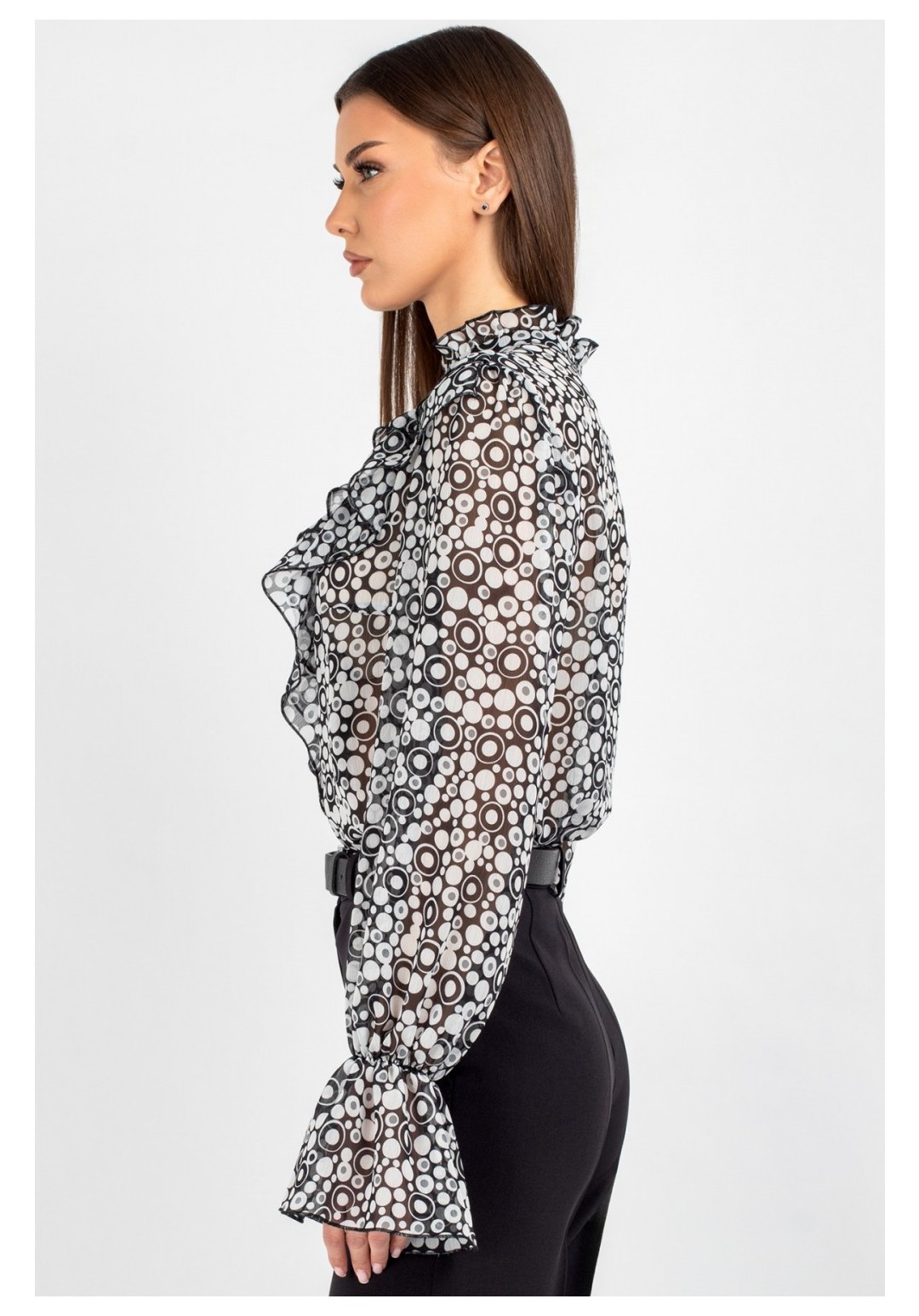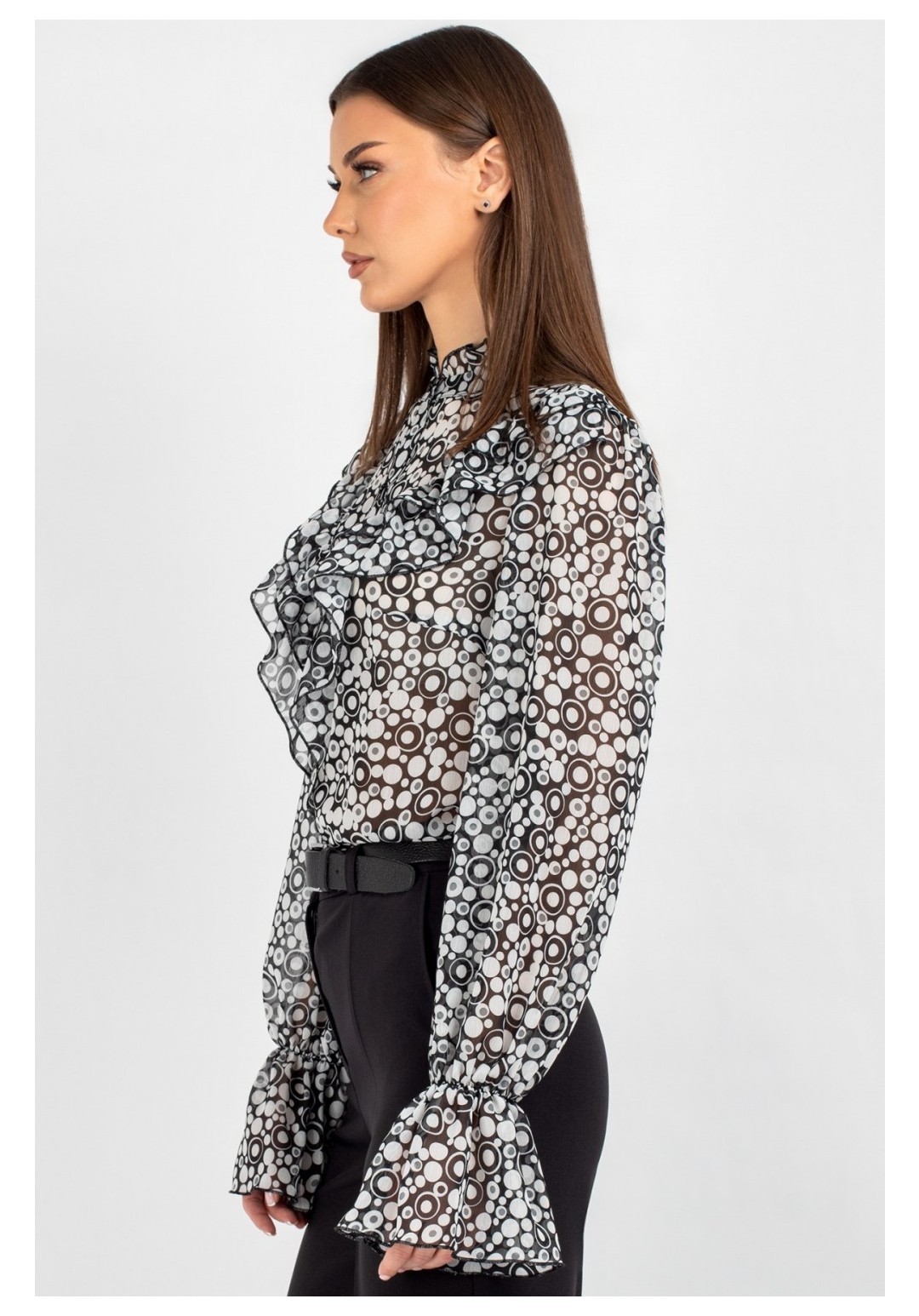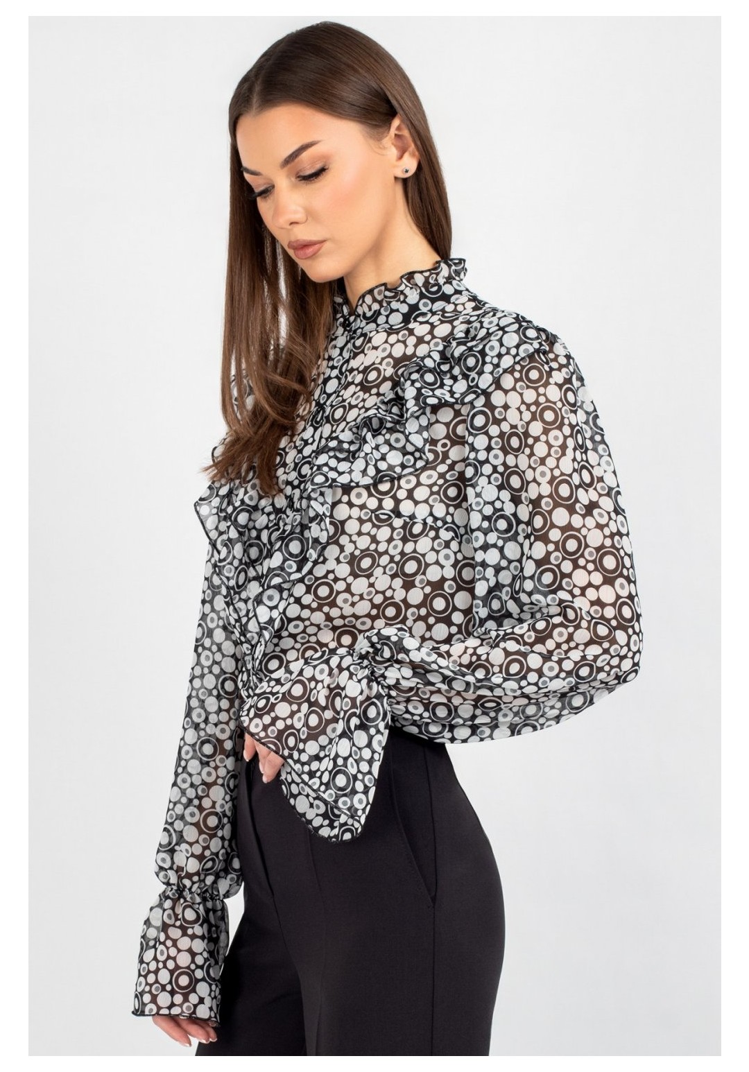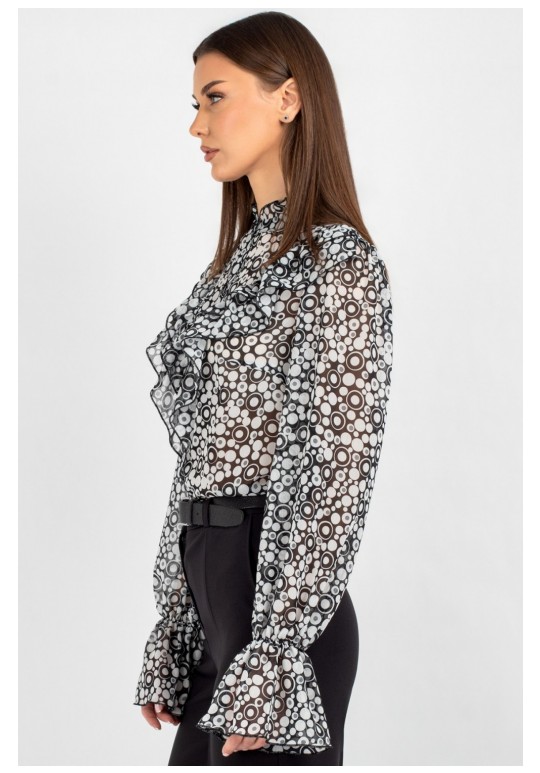 Блузка из лёгкого шифона — идеальное решение для создания как повседневных, так и деловых образов. В современном мире женской моды блузки с принтом остаются неизменно актуальными: они помогают выделиться из толпы, подчеркнуть индивидуальность и добавить яркости даже самому сдержанному гардеробу. Полуприлегающий силуэт этой модели выгодно подчёркивает фигуру, не сковывая движений, — а значит, она подойдёт для самых разных ситуаций: от офисной встречи до вечернего выхода. Шифоновая блузка с принтом — это воплощение лёгкости и женственности. Передняя часть изделия оформлена центральной бортовой застёжкой на 8 петель и пуговиц: это не только обеспечивает удобство ношения, но и придаёт модели классический шарм. Нагрудные выточки и кокетка создают безупречную посадку по фигуре, а вставленные в шов кокетки рюши добавляют романтичности и утончённости. Спинка блузки выполнена цельной. Втачной рукав со сборкой по окату подчёркивает линию плеча и придаёт силуэту мягкость, а присборенная на эластичную тесьму нижняя часть рукава создаёт изящный акцент и обеспечивает комфортную посадку на запястье. Завершает дизайн горловина со стойкой и рюшей — этот элемент делает образ более нарядным. Такая блузка легко комбинируется с разными элементами гардероба: её можно носить с классическими брюками, юбкой‑карандашом или джинсами с высокой талией. Лёгкий шифон приятен к телу, хорошо пропускает воздух и не вызывает дискомфорта в течение дня — идеальный выбор для тёплого сезона. Создавайте неповторимые образы, подчёркивающие Вашу индивидуальность и чувство стиля. Уход: бережная стирка при температуре не выше 30°С.