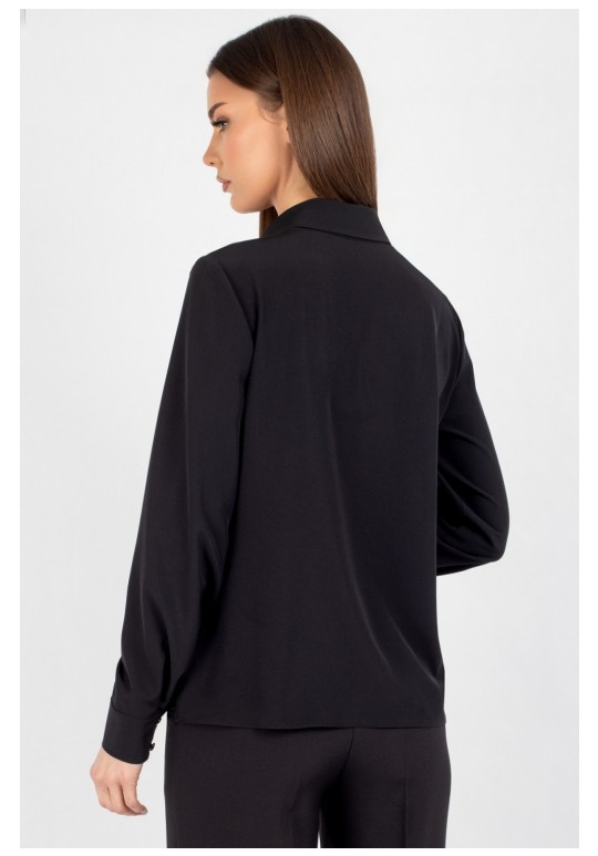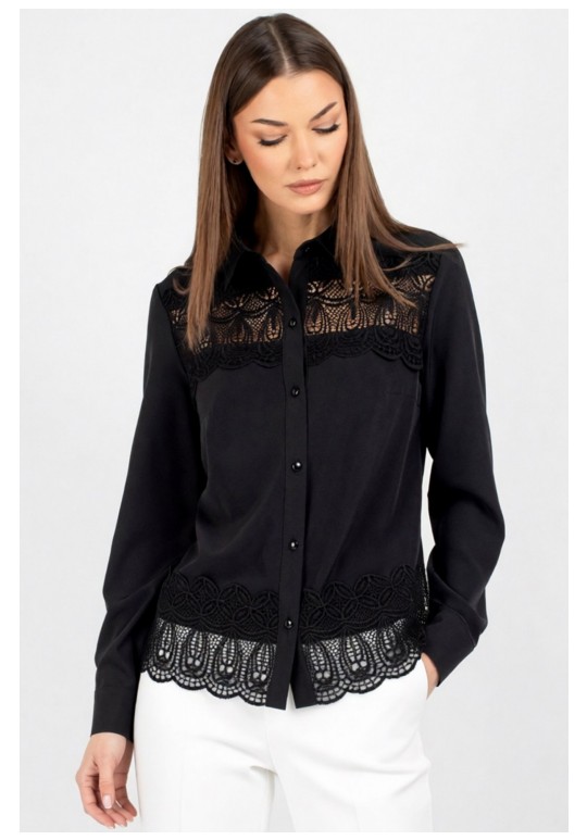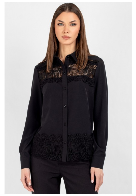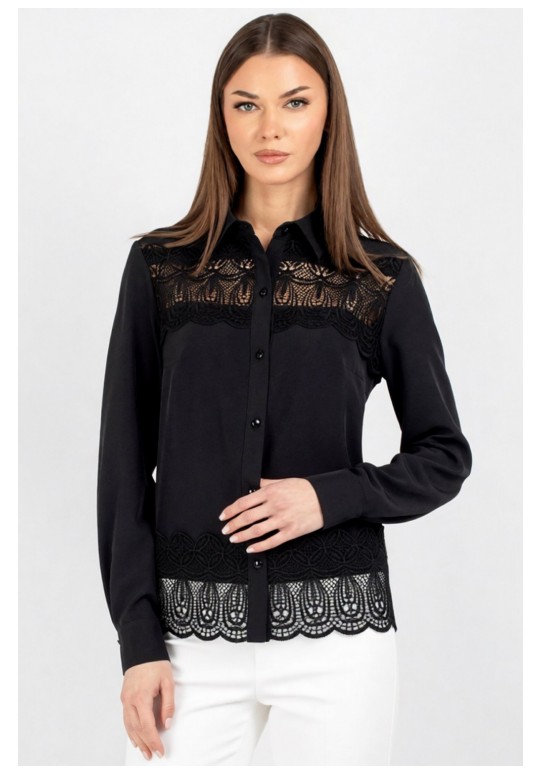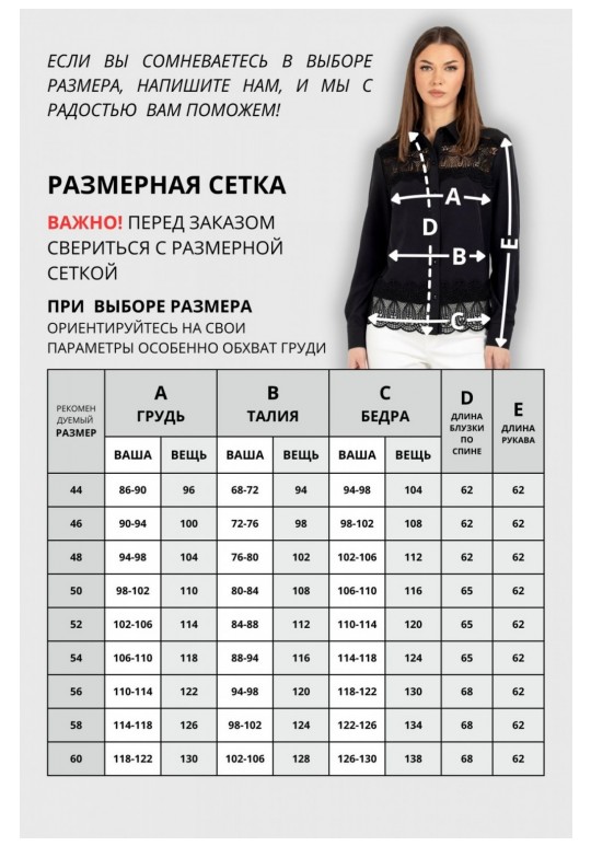 Женская блузка полуприлегающего силуэта, сочетающая строгость кроя с изысканными акцентами. Передняя часть c нагрудными выточками, обеспечивающими комфортную посадку. Центральная бортовая застёжка — на 6 или 7 пуговиц (в зависимости от размера), придаёт образу классическую завершённость. Особое внимание привлекает кружево, изящно нашитое в верхней и нижней части переда — оно добавляет лёгкости и утончённости, делая блузку особенно женственной. Спинка цельнокроеная, без дополнительных швов, что подчёркивает чистоту силуэта. Рукава втачные, с элегантной линией плеча. Низ рукава оформлен притачной манжетой, застёгивающейся на две пуговицы — аккуратный акцент, подчёркивающий запястья и гармонирующий с кружевными деталями. Воротник рубашечного типа с отрезной стойкой — строгий, но изящный элемент, который придаёт изделию архитектурную чёткость и завершённость. Его форма удачно балансирует между классикой и романтичным стилем. Уход: бережная стирка при температуре не выше 30°С.