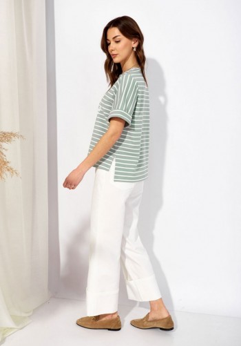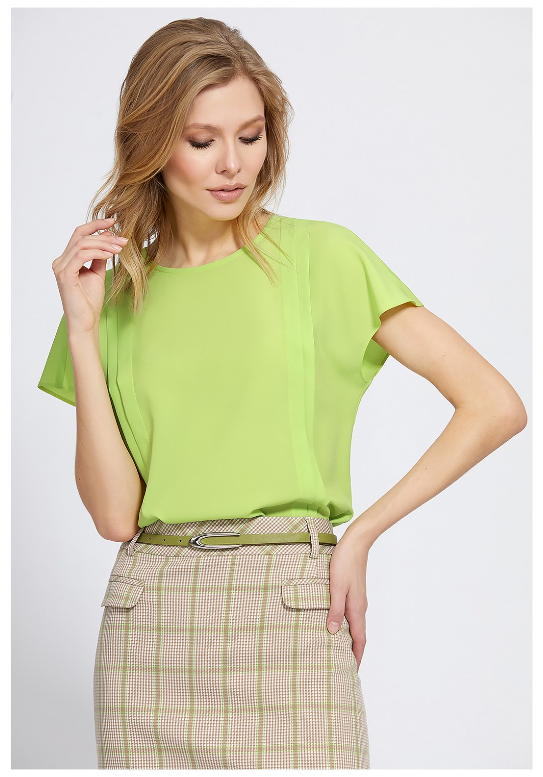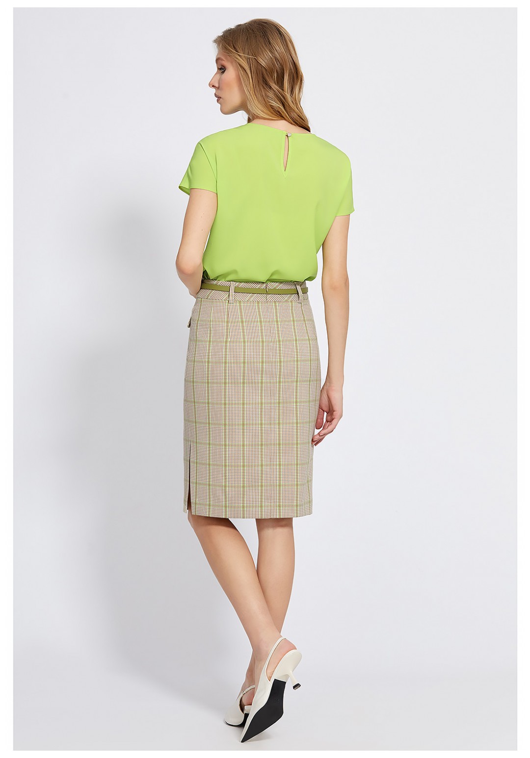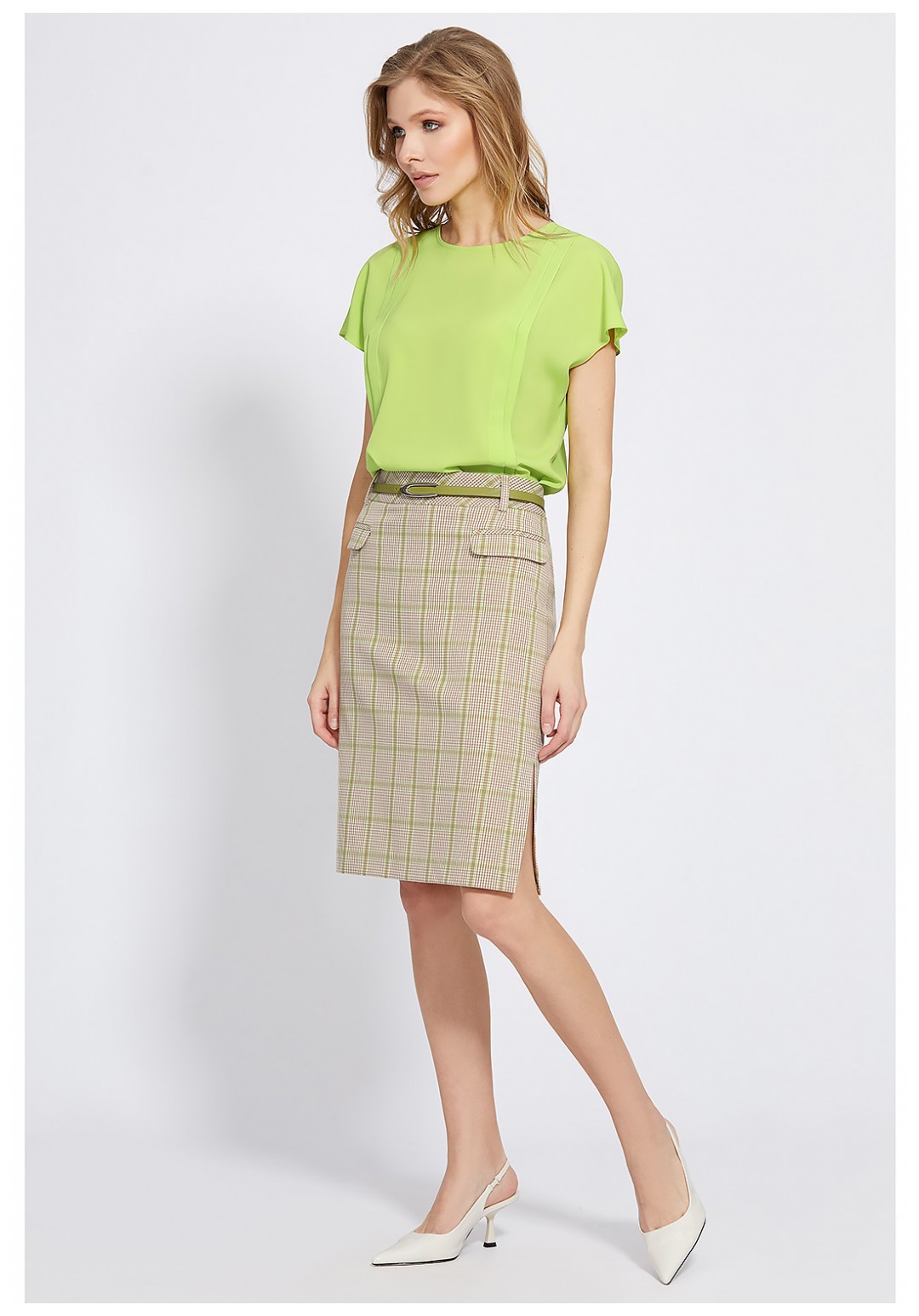 Элегантная юбка-карандаш правильной длины удачно впишется в офисный гардероб. Для пошива модели использовали мягкую ткань с добавлением вискозы с интересным сочетанием мелкой «гусиной лапки» с яркой клеткой. Юбка с интересно й задумкой игры клетки на поясе и рамках карманов. Спереди с карманами-обманками с аккуратными клапанами, в среднем шве спинки обработана застёжка на потайную молнию, левый боковой шов заканчивается разрезом. На подкладке. Завершает модель пояс-ремень с пряжкой.