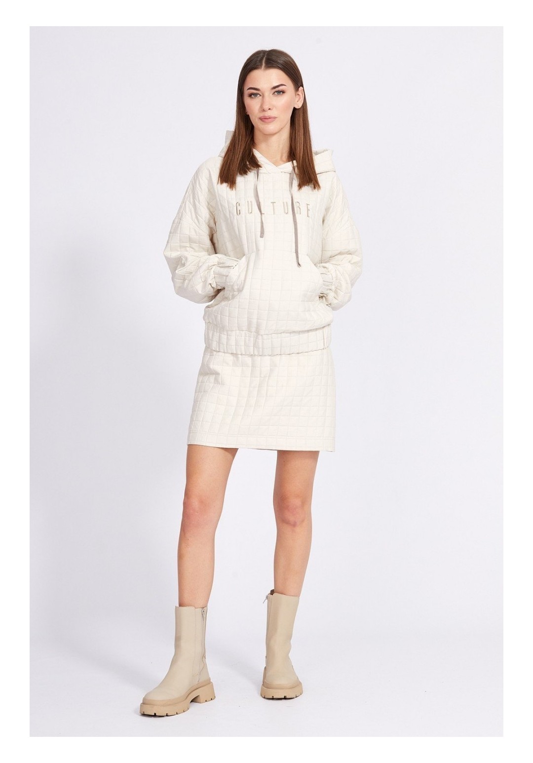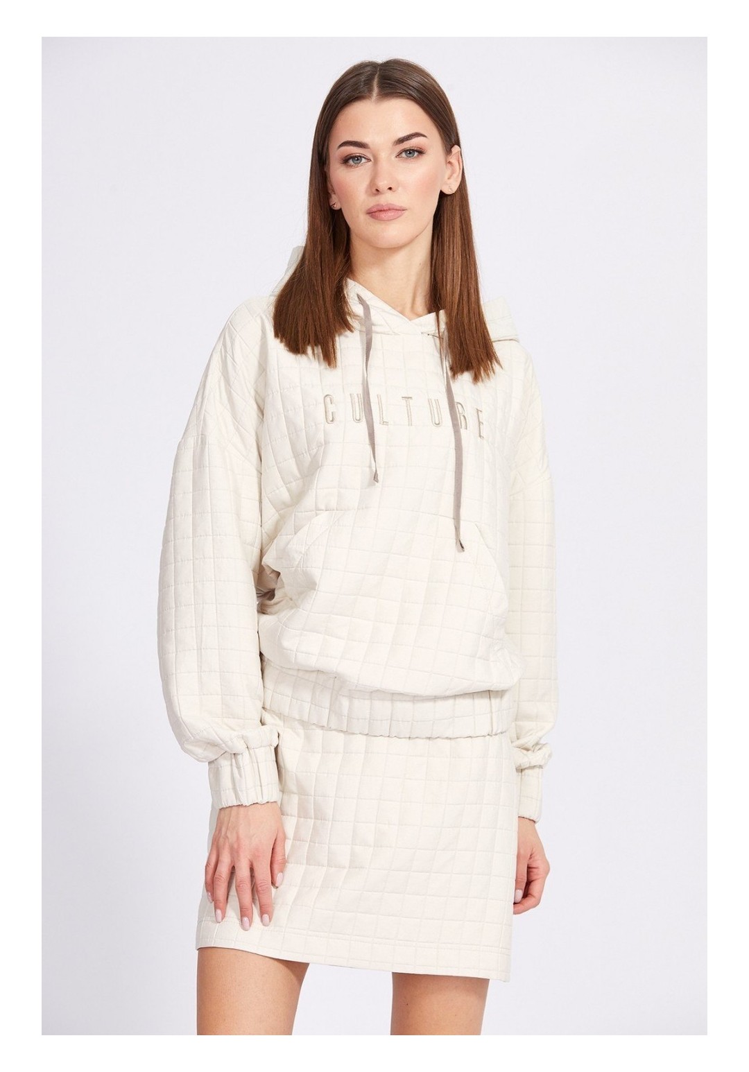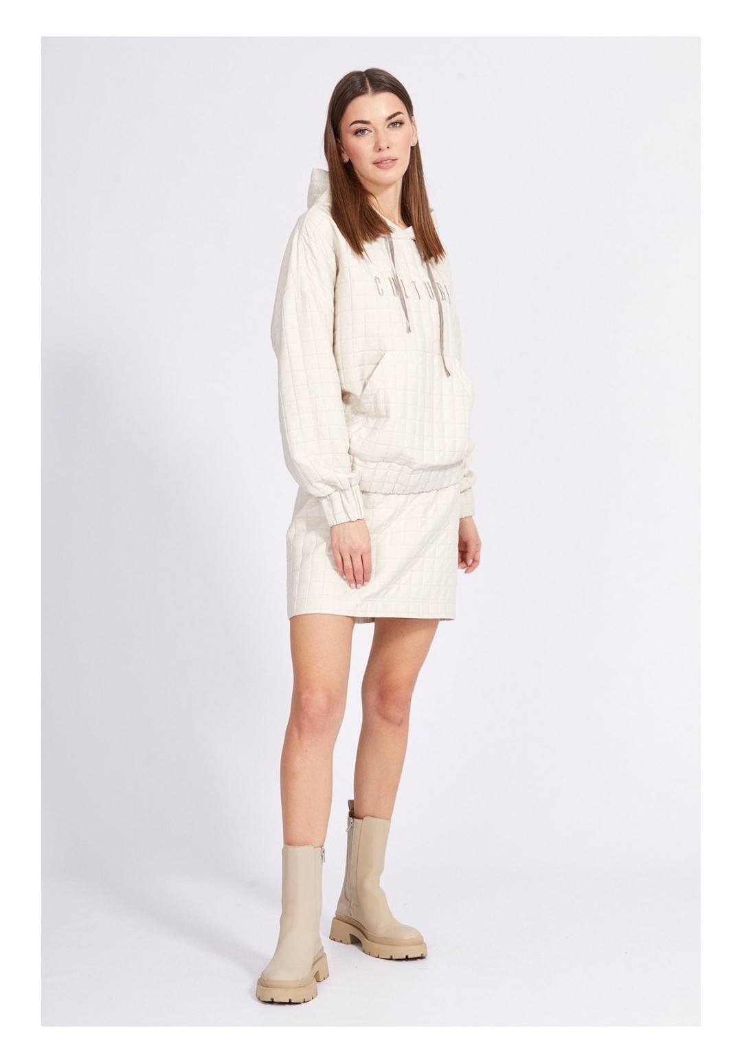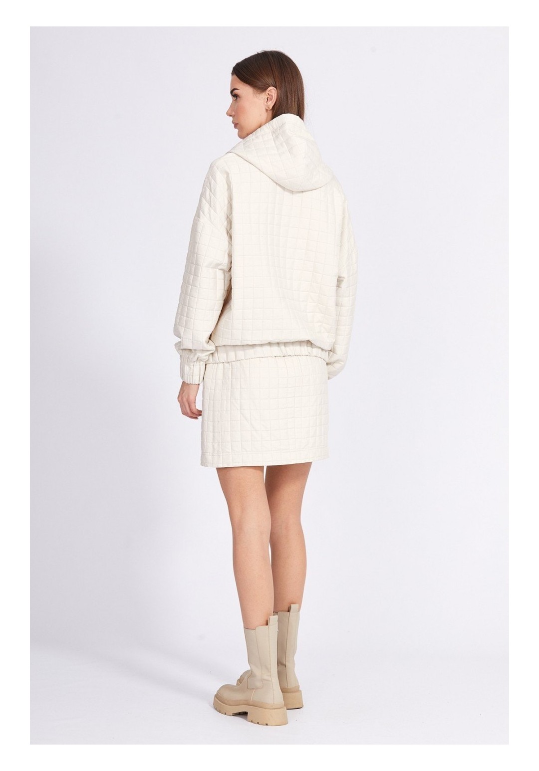 Юбка выполнена из костюмно-плательной ткани, имитирующей стежку. Юбка на притачном поясе, прямого силуэта, длиной выше линии колена. Застежка сзади в среднем шве на потайную молнию и пуговицу. В р.50-54 есть разрез сзади в среднем шве. Юбка на отлетной по низу подкладке. Длина юбки по центру спинки: р.42-46 - 46 см, р.48-52 - 50 см. Гарантийный срок не установлен. Гост 25294-2003