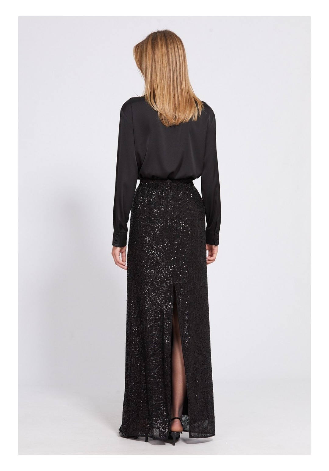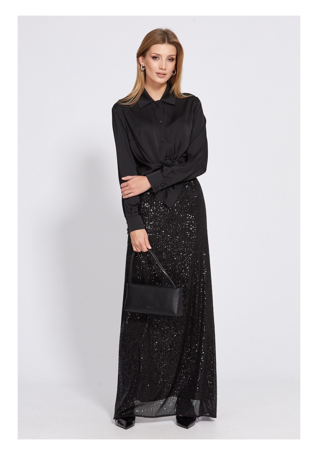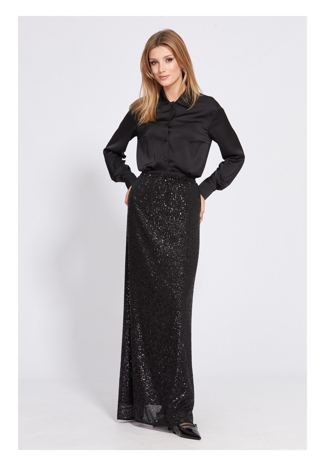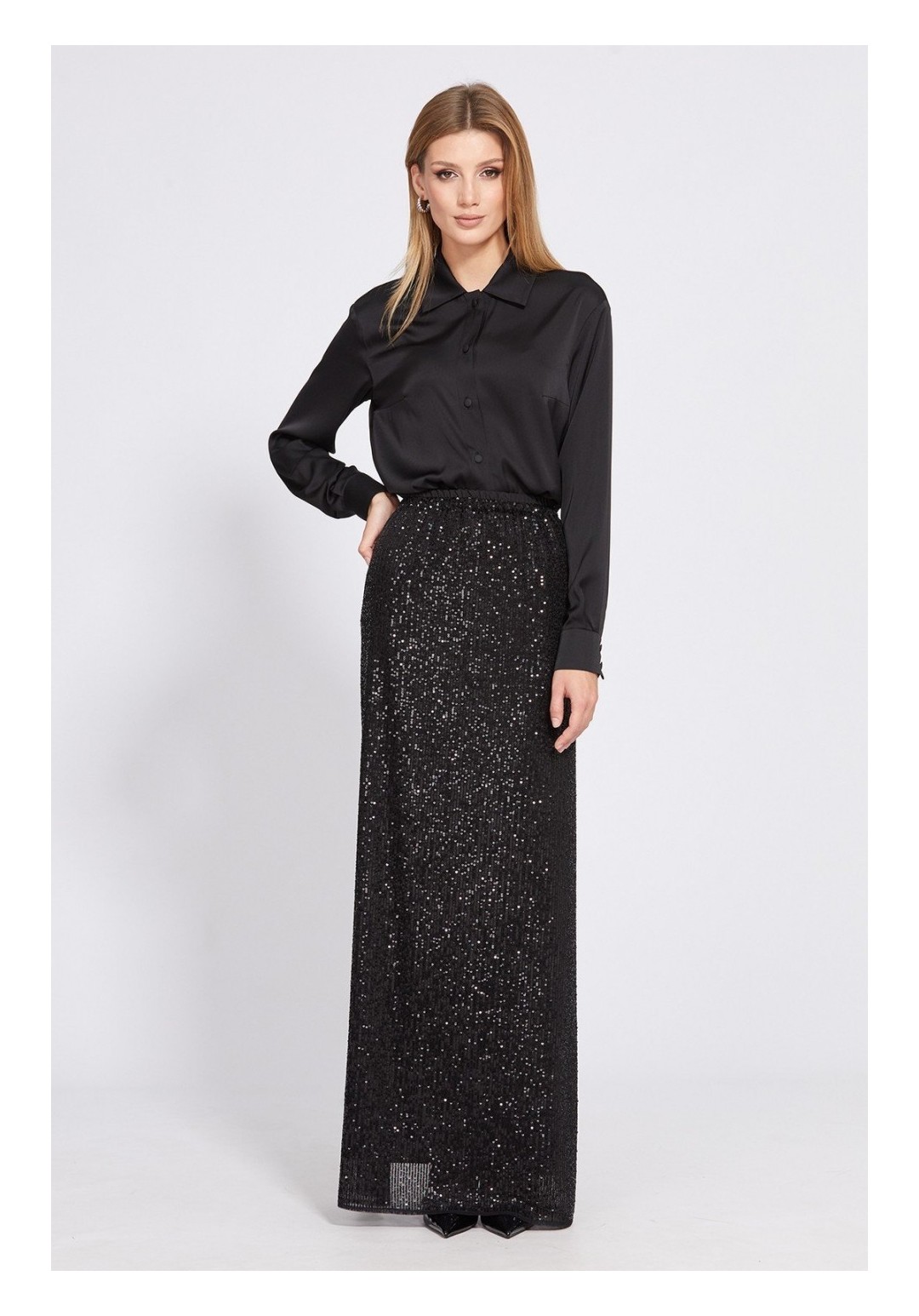 Юбка прямого силуэта, длиной в пол, из трикотажного полотна с пайетками. Сзади в среднем шве шлица. Юбка на отлетной по низу подкладке. Верх юбки на цельнокроенном поясе с эластичной тесьмой. Длина юбки: 44-48 - 114 см. 50-54 -115 см. Гарантийный срок не установлен. ГОСТ 31409-2009