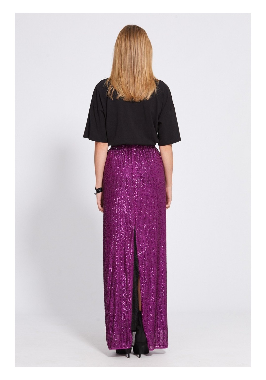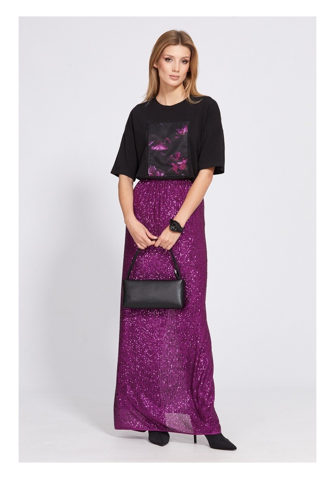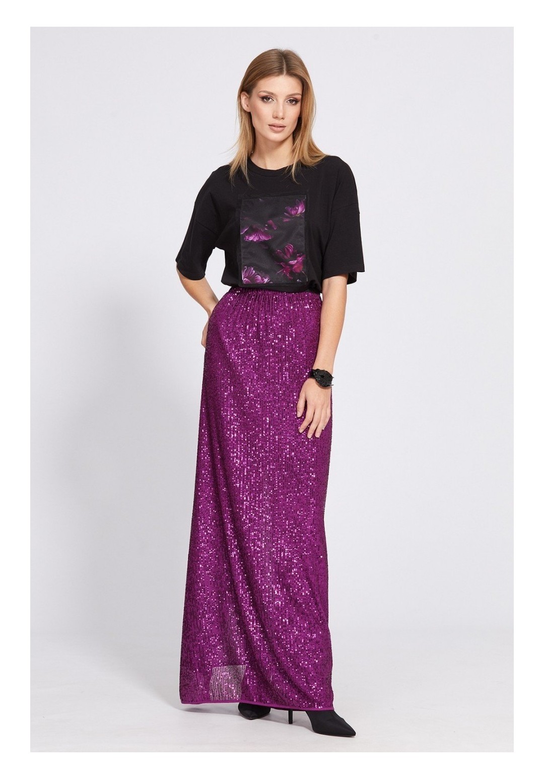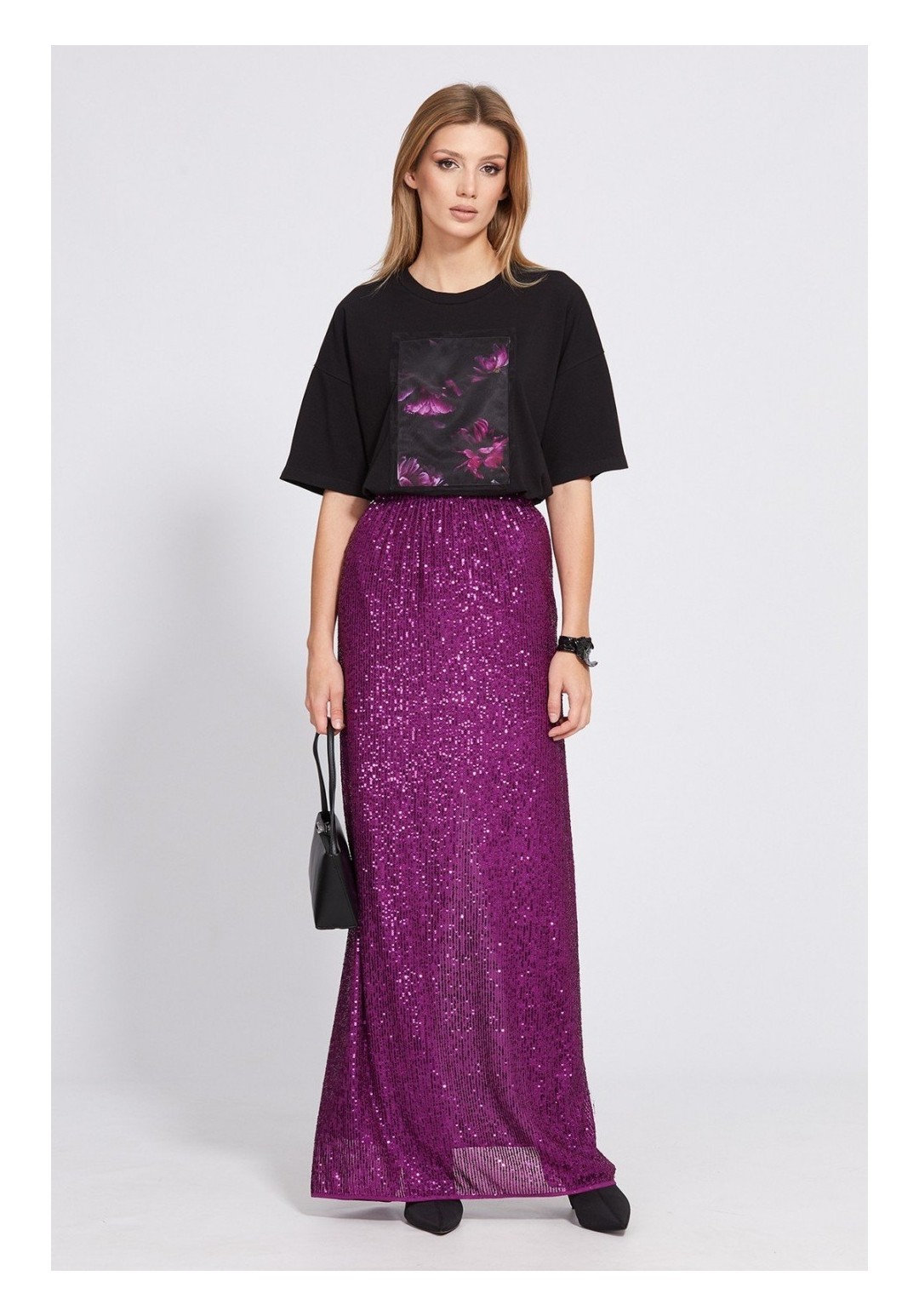 Юбка прямого силуэта, длиной в пол, из трикотажного полотна с пайетками. Сзади в среднем шве шлица. Юбка на отлетной по низу подкладке. Верх юбки на цельнокроенном поясе с эластичной тесьмой. Длина юбки: 44-48 - 114 см. 50-54 -115 см. Гарантийный срок не установлен. ГОСТ 31409-2009