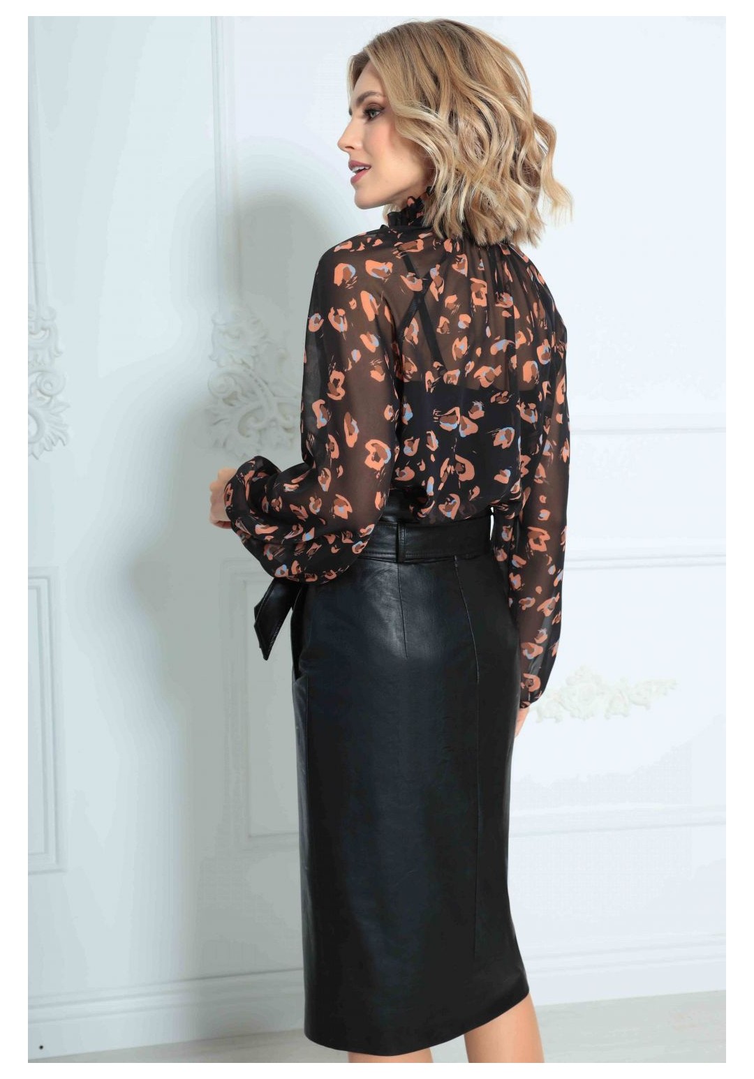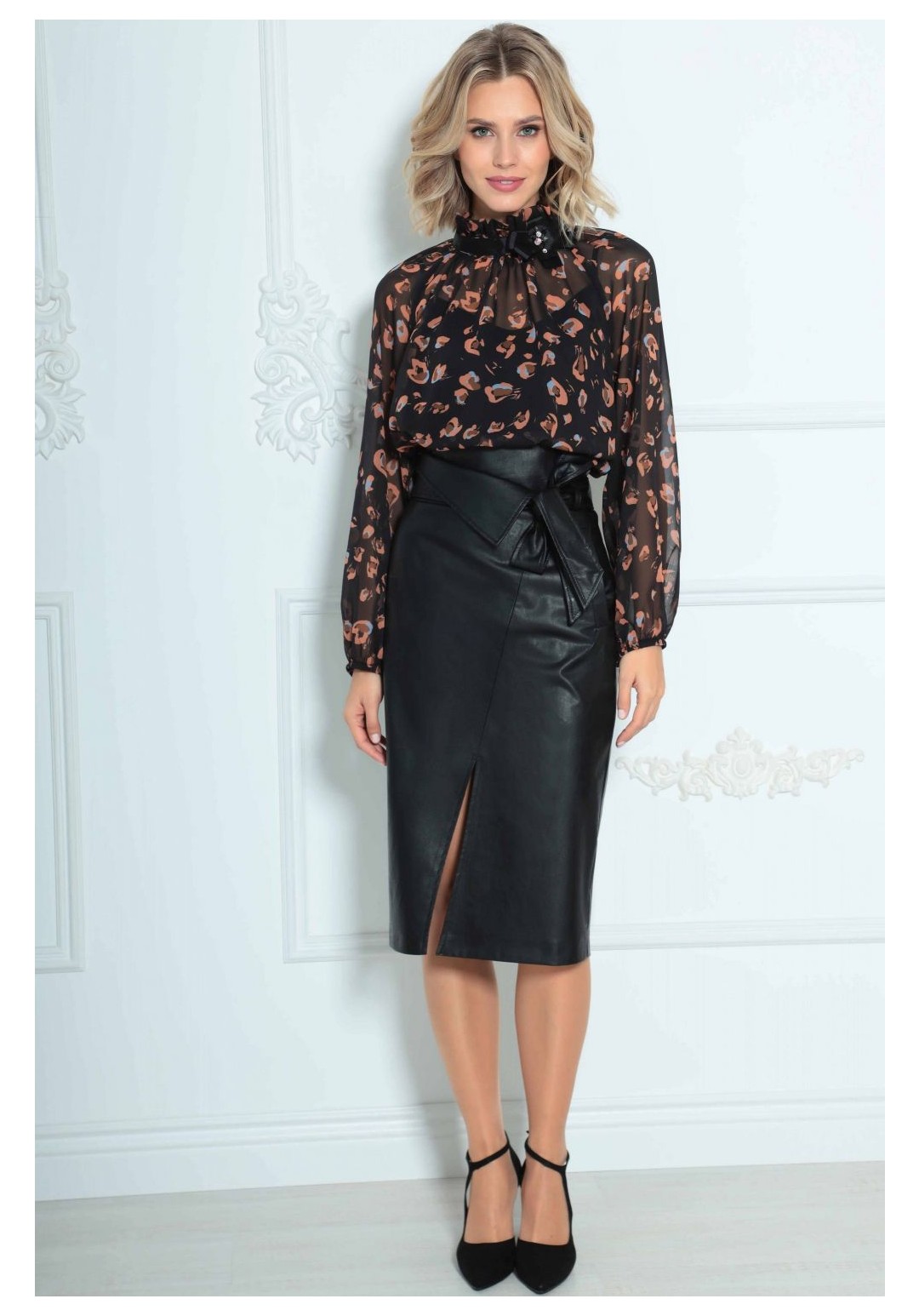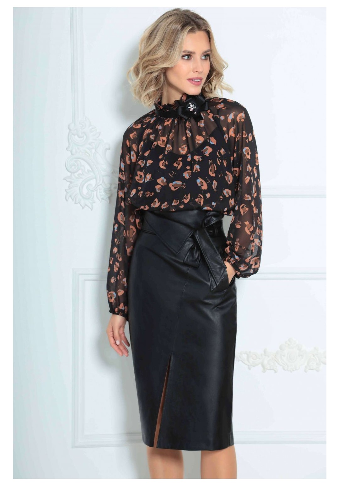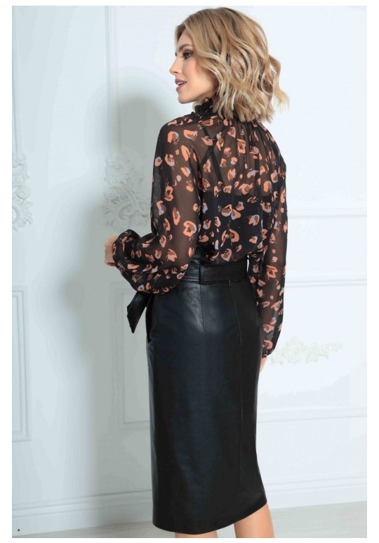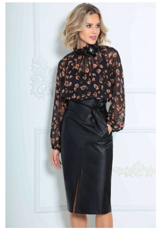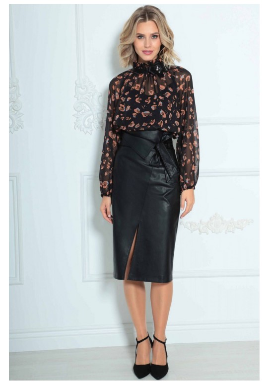 Юбка женская из кожи на подкладке, длиной ниже колена с завышенной линией талии. По переднему полотнищу функциональные прорезные карманы с листачкой, наклонным подрезом и разрезом в нем. По заднему полотнищу средний шов и вытачки. Юбка на притачном поясе со шлевками и декоративным отворотом. В комплект входит съемный пояс из основной ткани.