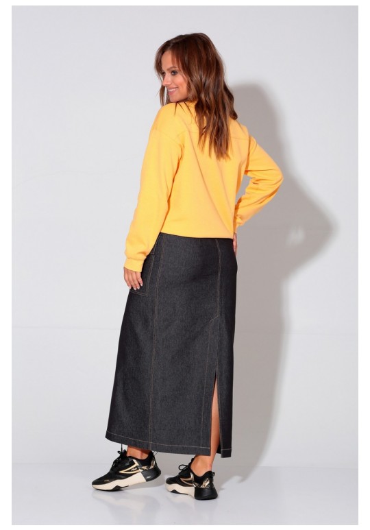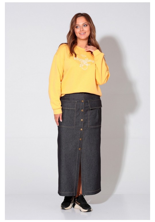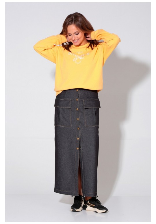 Юбка выполнена из хлопкового джинсы. Юбка прямого силуэта, слегка зауженная книзу, по переду накладные карманы с клапаном, центральная застёжка на кнопки. Заднее полотнище со шлицей и таллиевыми вытачками.