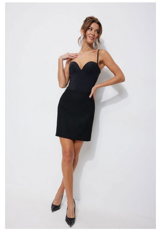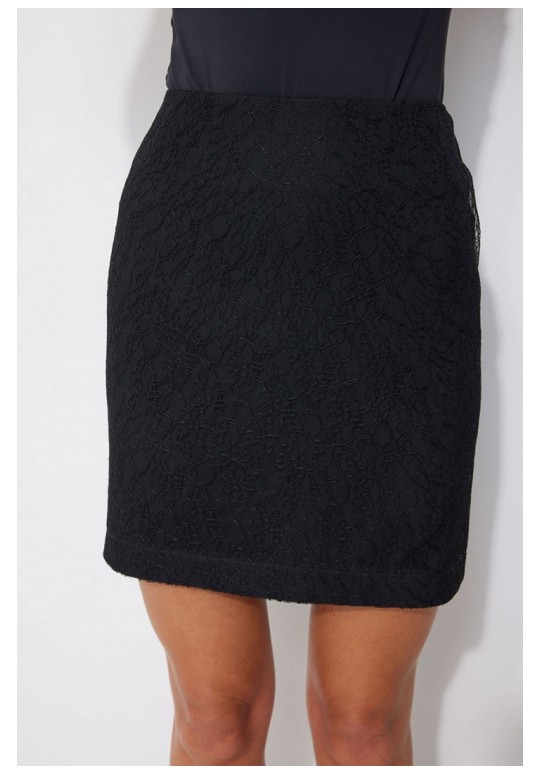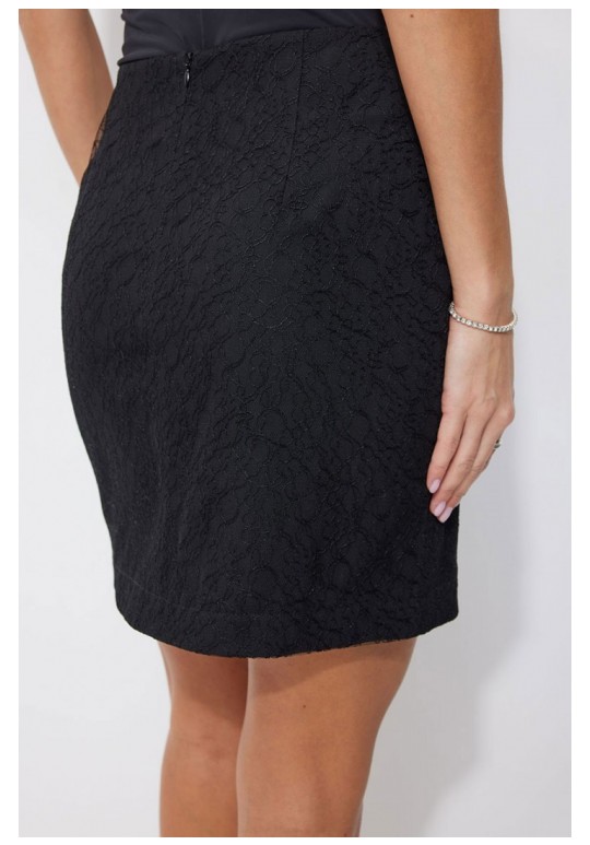 Нарядная мини-юбка. Верхний слой юбки выполнен из кружевной ткани. Нижний слой юбки - плотная струящаяся ткань. С потайной молнией в среднем шве заднего полотнища.