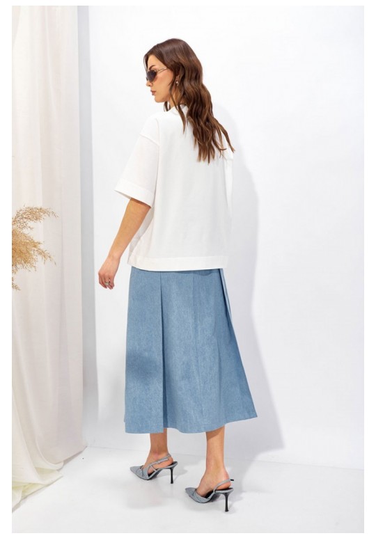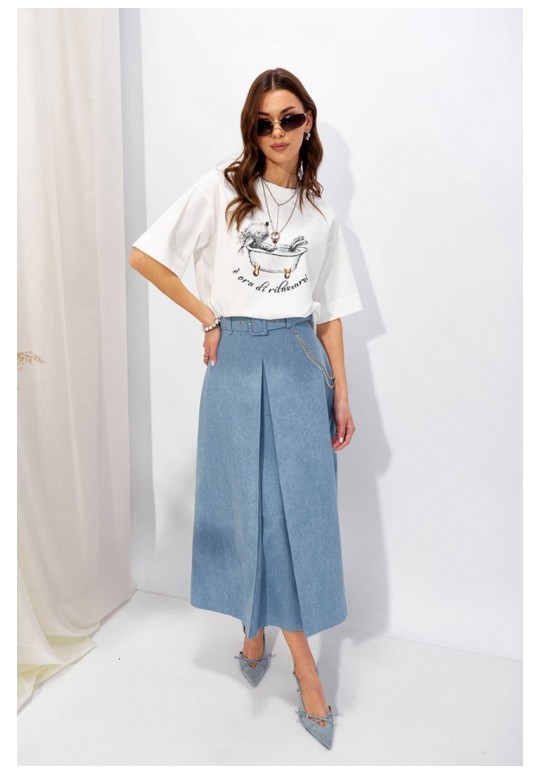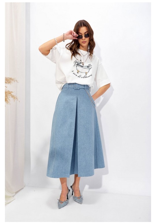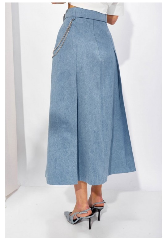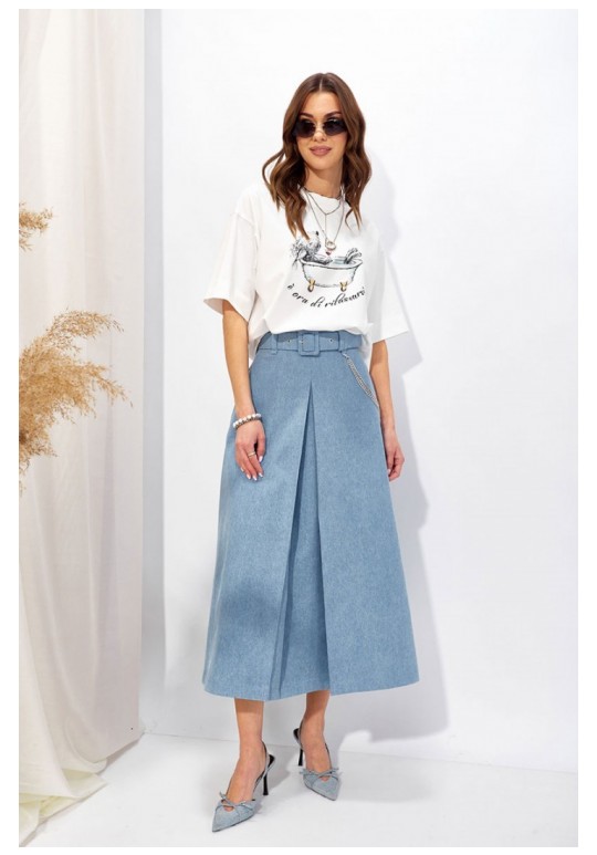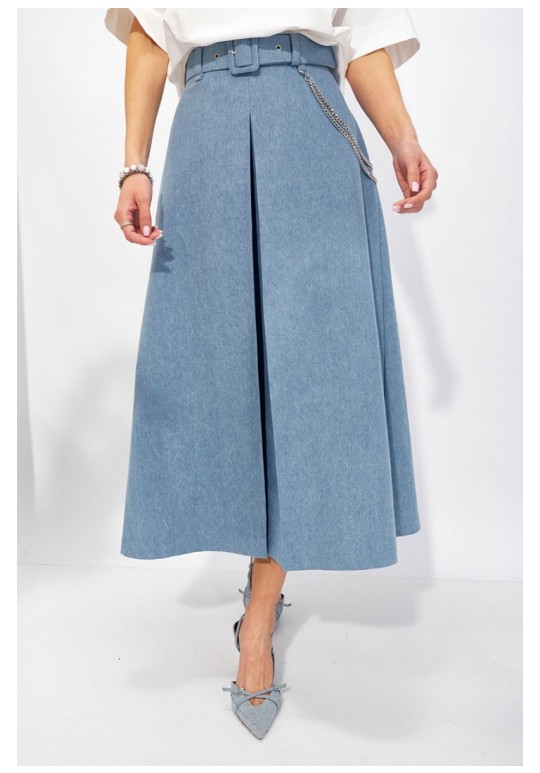 Юбка расширенная книзу из джинсовой ткани. По верху юбки притачной пояс со шлевками для ремня, на спинке застежка на потайную молнию. По переду и спинке складки. В боковых швах карманы. На спинке в среднем шве потайная молния. В комплект входит съемный ремень. Обращаем ваше внимание, что фурнитура может отличаться от фото. Длина юбки 85 см +4,5 см пояс.