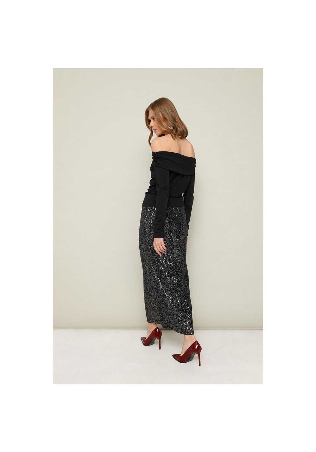 Юбка, декорированная пайетками, на подкладке. Пояс на резинке, хорошо тянется. Юбка прямого полуприлегающего силуэта.