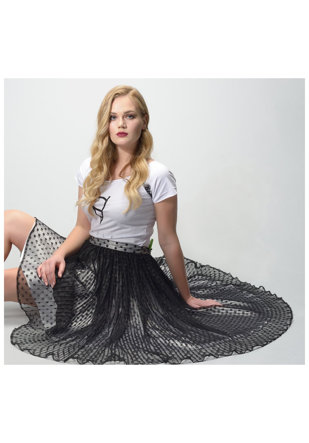 Юбка двойная. Подклад - атлас, верх - вуаль в горошек. На поясе.