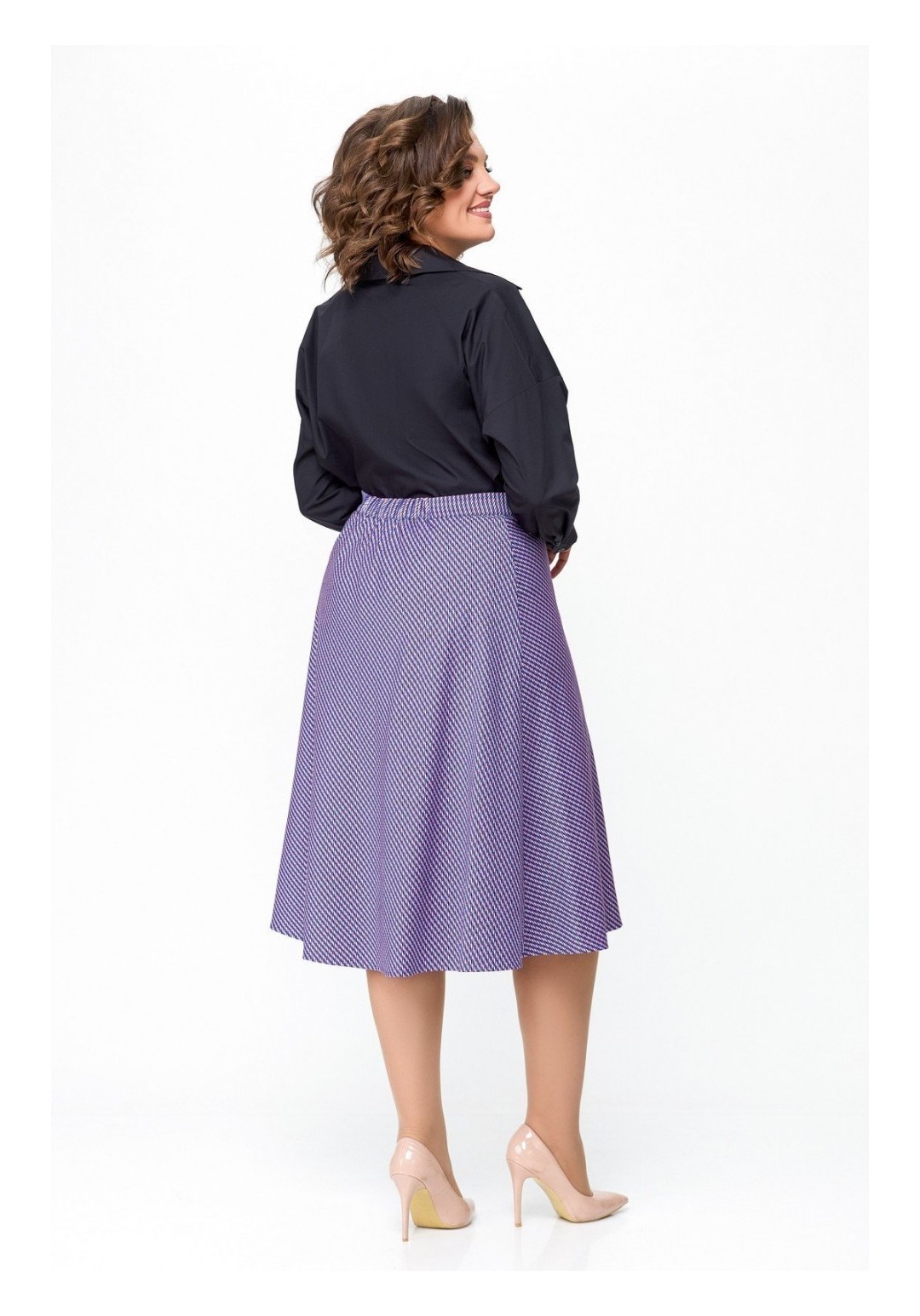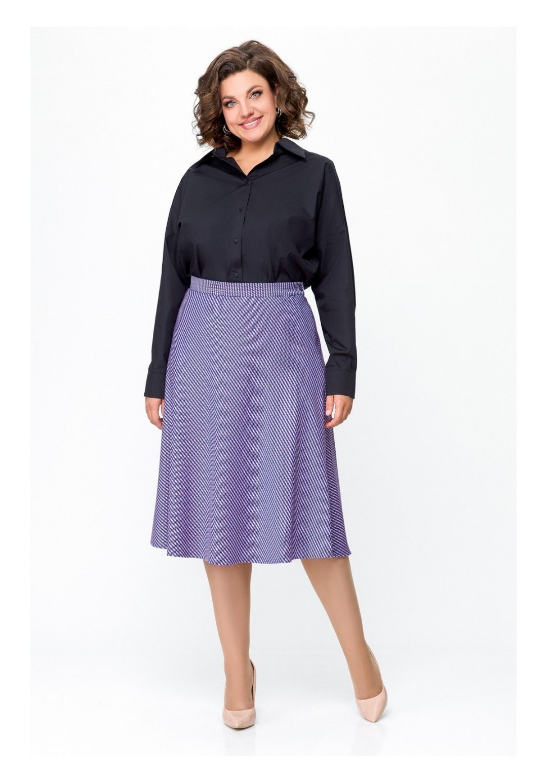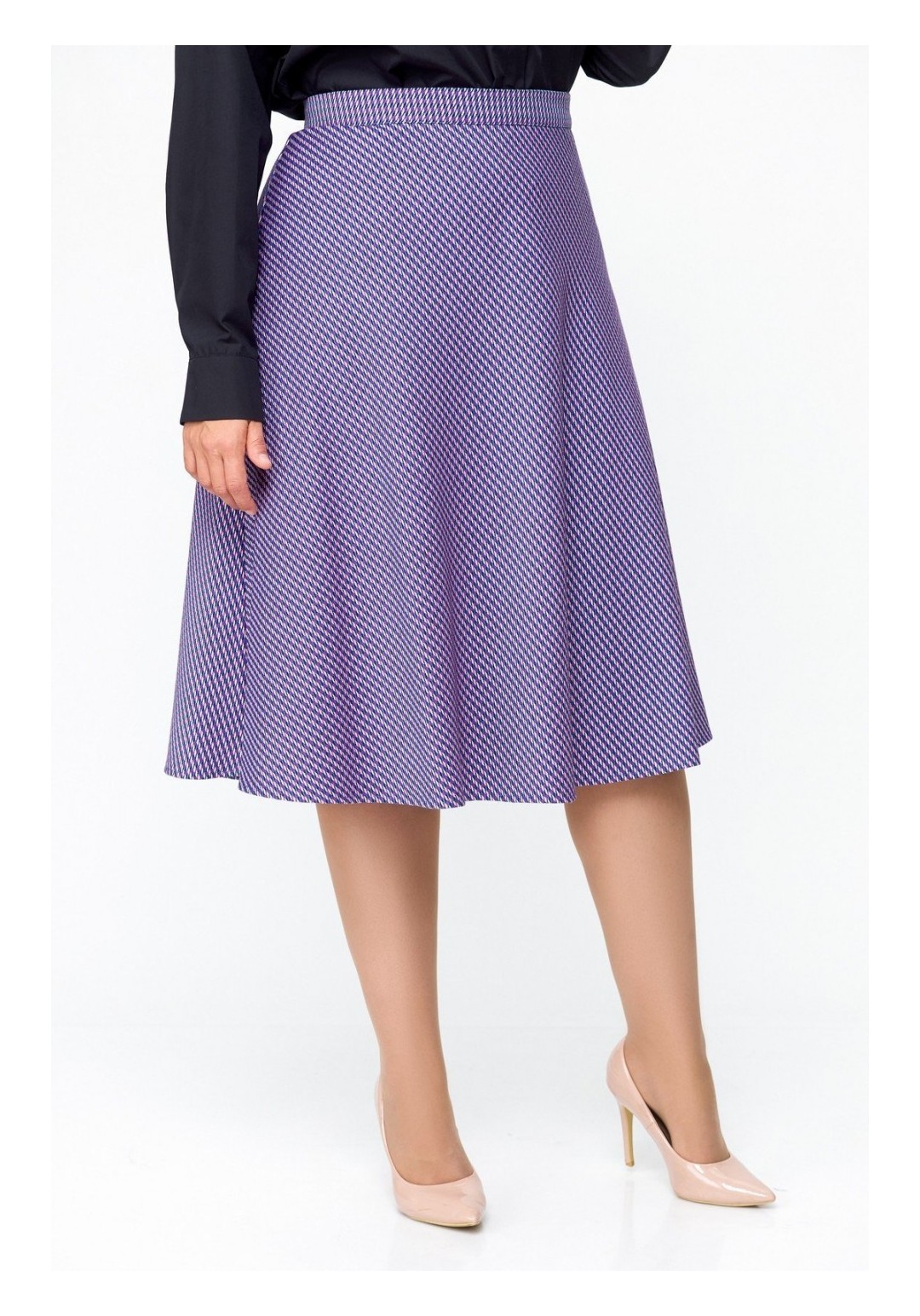 Юбка А-силуэта, длиной миди. Юбка выполнена из поливискозной ткани на эластичной подкладке. Перед и спинка юбки цельнокроеные. В боковой шов вставлена потайная молния. Верх юбки обработан притачным поясом, который застёгивается на пробивную петлю и декоративную пуговицу. По центру задней части пояса вставлена эластичная тесьма. Длина юбки по боковому шву 70 см (+/-1см). Рост модели на фото 170 см Цвет изделия может отличаться по тону в зависимости от настроек вашего монитора.