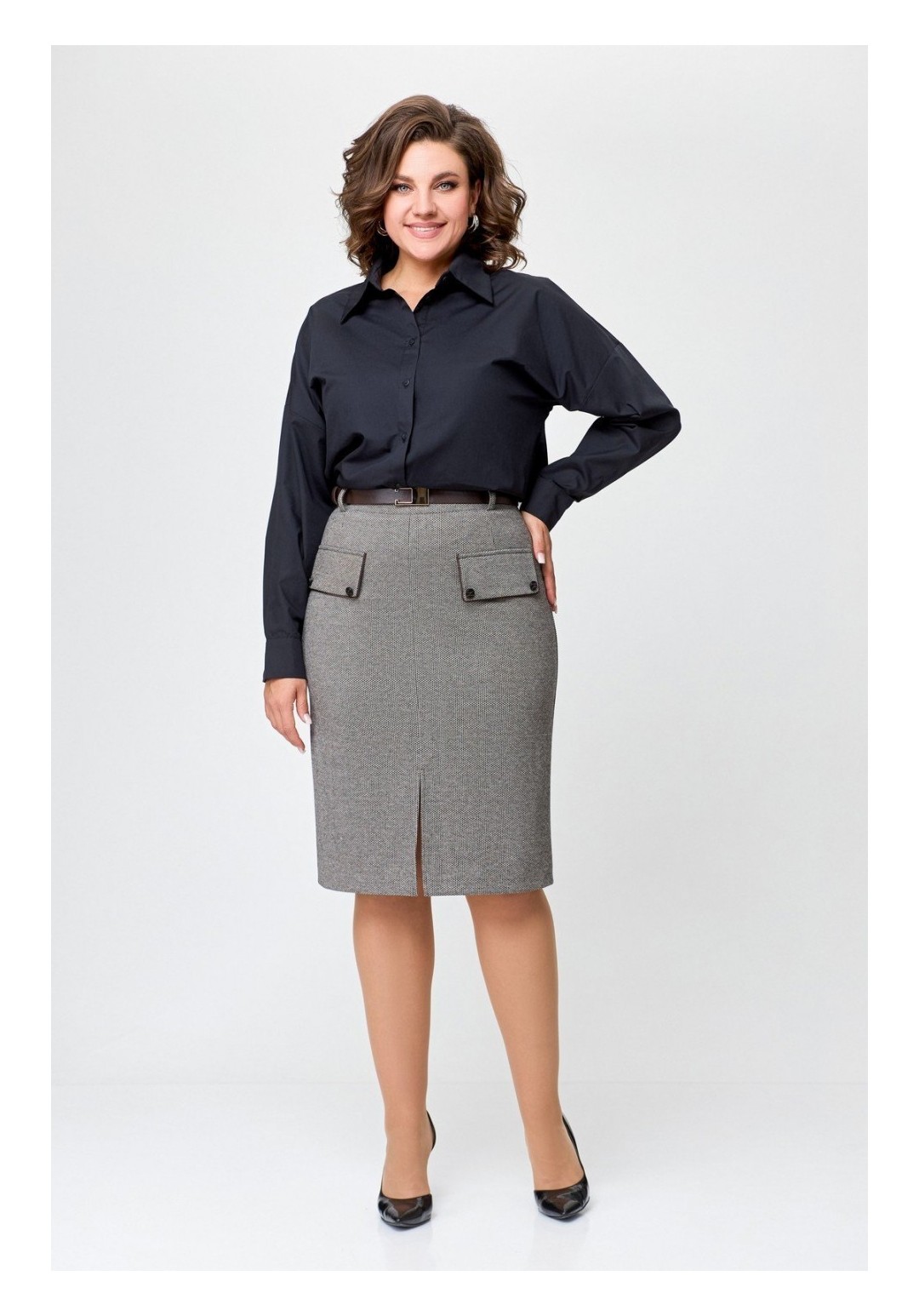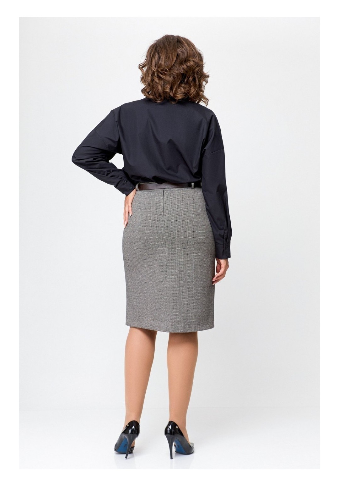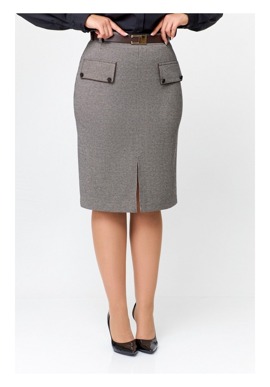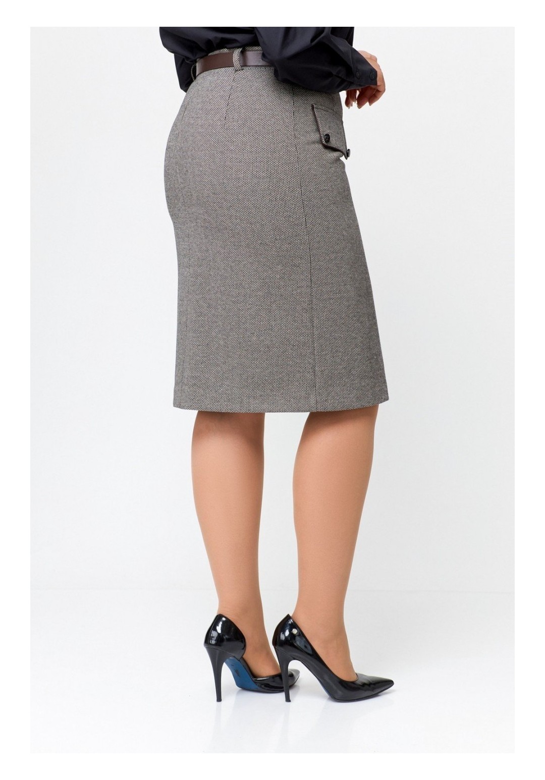 Юбка полуприлегающего силуэта на подкладке. Выполнена из мягкого трикотажного полотна. Юбка со средним швом по переду и спинке. В средний шве спинки обработана потайная молния. По низу среднего шва переда находится разрез. По переду в области бёдер расположены настрочные клапаны с кантом, на которые пришиты декоративные пуговицы. По переднему и заднему полотнищу юбки - талиевые вытачки. Верх юбки обработан притачным поясом, в который закреплены шлёвки для декоративного ремня, который входит в комплект. Ширина ремня 2,5см. Длина юбки по боковому шву в 52,54,56 размерах 65 см (+/-1см). Длина юбки по боковому шву в 58,60,62 размерах 67см (+/-1см). Данная модель юбки прекрасно сочетается с джемпером Модель 635.
