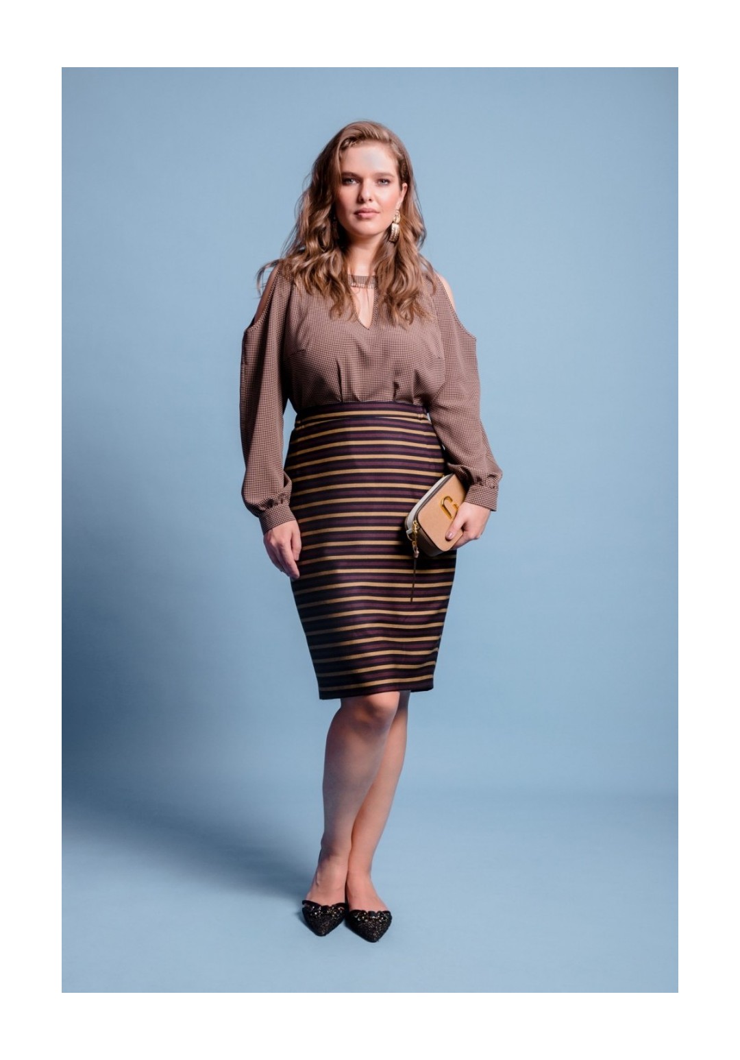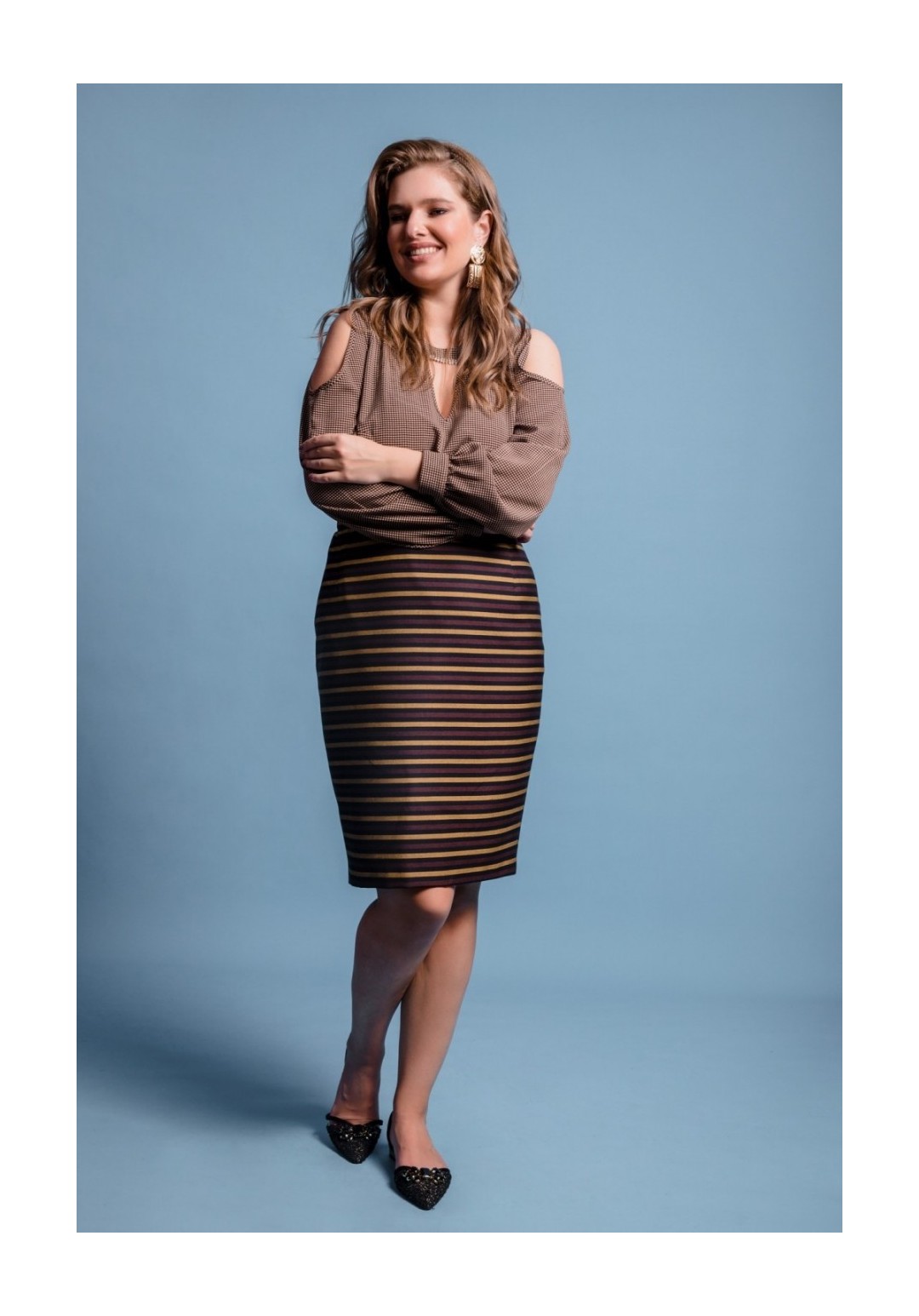 Юбка выполнена из костюмной ткани, на подкладке. Застёжка на потайную тесьму-молнию в среднем шве спинки, по низу шлица 22 см. По верхнему срезу пояс 3,5 см, по боковым вставлена резинка 19 см. Длина юбки - 67 см. Измерения по готовому изделию 54 р: ОТ 90 см, резинка растягивается до 98 см, ОБ 118 см, 56 р: ОТ 94 см, резинка растягивается до 100 см, ОБ 122 см, 58 р: ОТ 96 см, резинка растягивается до 104 см, ОБ 126 см.