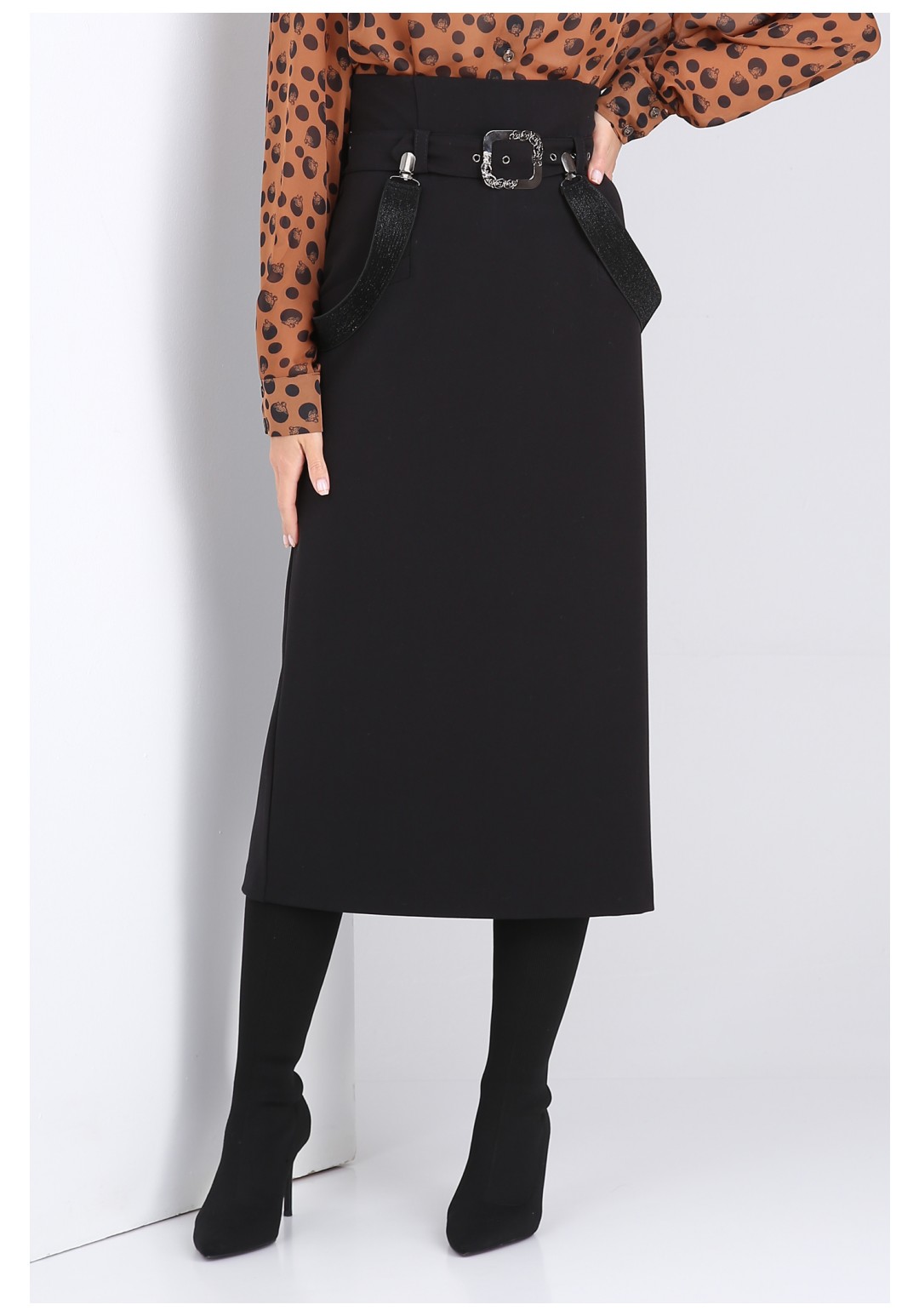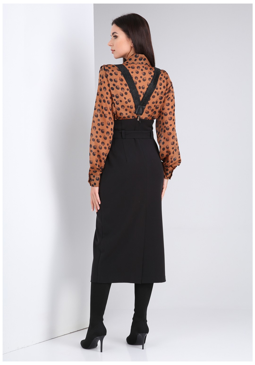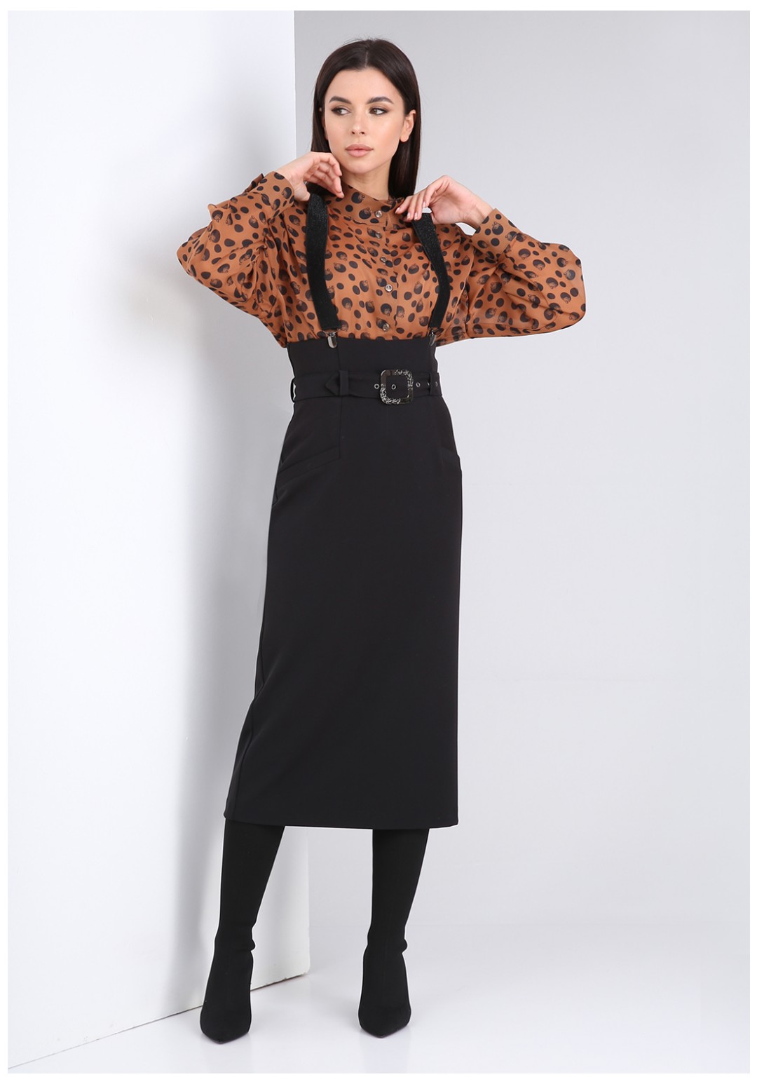Стильная и очень эффектная юбка полуприлегающего силуэта. Завышенная линия талии, акцентный пояс из основной ткани, имитация карманов спереди, сзади шлица, на подкладке. Застежка на молнию в заднем шве. Юбка дополнена трендовыми подтяжками. Длина изделия - 88 см.