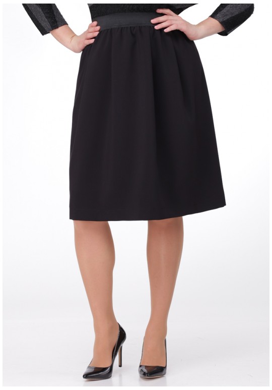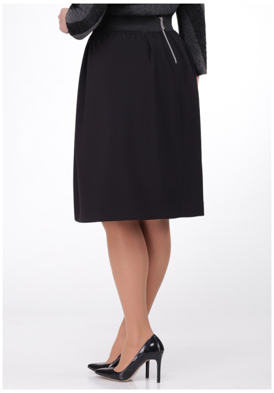 Юбка расклешенная от талии с поясом на резинке. Застежка на молнию по спинке.