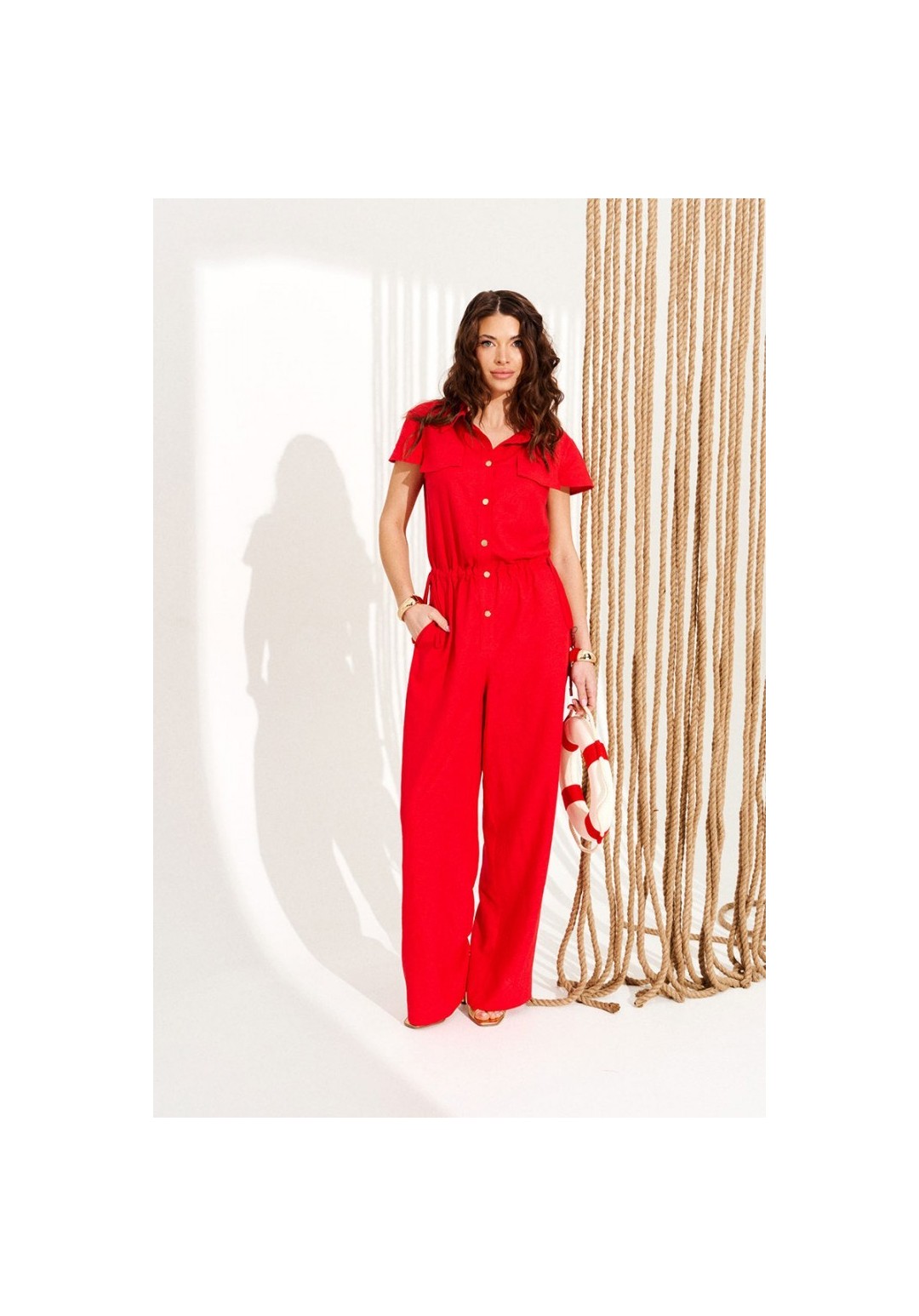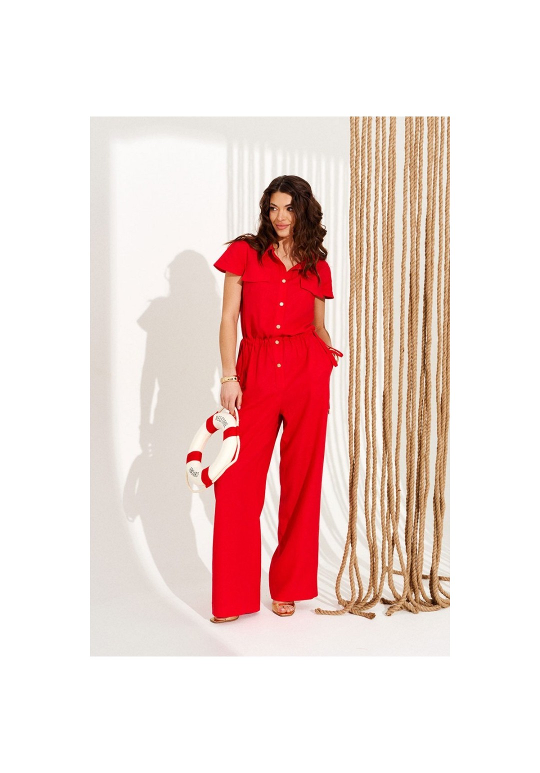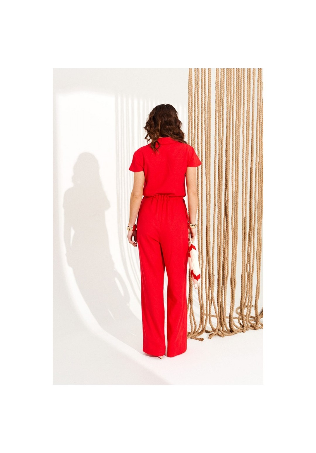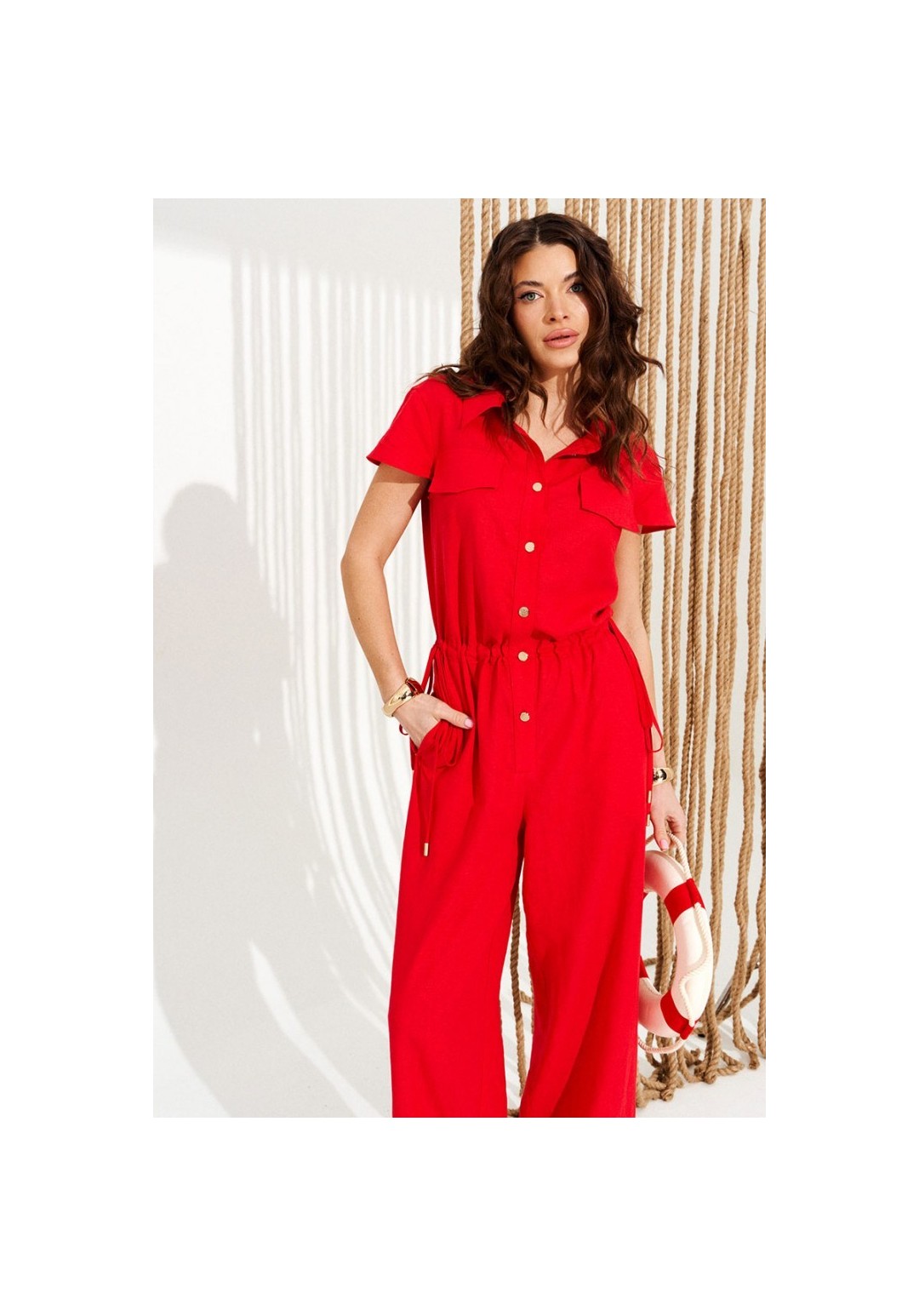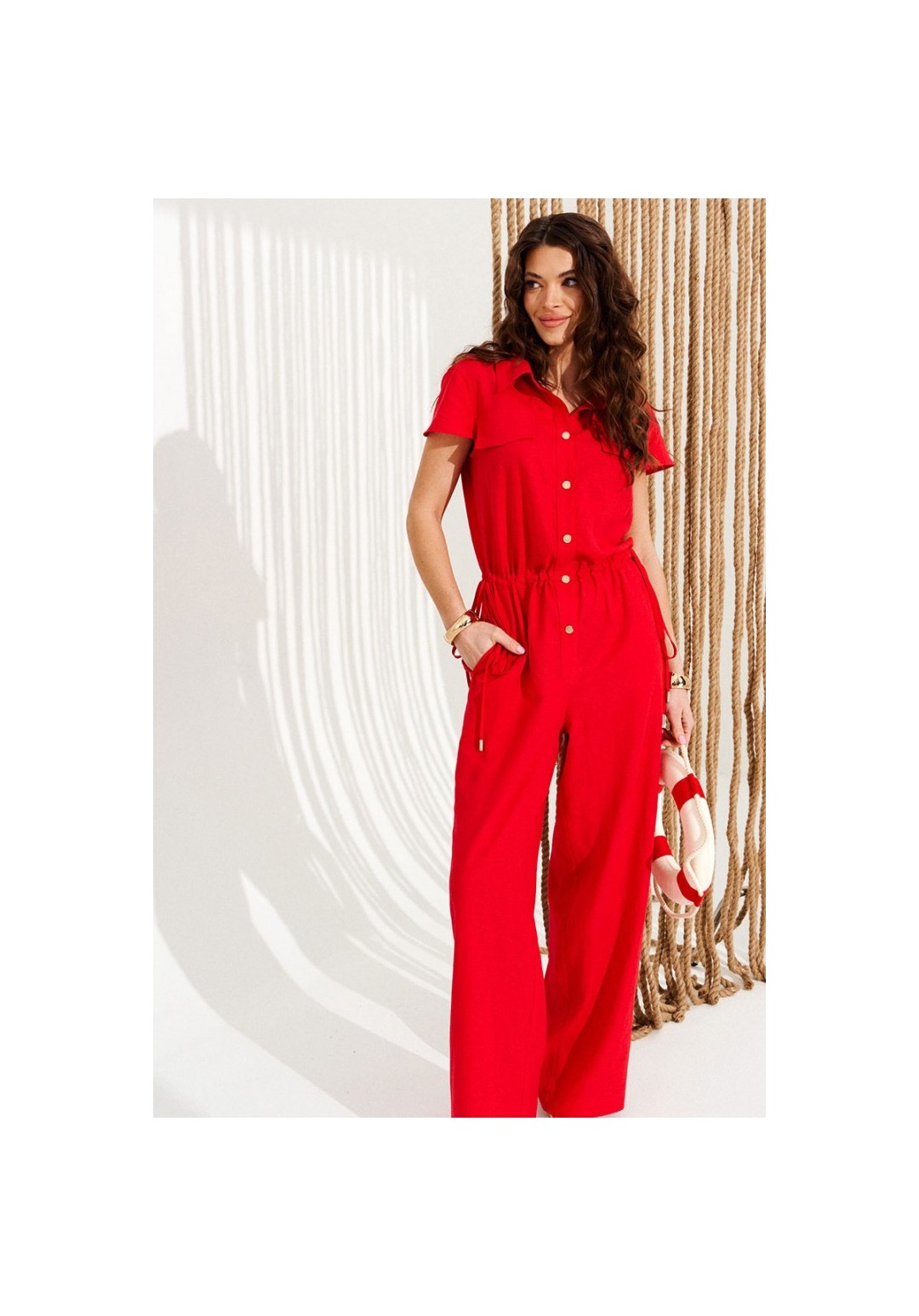Комбинезон умеренного объема, полуприлегающего силуэта, с центральной застежкой на петли и пуговицы. Воротник стояче-отложной на отрезной стойке. Детали переда с нагрудными вытачками и декоративными настрочными клапанами. Спинка с отрезной кокеткой. По линии талии расположена настрочная кулиска со шнурами-завязками и наконечниками, выведенными в боковые швы для регулировки прилегания. Рукав-крылышко. Длина изделия на модели вдоль середины спинки до низа штанины — 156 см (допустимое отклонение +/- 1 см).