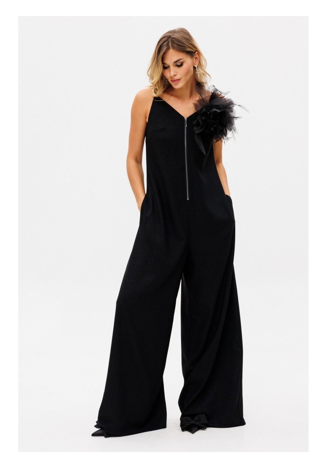 Комбинезон выполнен из костюмной ткани с блеском. Комбинезон А-образного силуэта, длиной в пол. Спереди в среднем шве застежка на молнию с металлическими звеньями. В боковых швах обработаны карманы. Горловина переда и спинки V-образной формы. Комбинезон на регулируемых бретелях. Брюки расширены к низу. Длина:140 см. Гарантийный срок не установлен ГОСТ 25294 - 2003