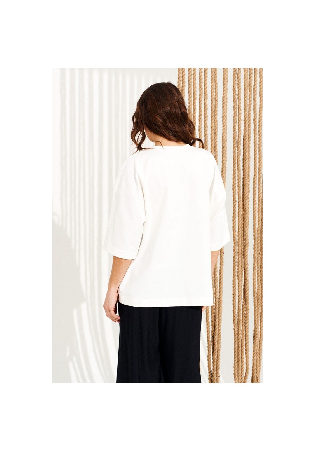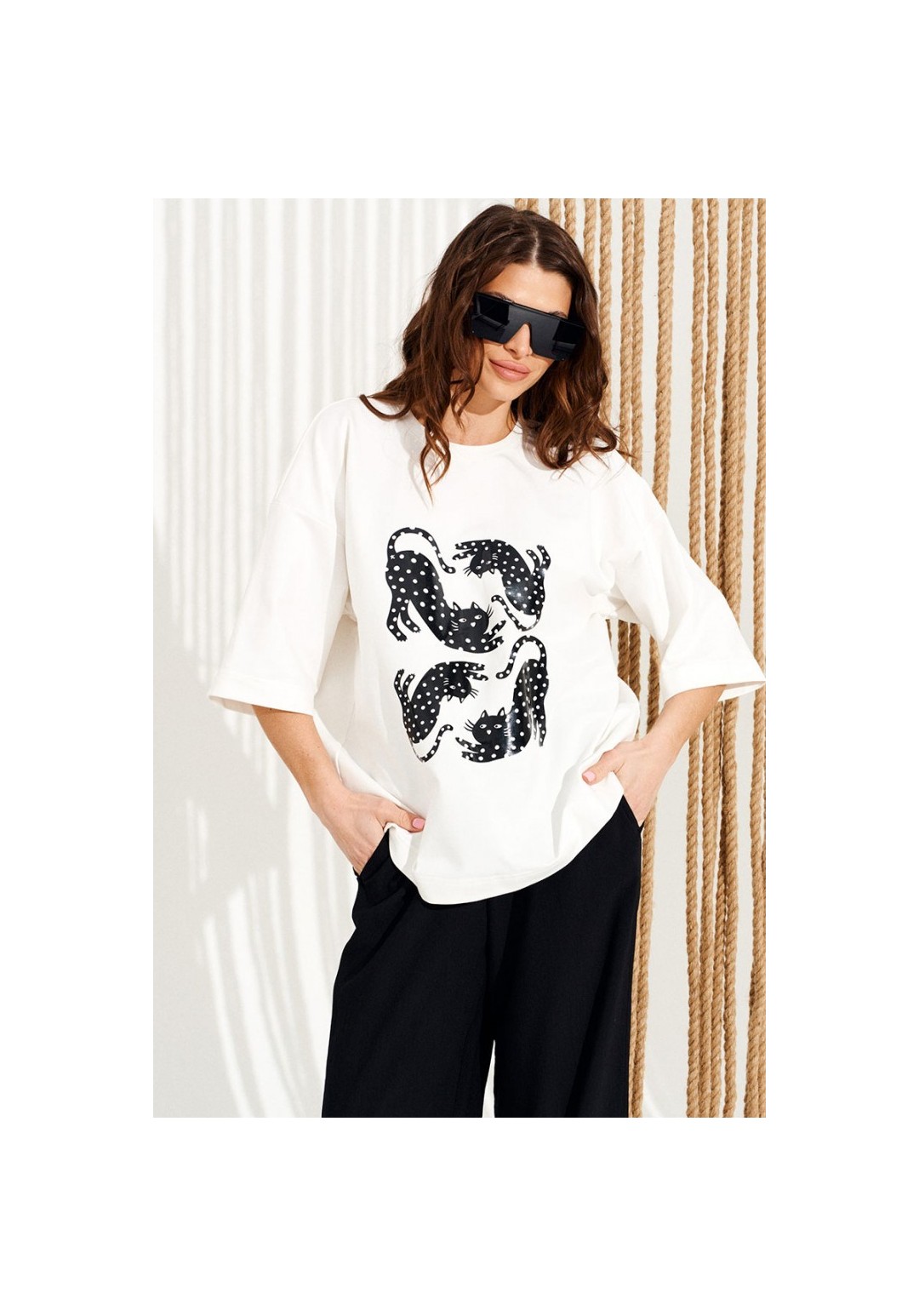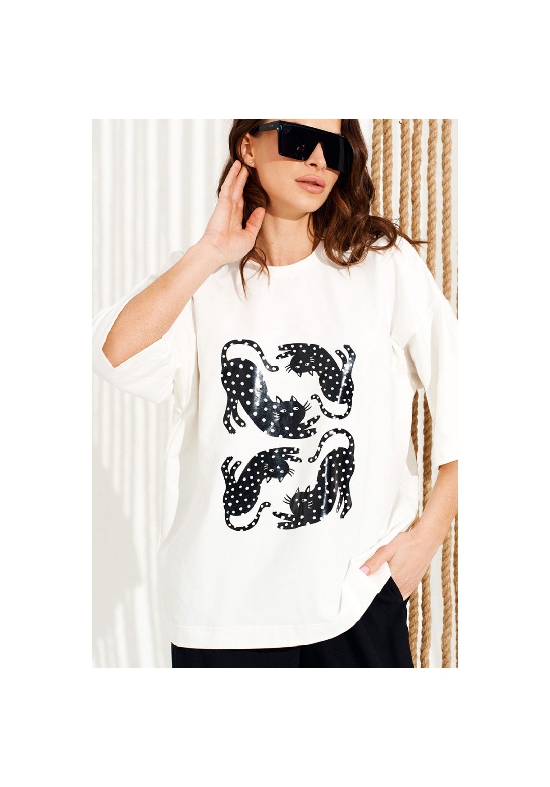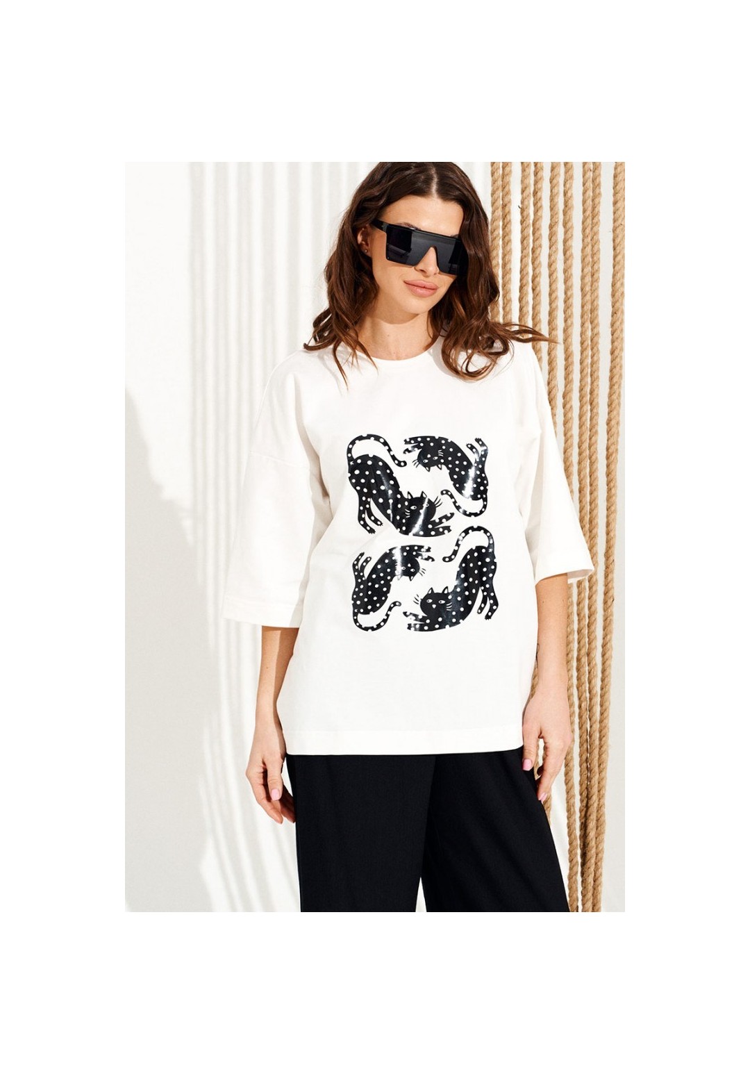 Джемпер из трикотажного полотна свободного объема, прямого силуэта, с круглым вырезом горловины.Перед и спинка цельные. Вырез горловины обработан притачной обтачкой. По переду выполнена печать Котики. Рукав втачной, одношовный, короткий. Длина изделия на модели вдоль середины спинки — 68,5 см (допустимое отклонение +/- 1 см)