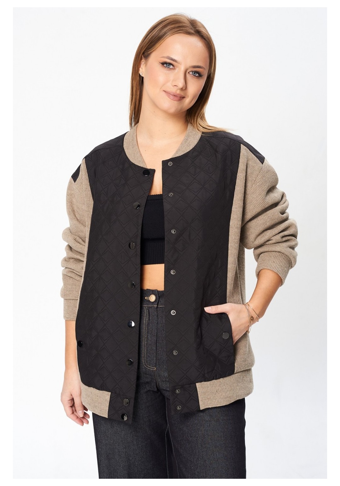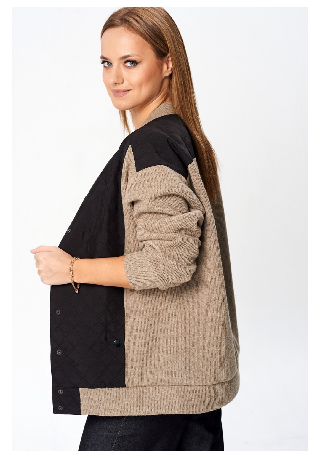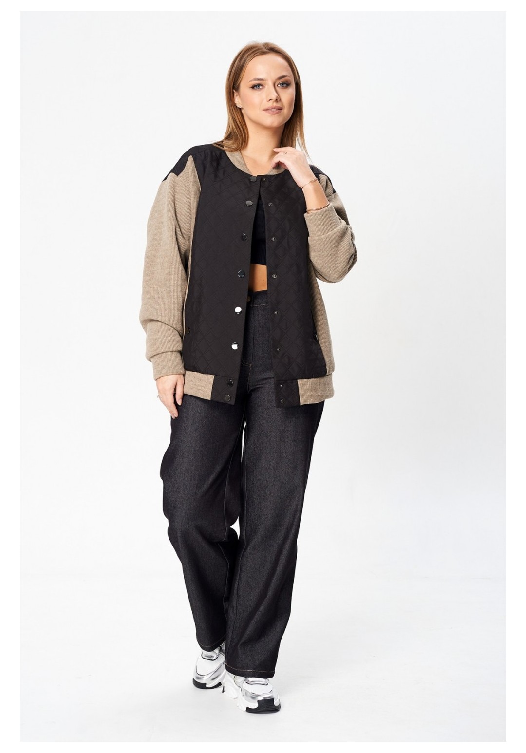 Джемпер выполнен из двух видов ткани: трикотажного полотна и стёганной ткани. Жакет со спущенной линией плеча, на подкладке. Центральная застежка на кнопки. По переду полочки в рельефных швах располагаются карманы с фиксацией на кнопку. Спинка с отрезной кокеткой. По низу джемпер собран на притачной пояс из трикотажного полотна. Низ рукавов собирается на притачную манжету. Джемпер на подкладке. Длина по спинке: 68 см. Длина рукава с учетом плеча: 76 см.