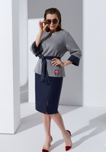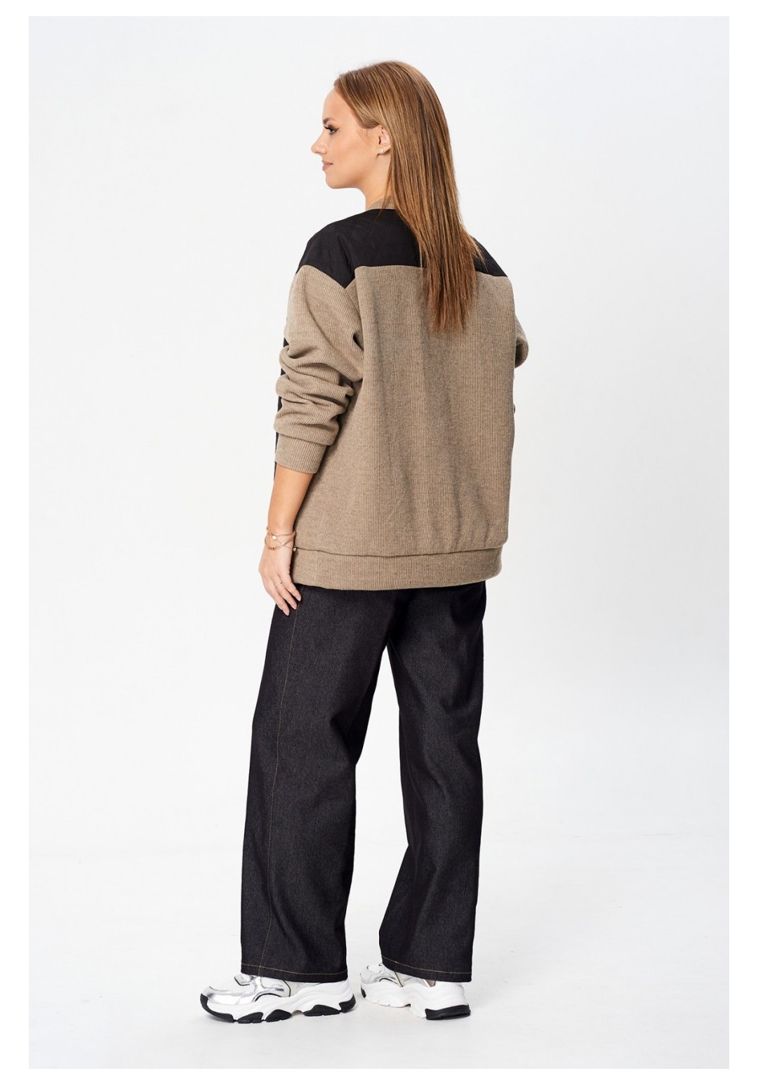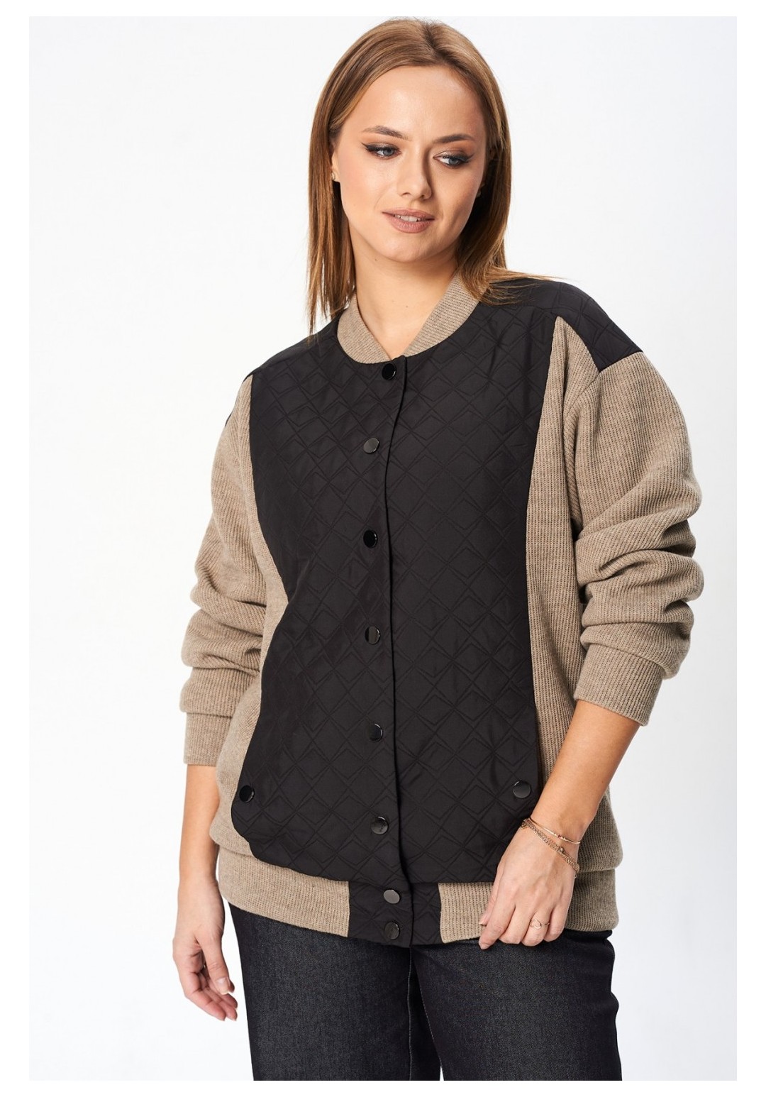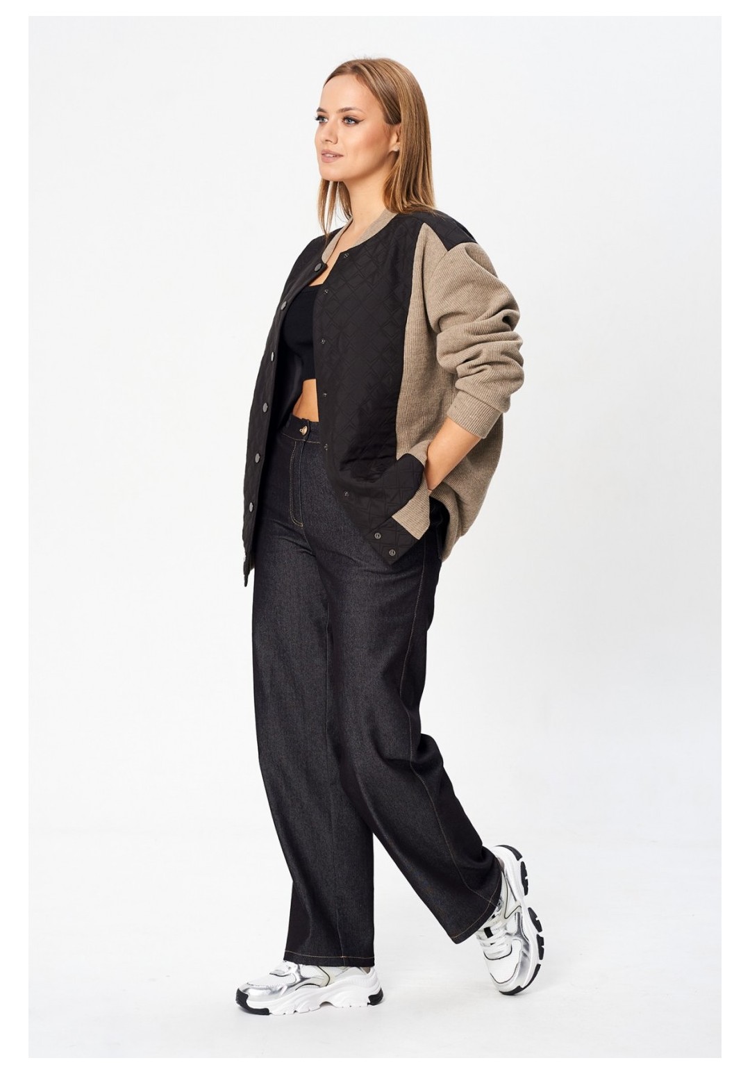 Джемпер выполнен из двух видов ткани: трикотажного полотна и стёганной ткани. Жакет со спущенной линией плеча, на подкладке. Центральная застежка на кнопки. По переду полочки в рельефных швах располагаются карманы с фиксацией на кнопку. Спинка с отрезной кокеткой. По низу джемпер собран на притачной пояс из трикотажного полотна. Низ рукавов собирается на притачную манжету. Джемпер на подкладке. Длина по спинке: 68 см. Длина рукава с учетом плеча: 76 см.