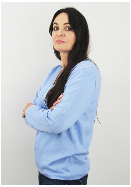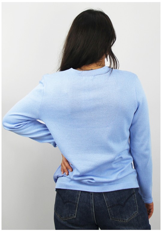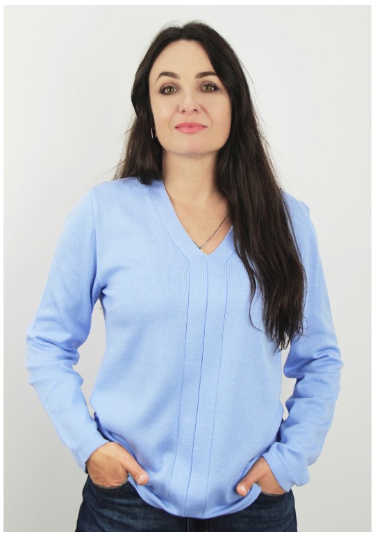Джемпер второго слоя одежды, регулярный, прямого силуэта, с длинным втачным рукавом. V-образный вырез горловины заработан сдвоенной кулирной гладью шириной 2,7+-0,3 см.