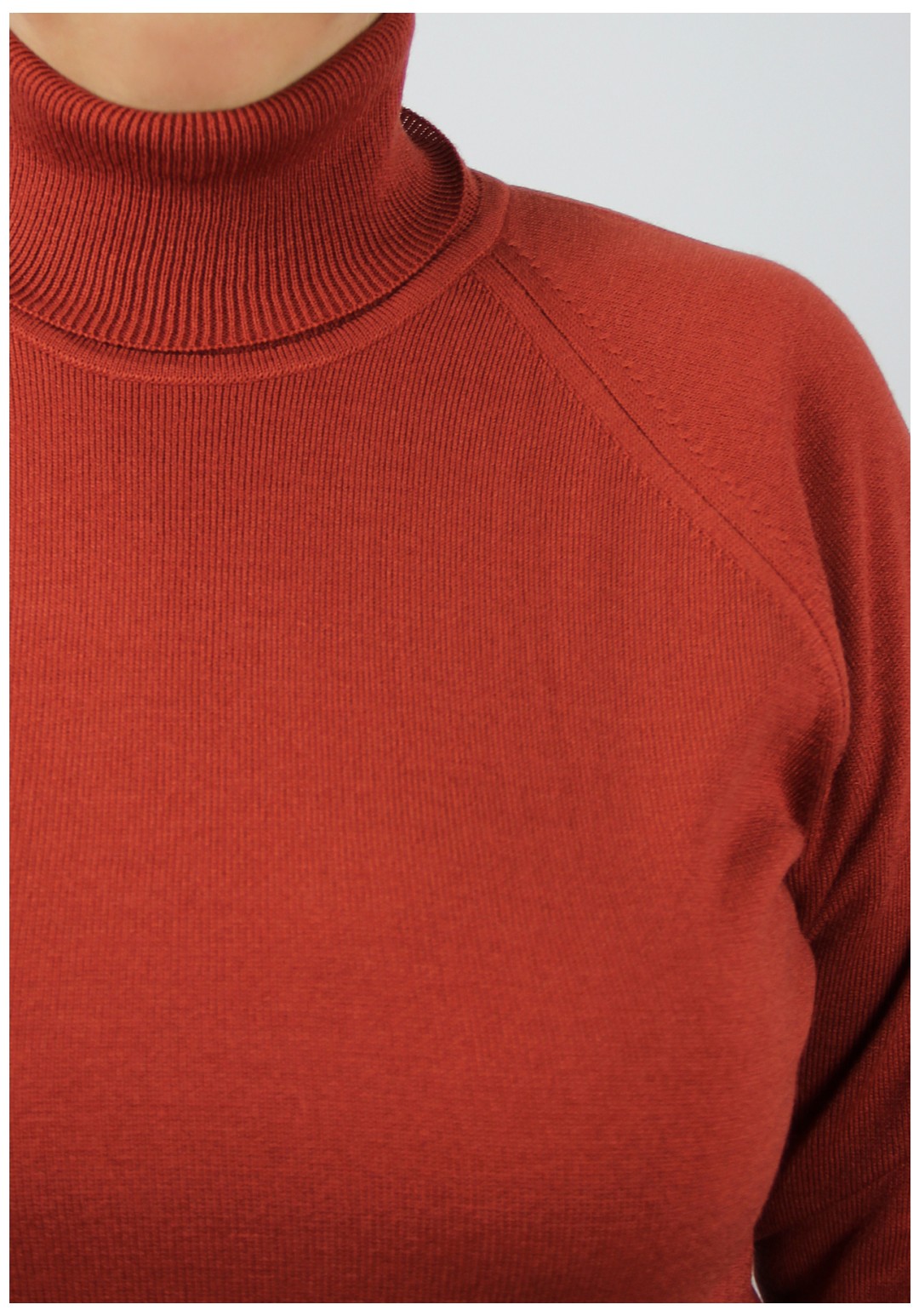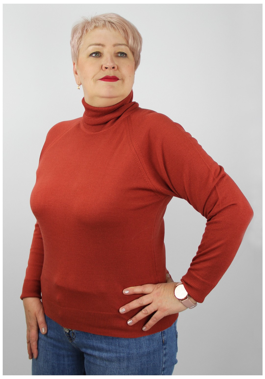 Свитер прямого силуэта, второго слоя одежды, с длинным рукавом реглан. Круглый вырез горловины обработан высоким ластичным воротником - ластик 1х1. Низ стана и рукавов заработан ластиком 1х1.