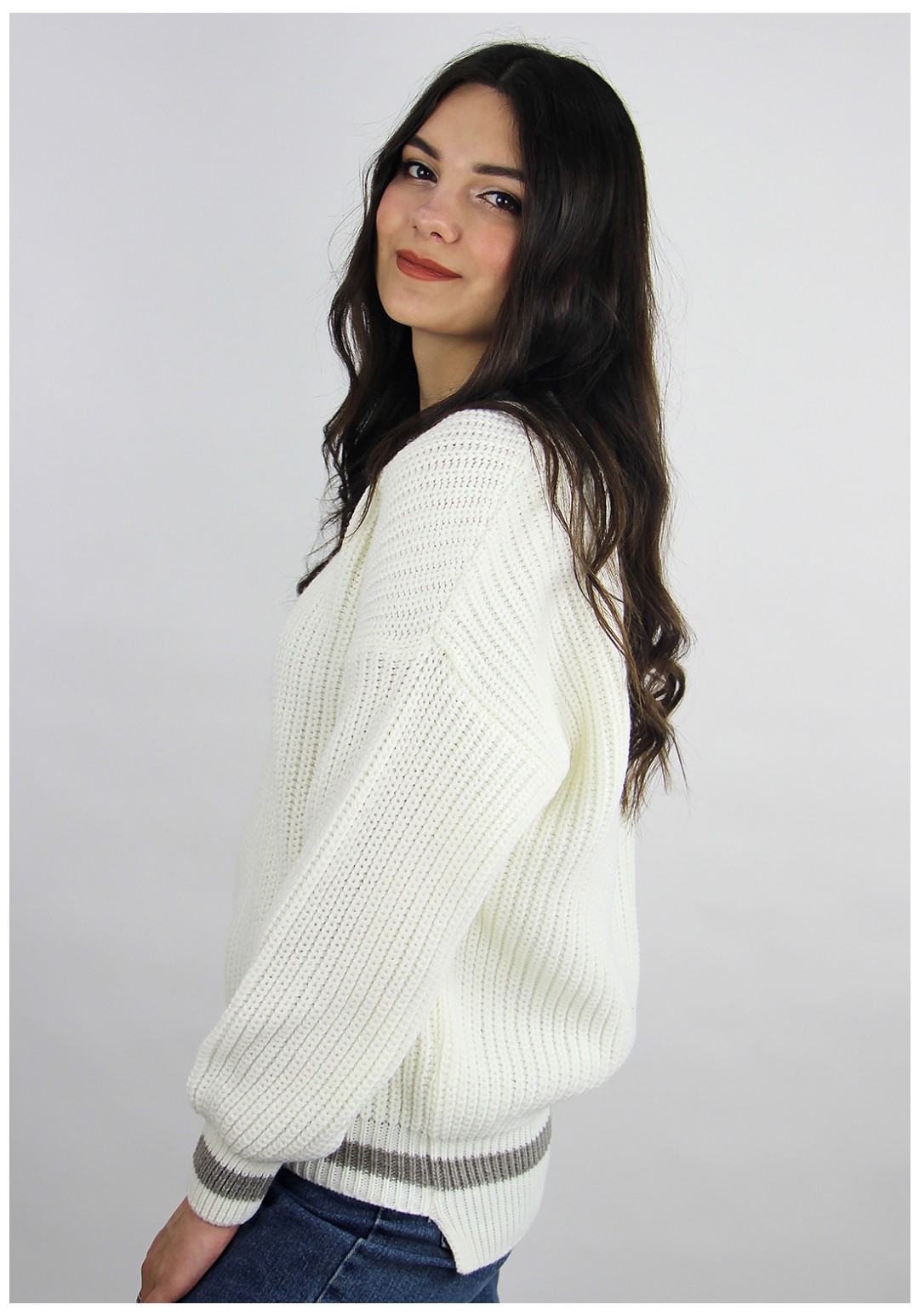 Джемпер второго слоя одежды со спущеной линией плеча, с втачным рукавом. Перед со спинкой разноуровневый. Спинка длинее переда. V-образный вырез горловины закеттлёван бейкой высотой в гот. виде 4,0+-0,2см