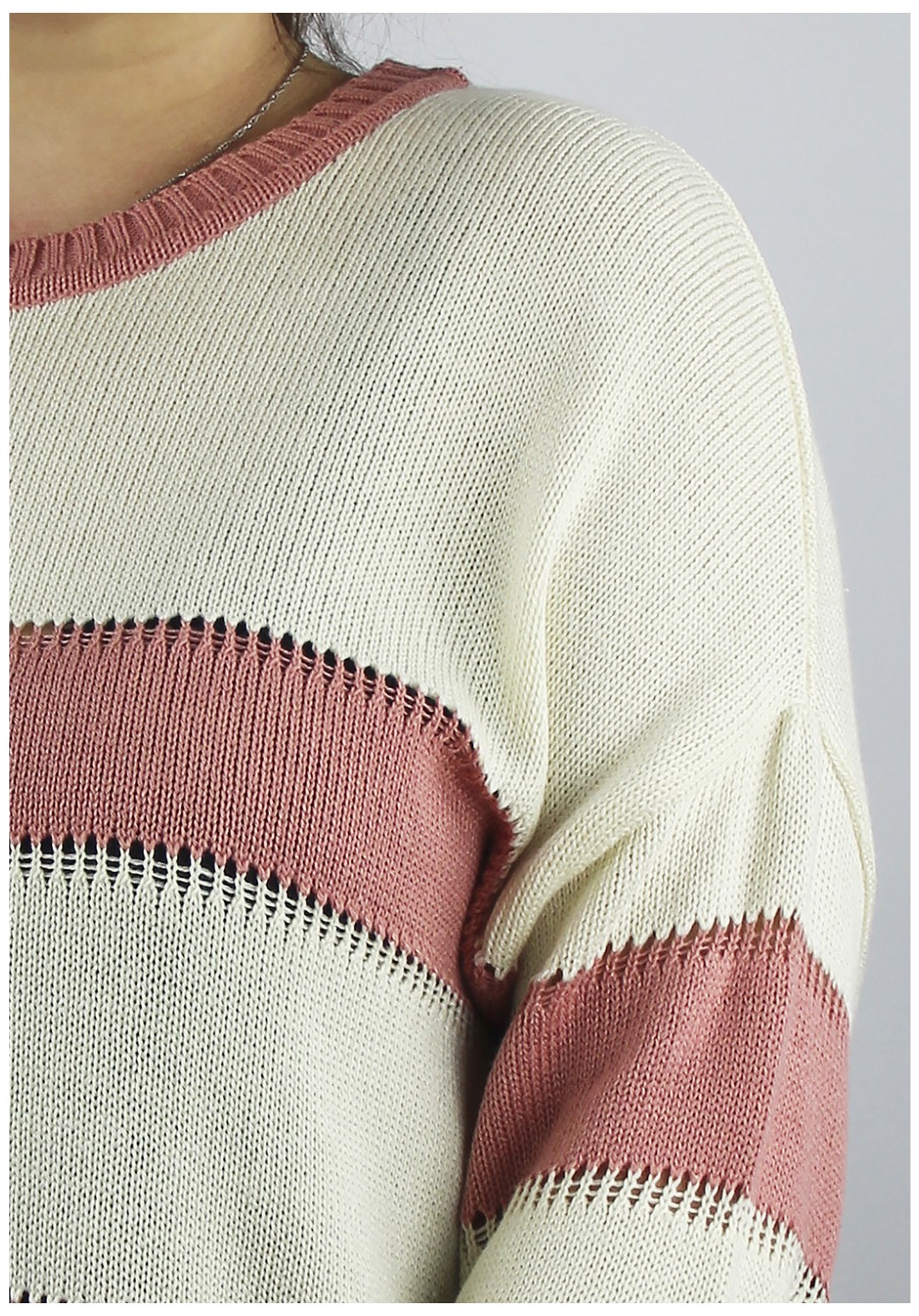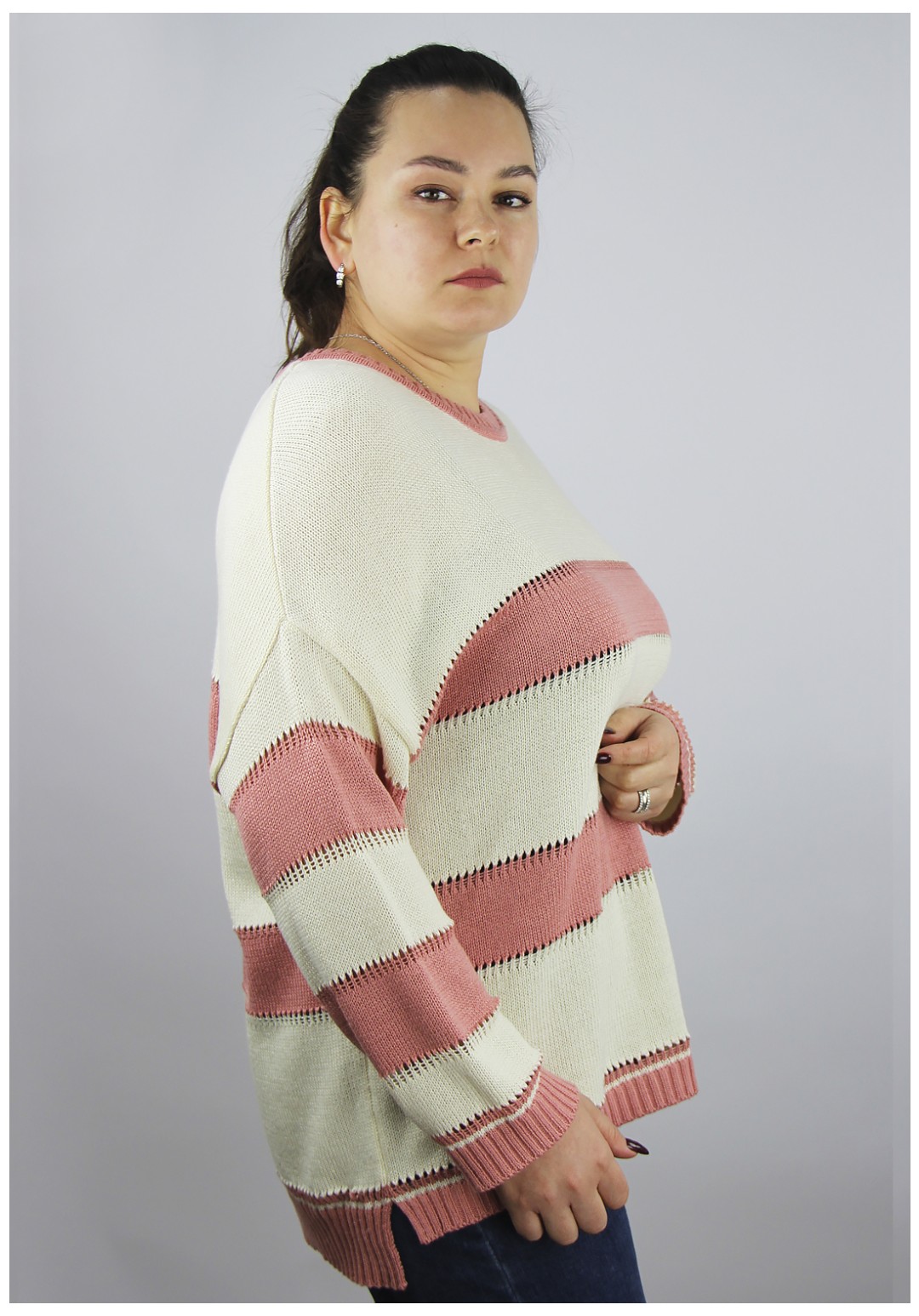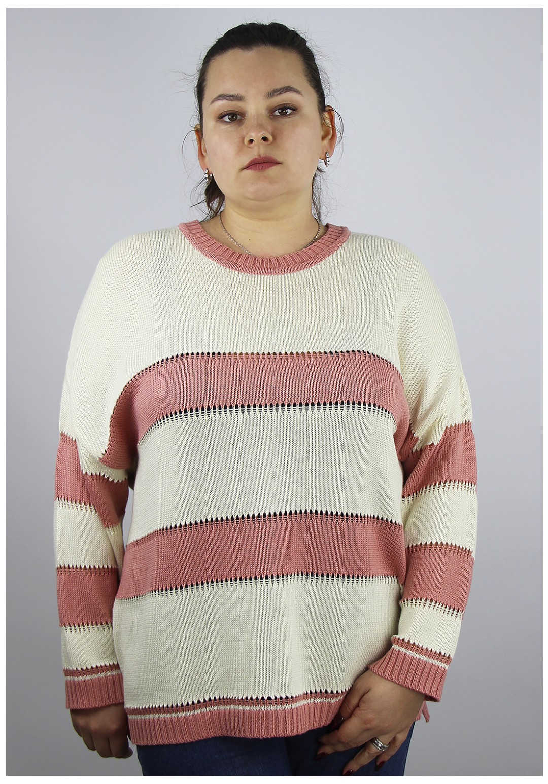 Джемпер женский. Второго слоя одежды со спущенной линией плеча, длинным втачным рукавом. Круглый вырез горловины закетлеван одинарной бейкой-ласти