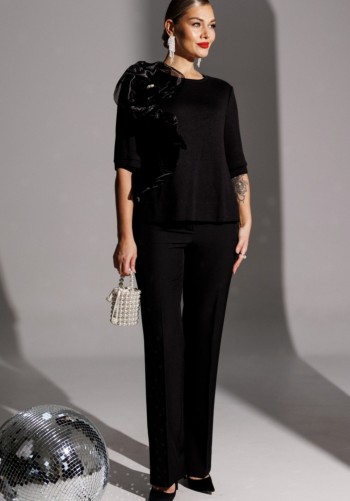 Джемпер прямого силуэта, второго слоя одежды, немного укорочен, регулярный. Плечевой шов перенесен в сторону переда, рукав втачной длинный. Низ стана и рукава заработан.