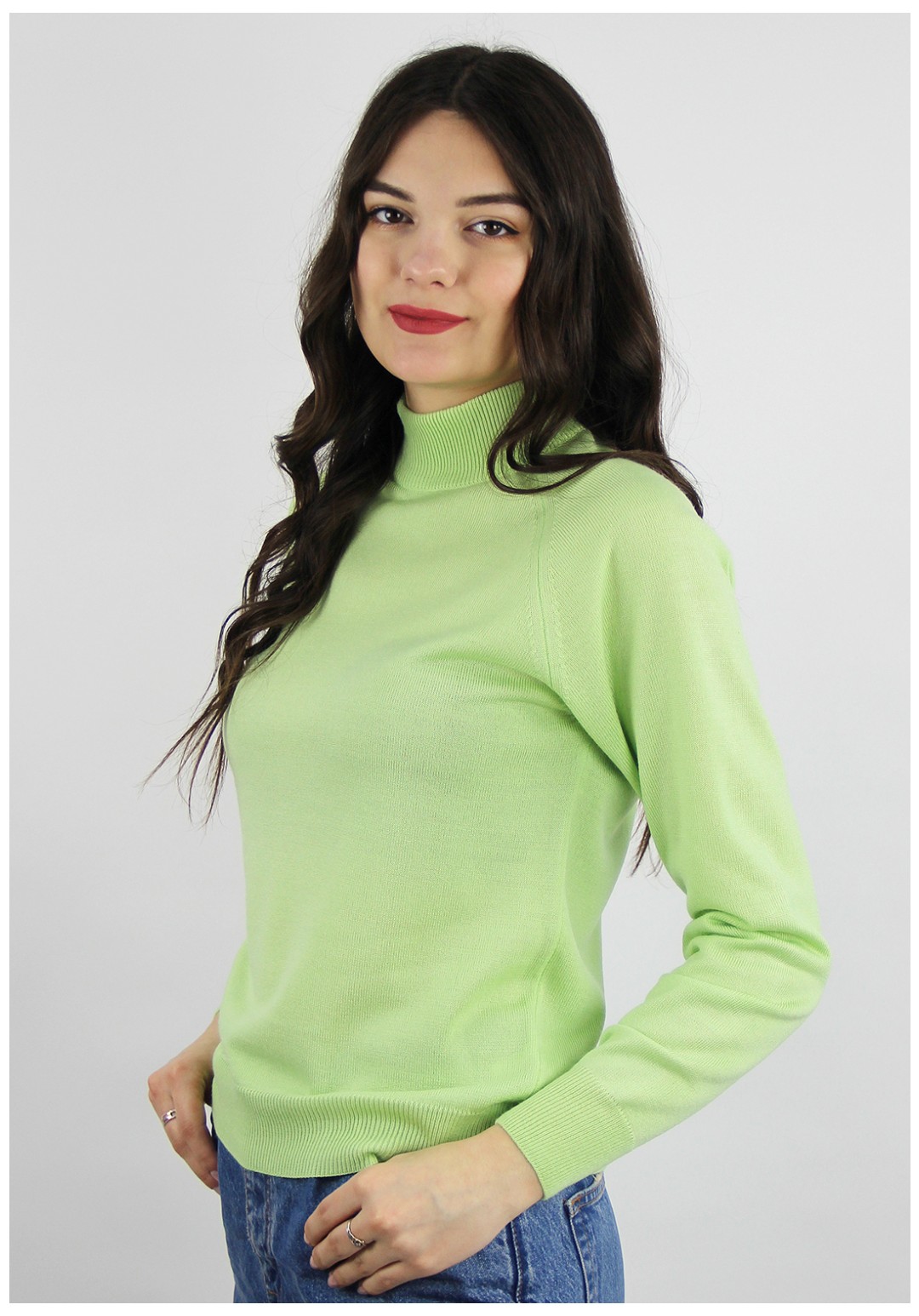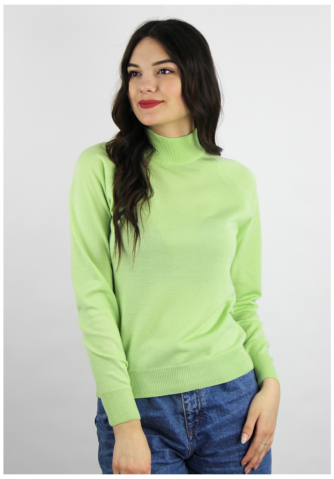 Свитер прямого силуэта с длинным рукаом "реглан". Низ изделия и рукавов заработан ластиком 1х1. Воротник - двойная ластичная стойка.