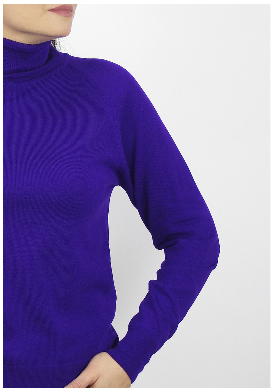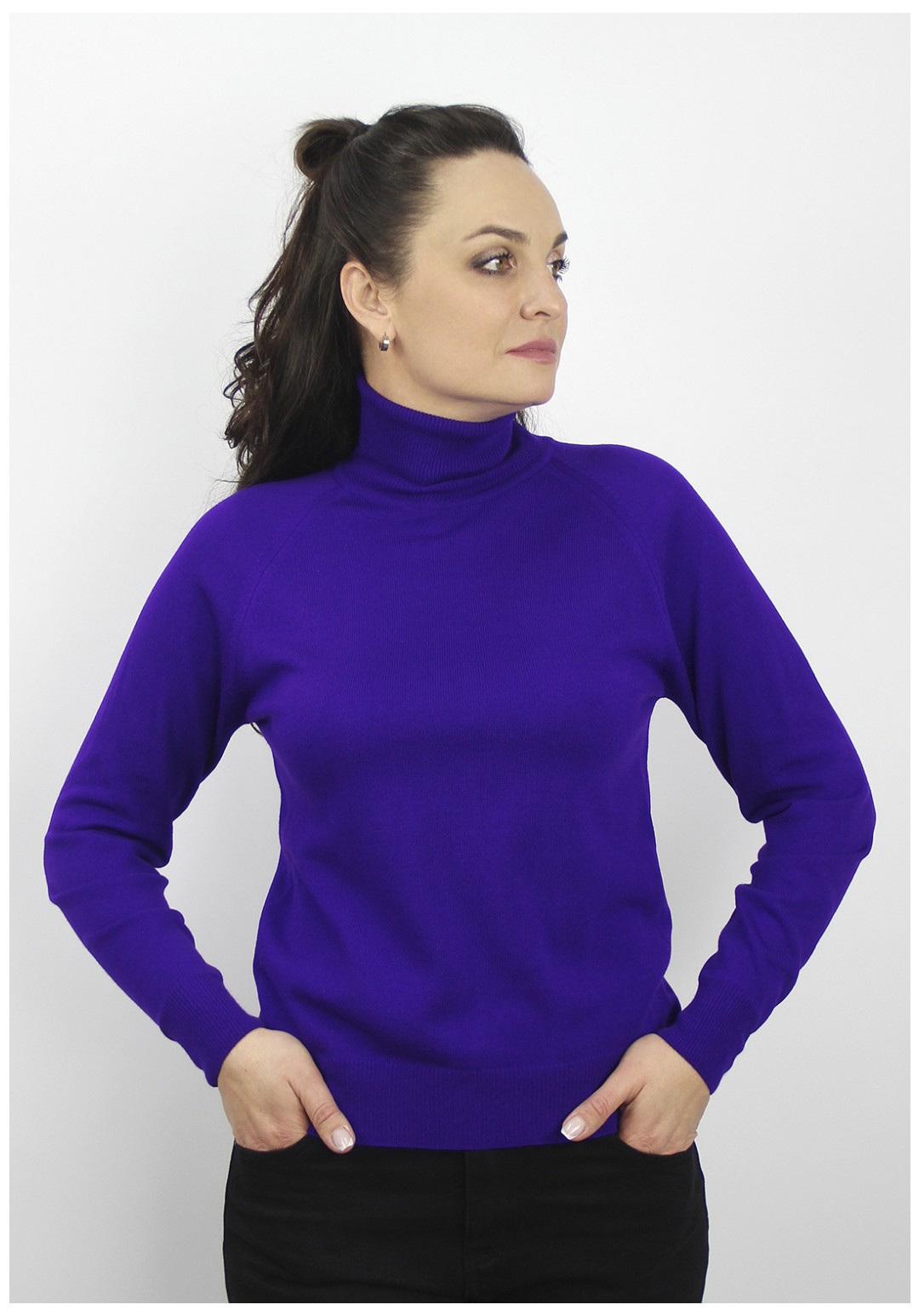 Свитер прямого силуэта, второго слоя одежды, с длиным рукавом реглан. Круглый вырез горловины обработан высоким ластичным воротником-ластик 1х1. Низ стана и рукавов обработан ластиком 1х1