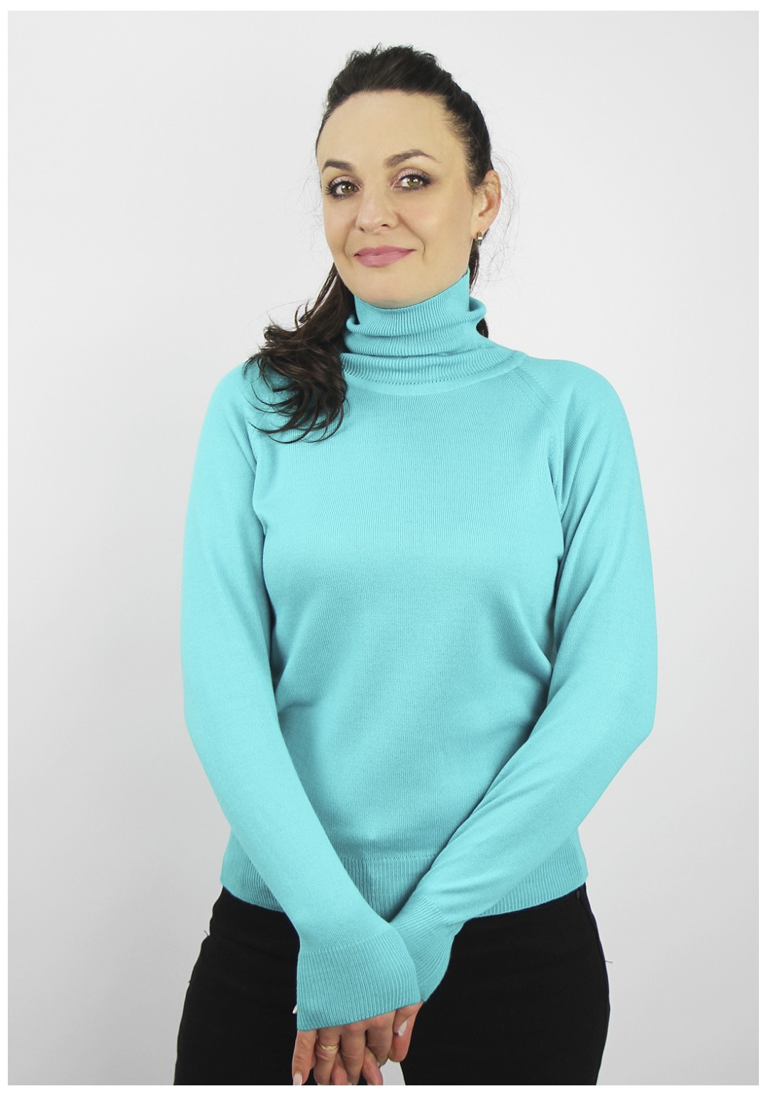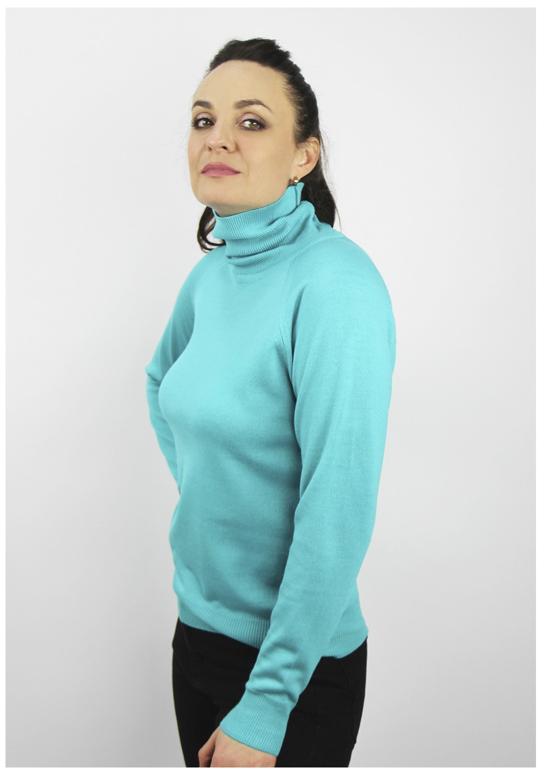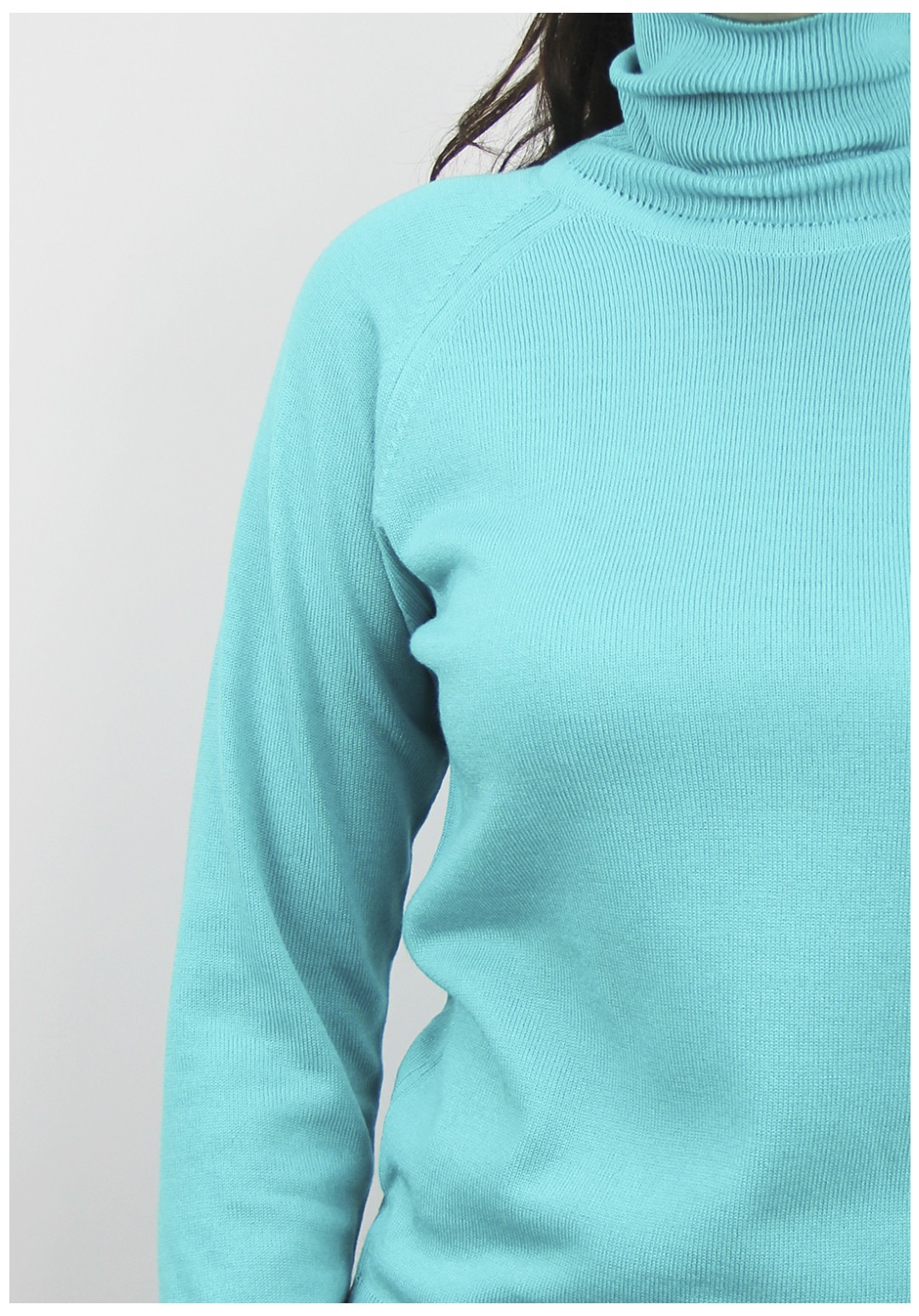 Свитер прямого силуэта, второго слоя одежды, с длиным рукавом реглан. Круглый вырез горловины обработан высоким ластичным воротником-ластик 1х1. Низ стана и рукавов обработан ластиком 1х1