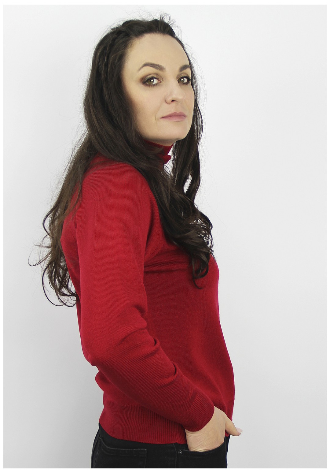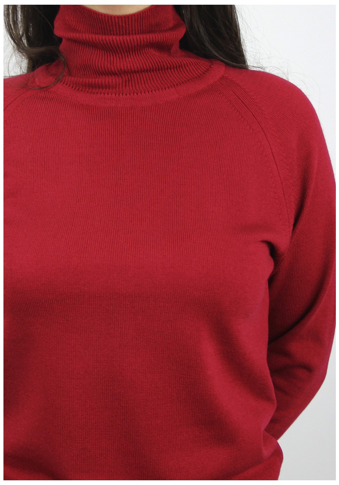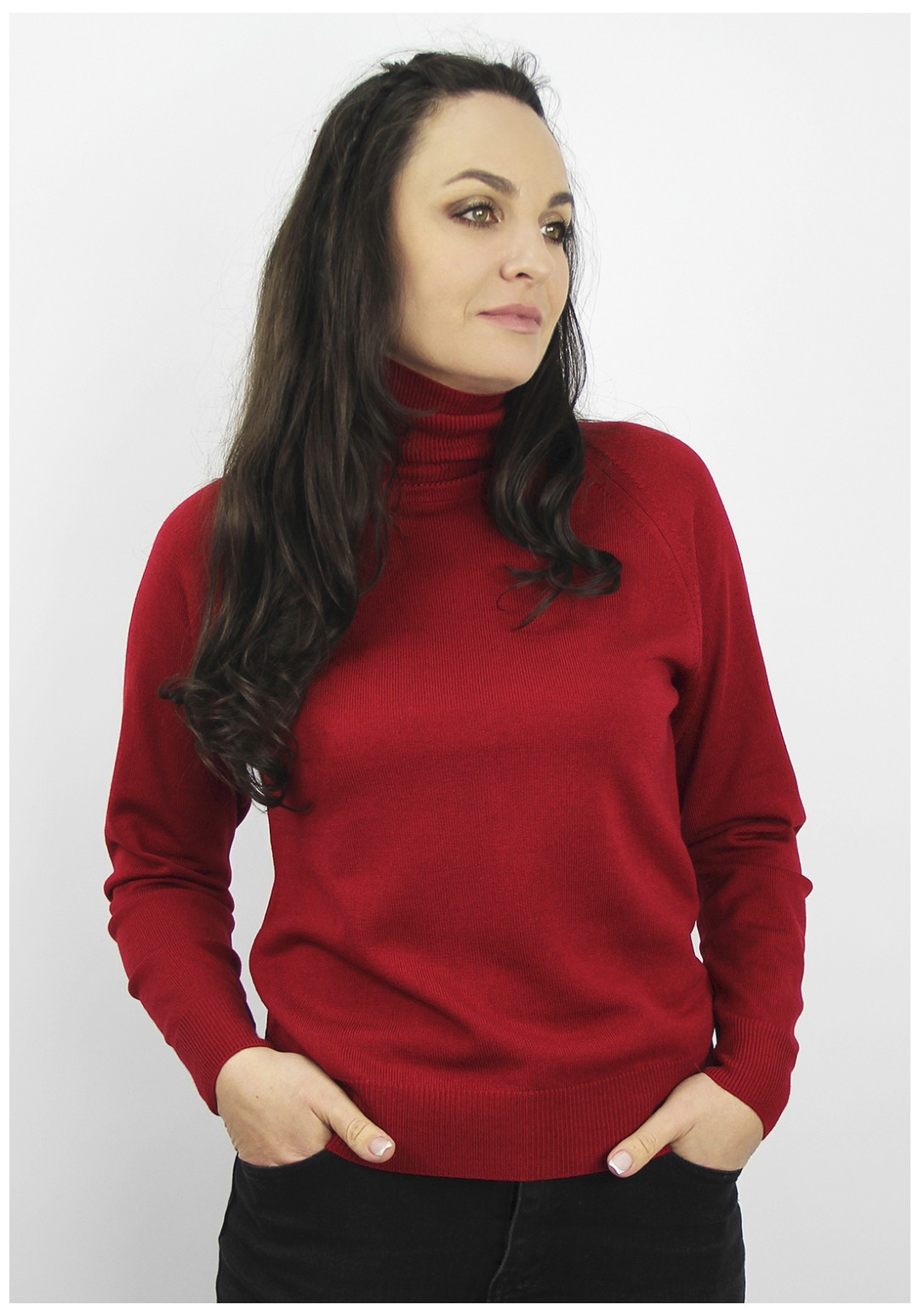 Свитер прямого силуэта, второго слоя одежды, с длиным рукавом реглан. Круглый вырез горловины обработан высоким ластичным воротником-ластик 1х1. Низ стана и рукавов обработан ластиком 1х1