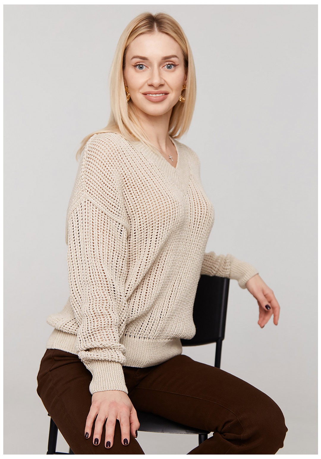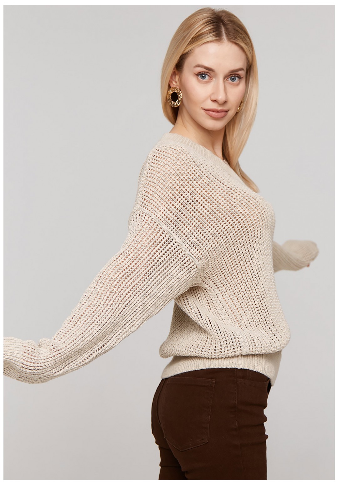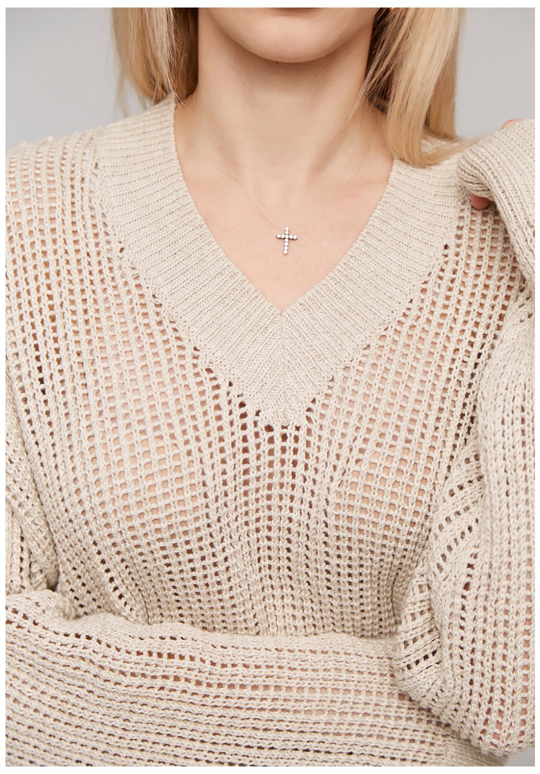 Классический базовый джемпер оверсайз с длинным рукавом и спущенным плечом. Выполнен из высококачественной, мягкой и приятной к телу пряжи с добавлением льна переплетением сетка. Джемпер представлен в натуральном цвете. V-образная горловина, рукава и низ изделия вывязаны резинкой. Джемпер изготовлен специально для любителей свободных и легких вещей. Является базовой частью гардероба. Отлично сочетается с джинсами, брюками, юбкой и с любым типом обуви. Прекрасен на любой сезон, для работы, офиса, торжественного случая и повседневной носки. Благодаря своему составу изделие сохранит свою форму спустя множество стирок и прослужит вам не один сезон. Важная информация! Фото товара сделано при искусственном освещении студии. При естественном освещении цвета могут иметь другие оттенки. Сушите изделие горизонтально, разложив на полу или горизонтальной поверхности.