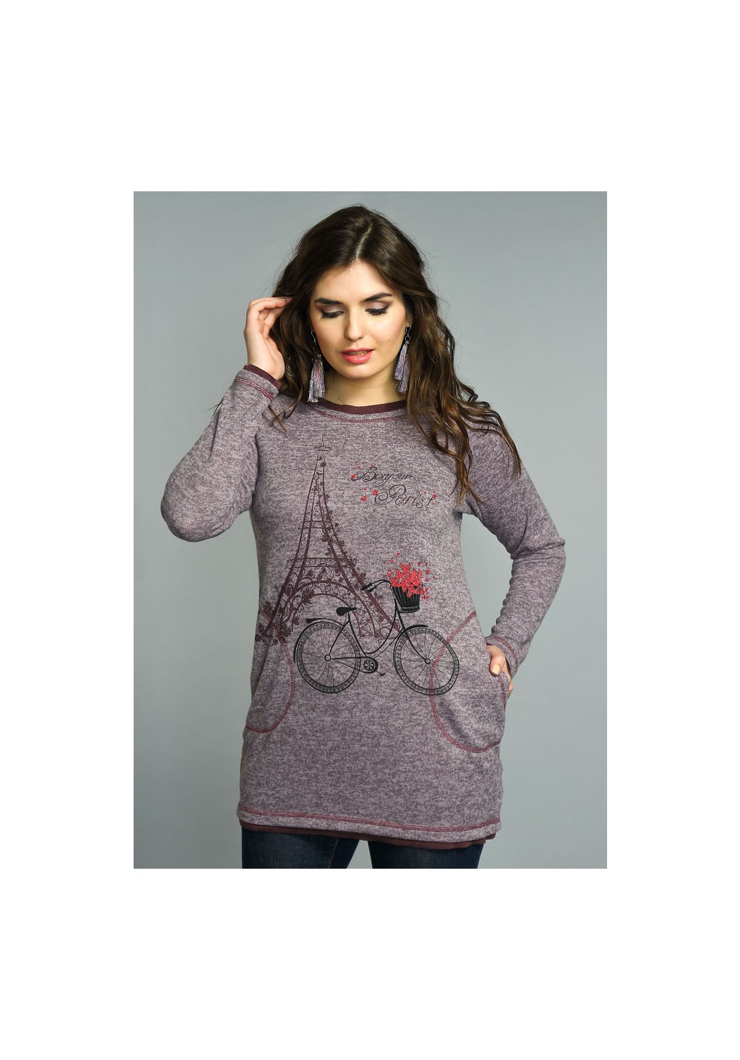 Горловина, низ изделия и низ рукавов отделаны притачной бейкой контрастного цвета и припуск шва распошит отделочными нитками.