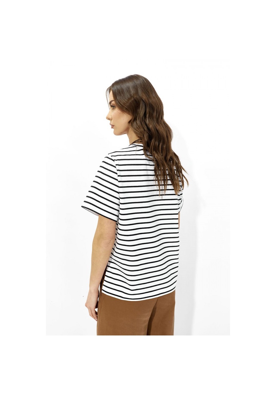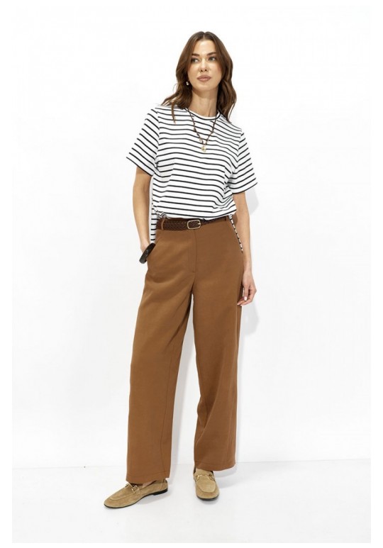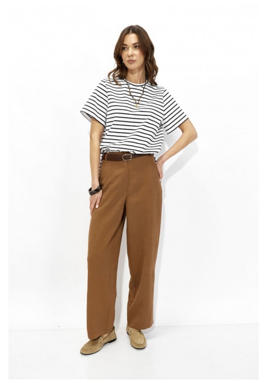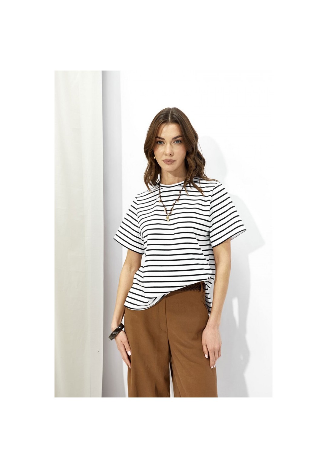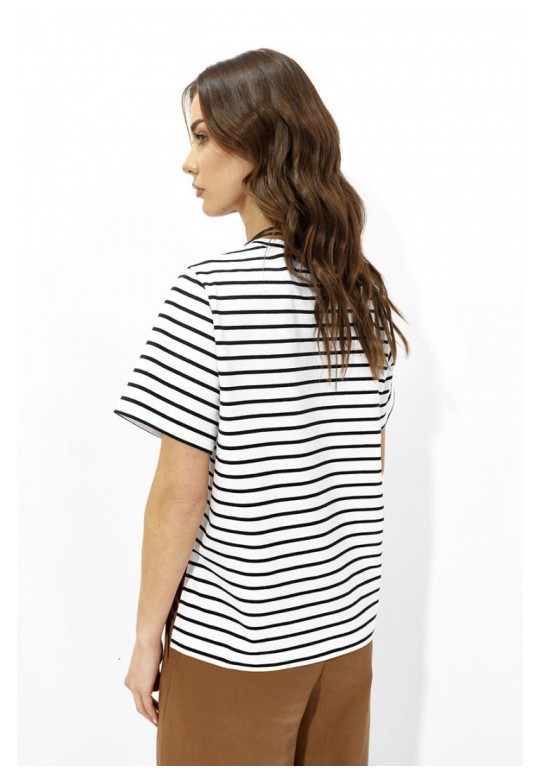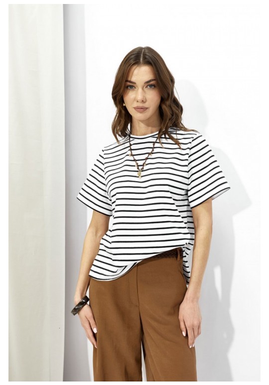 Джемпер прямого силуэта из трикотажного полотна в полоску. Вырез горловины округлый с притачной бейкой. Рукав втачной короткий. Низ спинки длиннее переда, в боковых разрезы по низу. Длина джемпера в 44-48р – 59см, в 50-54р - 64см, в 56-60 – 69 см. Длина рукава в 44-48р – 22см, в 50-54р - 23см, в 56-60 -24 см.