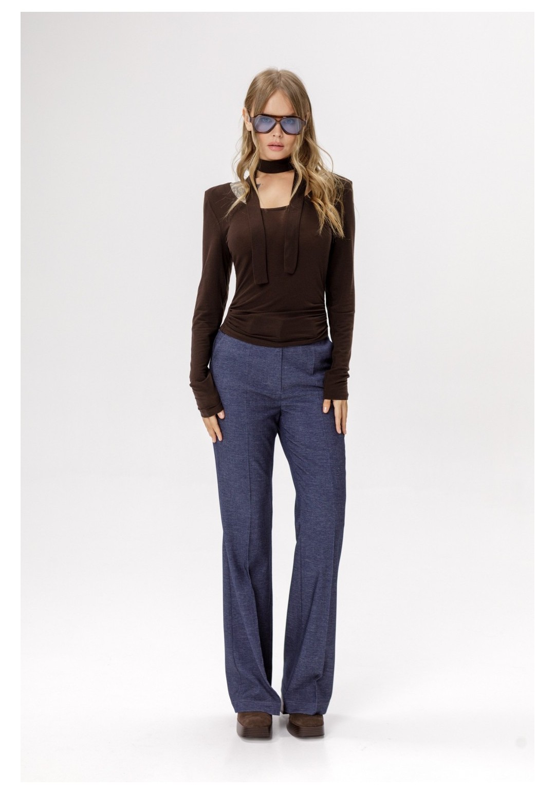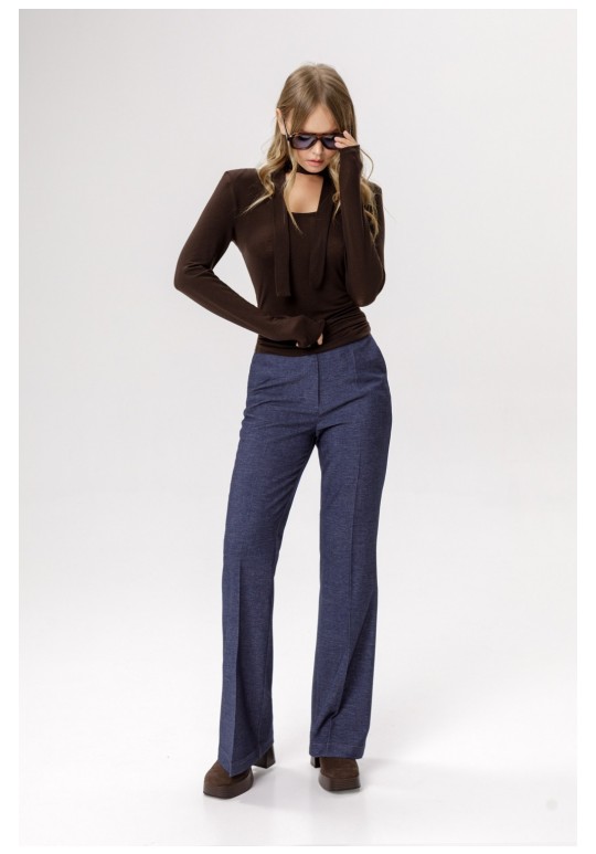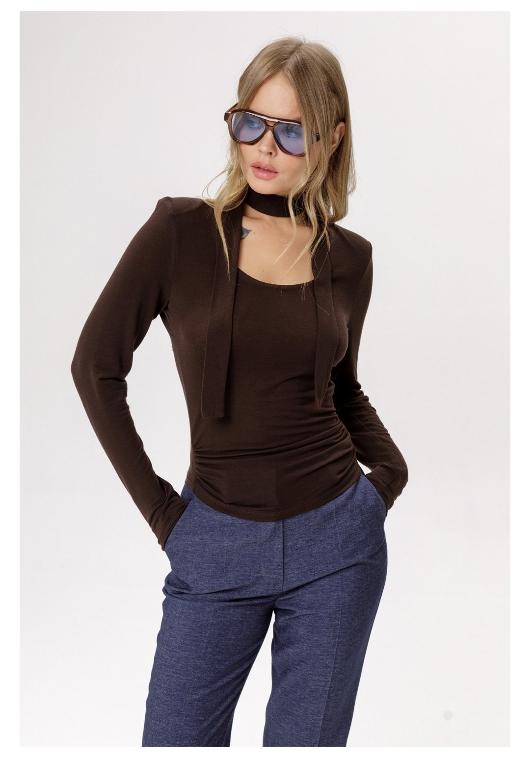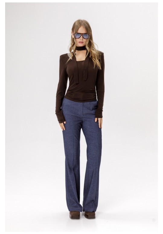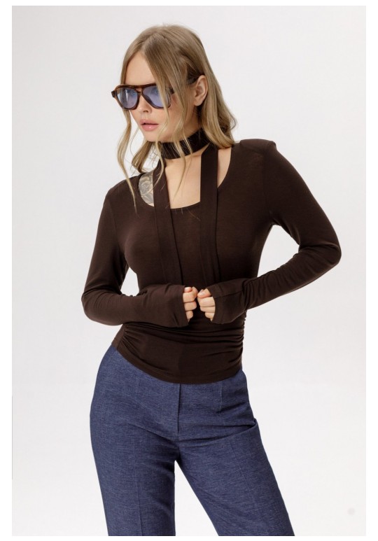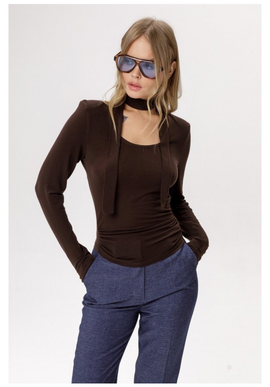 Трикотажный полупрозрачный джемпер со съемным шарфиком. Детали: джемпер укороченный, приталенный силуэт, глубокий вырез горловины переда, втачные удлиненные рукава с плечевыми накладками. Длина джемпера по спинке около 46 см в размерах 40-46 и около 48,5 см в размерах 48-52, длина рукава около 64 см.