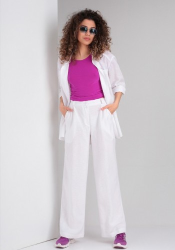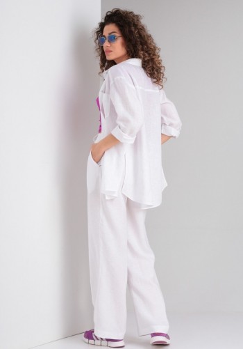 Белая футболка с геометрическим принтом с мерцающим элементом одинаково удачно дополнит и юбку, и брючный костюм. Для пошива модели с короткими рукавами был выбран мягкий дышащий джэрси, который почти не ощущается на теле.