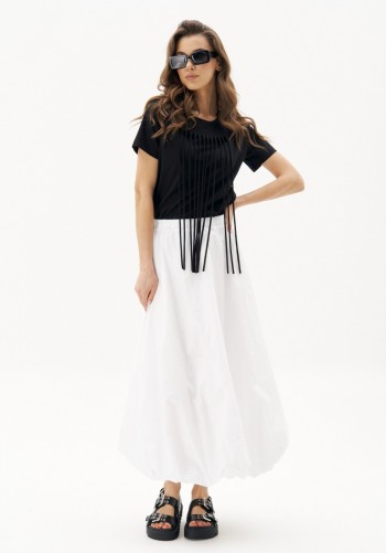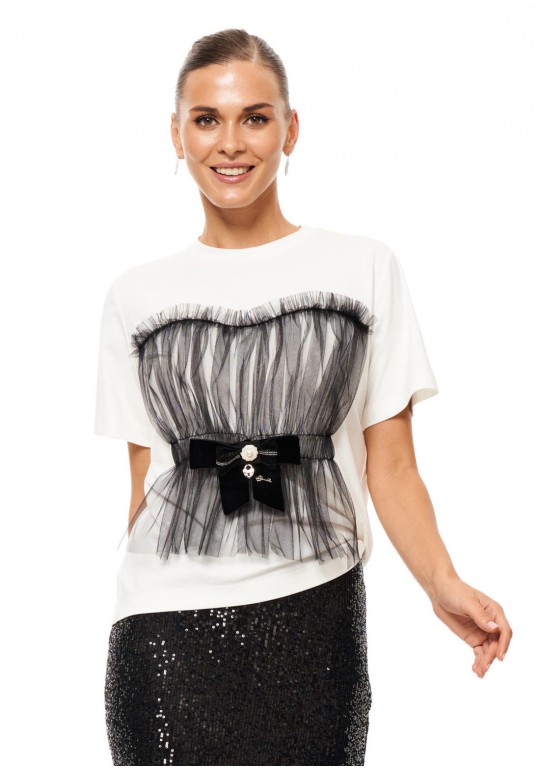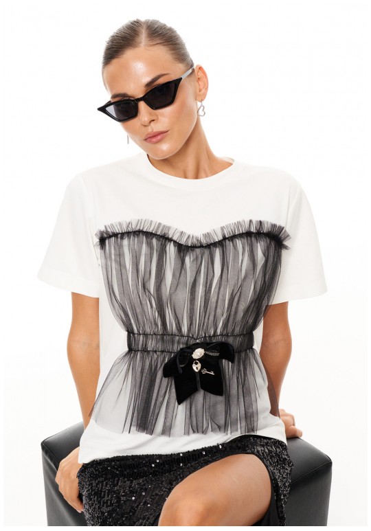 Базовая футболка с декором в виде имитации корсета из нежного фатина и съёмной броши-бант — это идеальное сочетание простоты и элегантности.