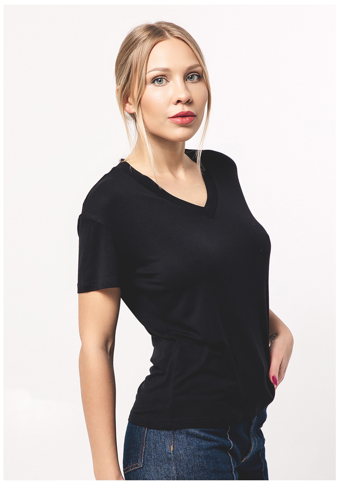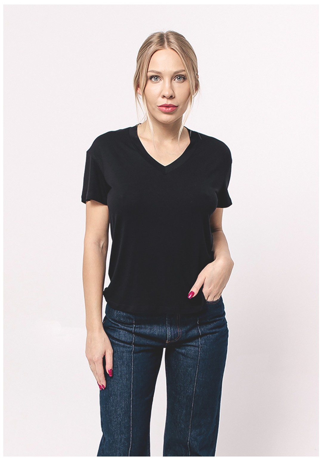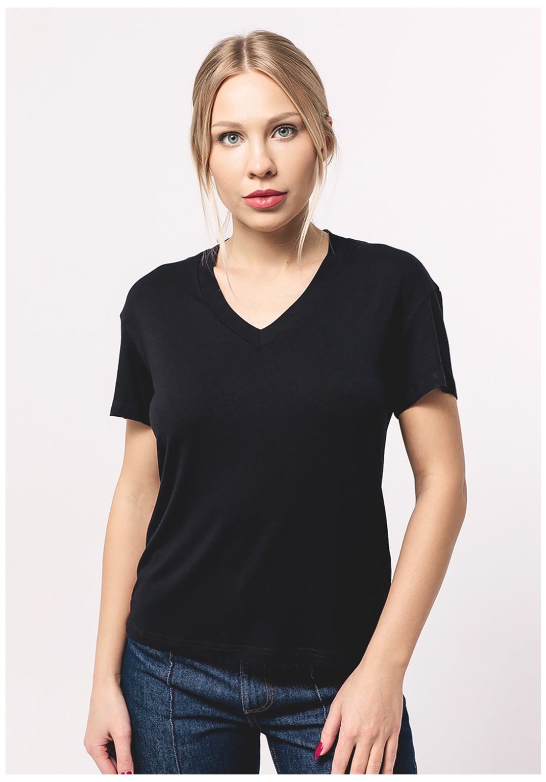 Базовая женская футболка прямого кроя правильной длины с V-образным вырезом подходит всем типам фигур. Свободная посадка, удобно носить навыпуск или заправлять. Выполнена из плотного и мягкоговискозного полотна приятного к телу.  Не скатывается, не просвечивает и сохраняет форму и цвет даже после множества стирок.  РЕКОМЕНДАЦИИ ПО УХОДУ: Для придания первоначальной структуры и формы изделию после покупки - постирать и погладить. Стирать с вещами похожего цвета и вынимать сразу после стирки. Гладить с изнаночной стороны. Обязательно ознакомьтесь с инструкцией на вшивной ленте.