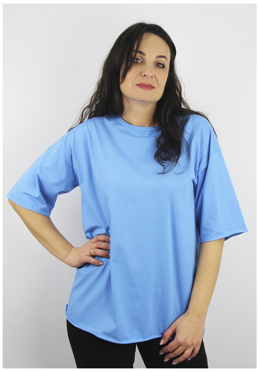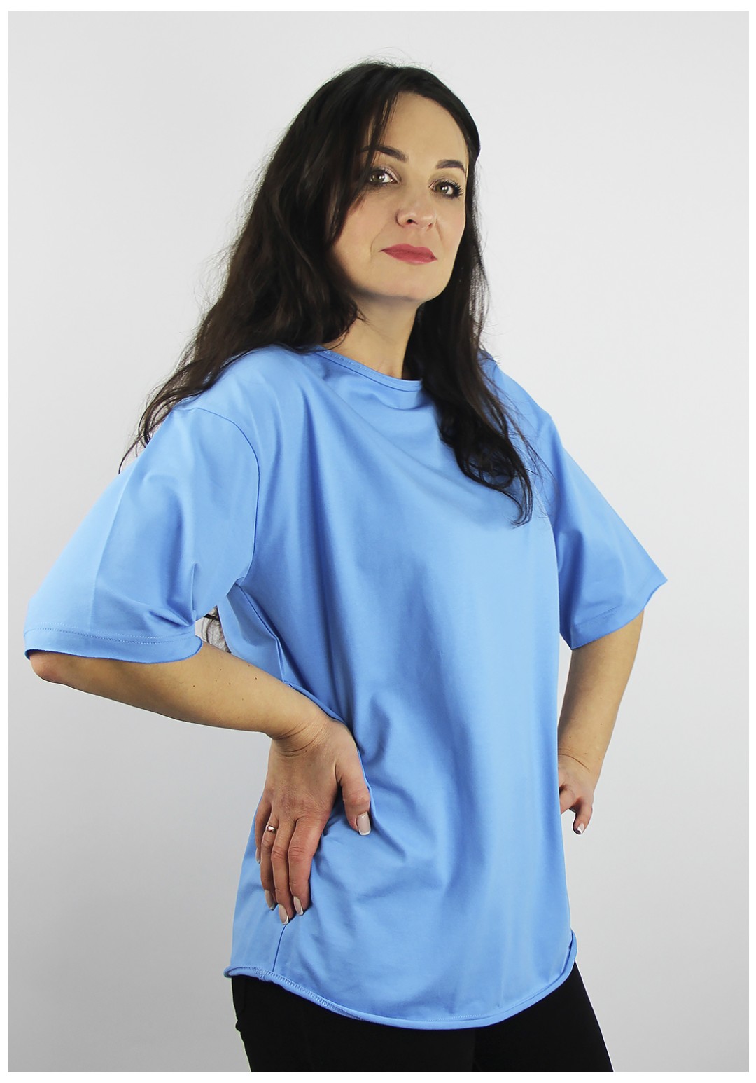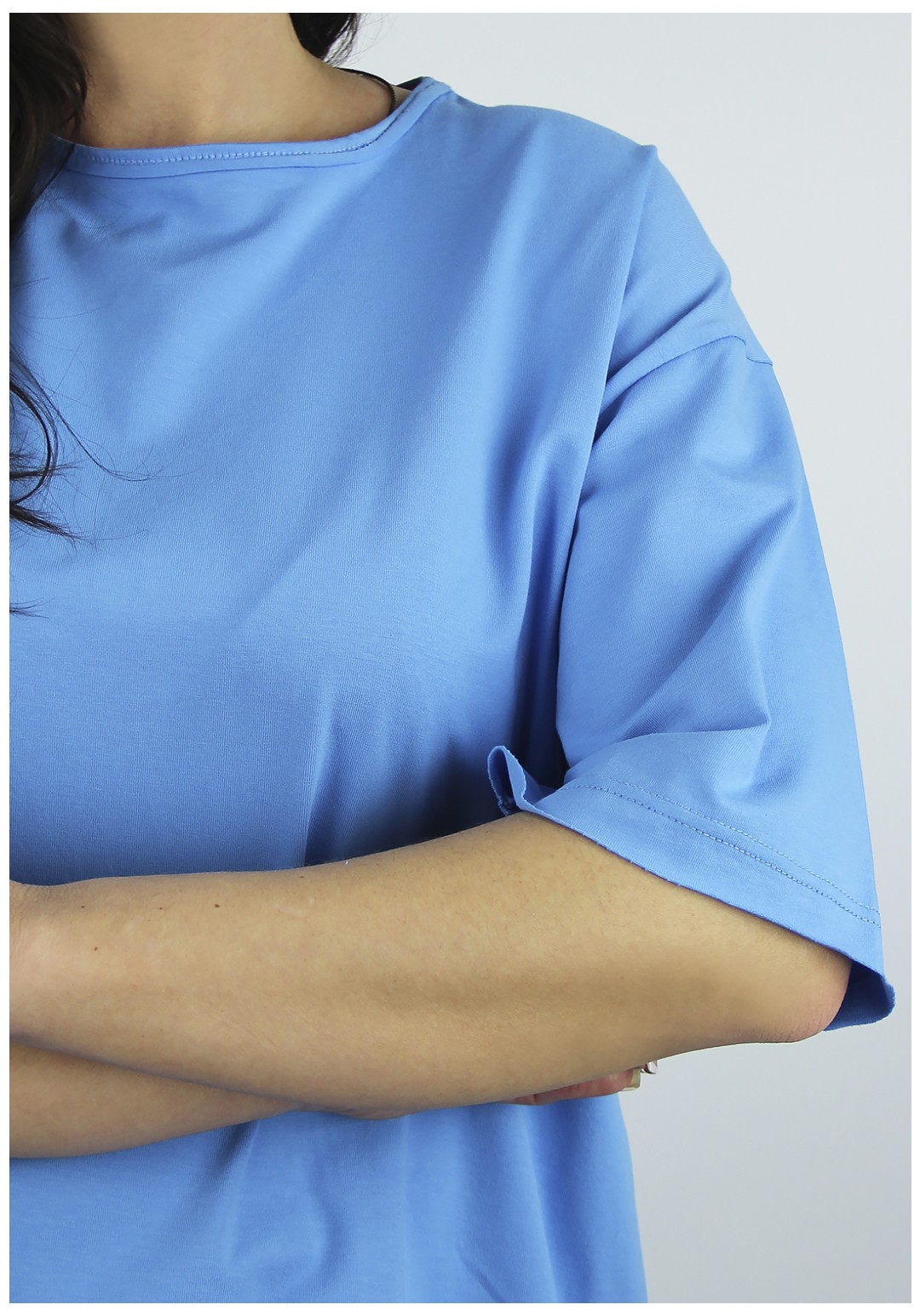 Джемпер второго слоя одежды, прямого силуэта, со спущеным плечем и коротким, до локтя, рубашечным рукавом. Вырез горловины окантован с открытым срезом. Низ стана и рукава - с открытым срезом, проложена отделочная строчка на спецмашине.
