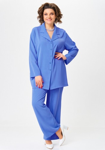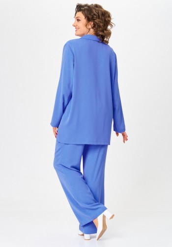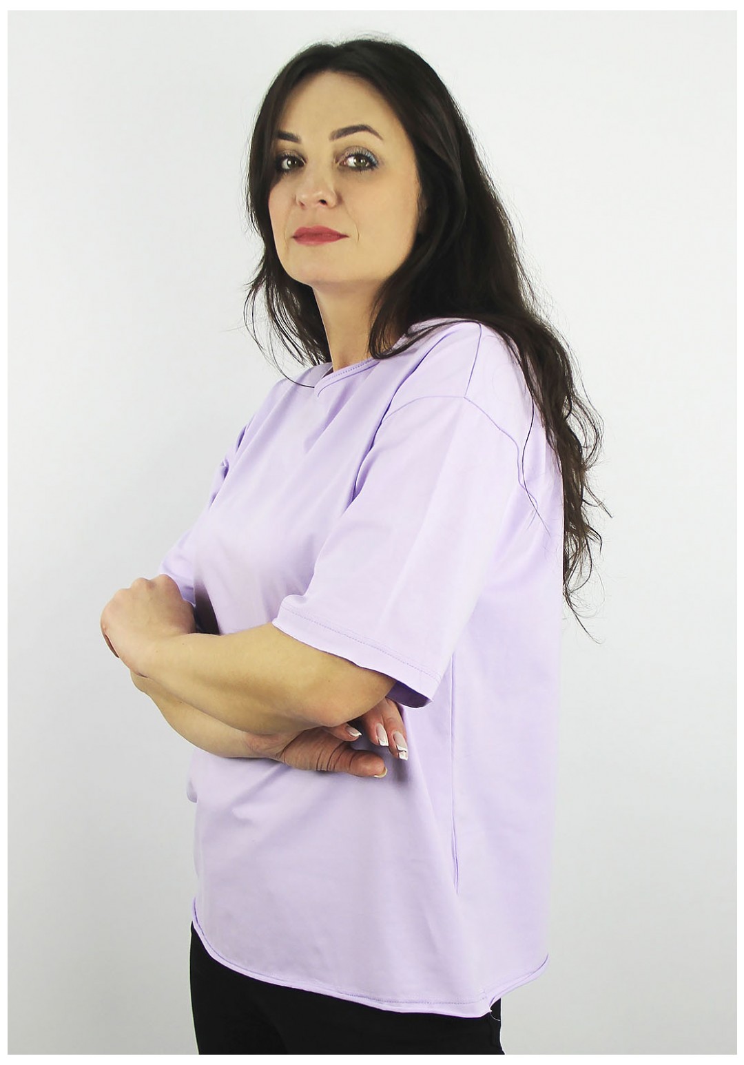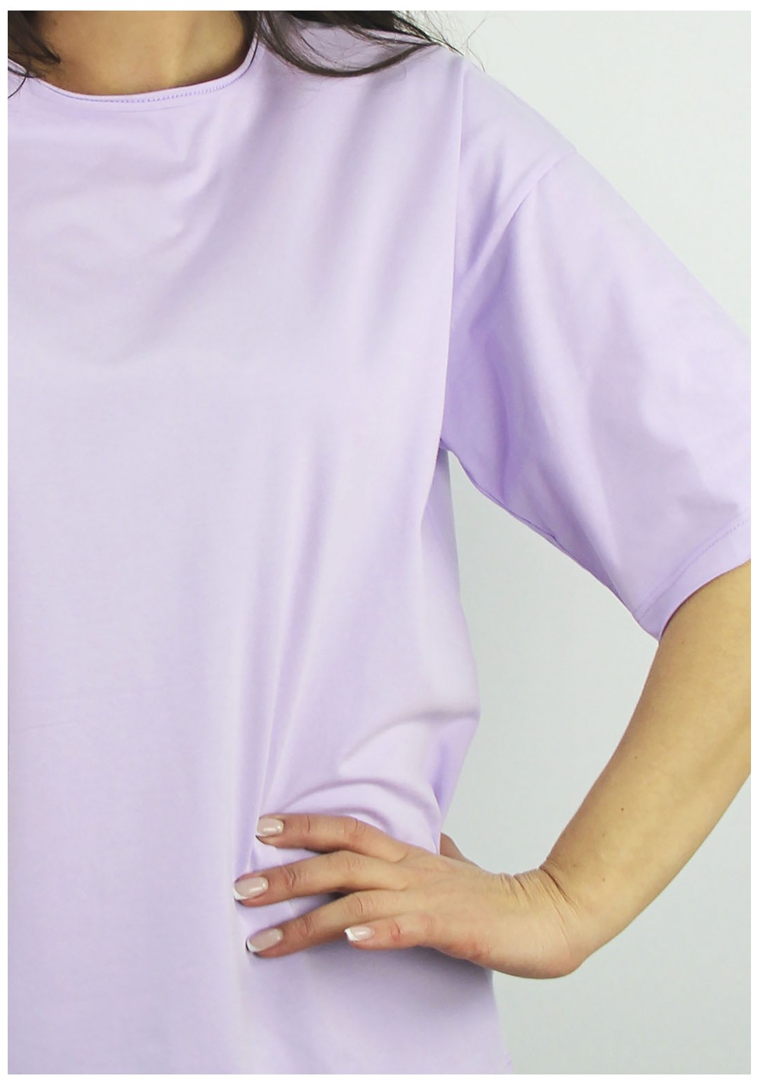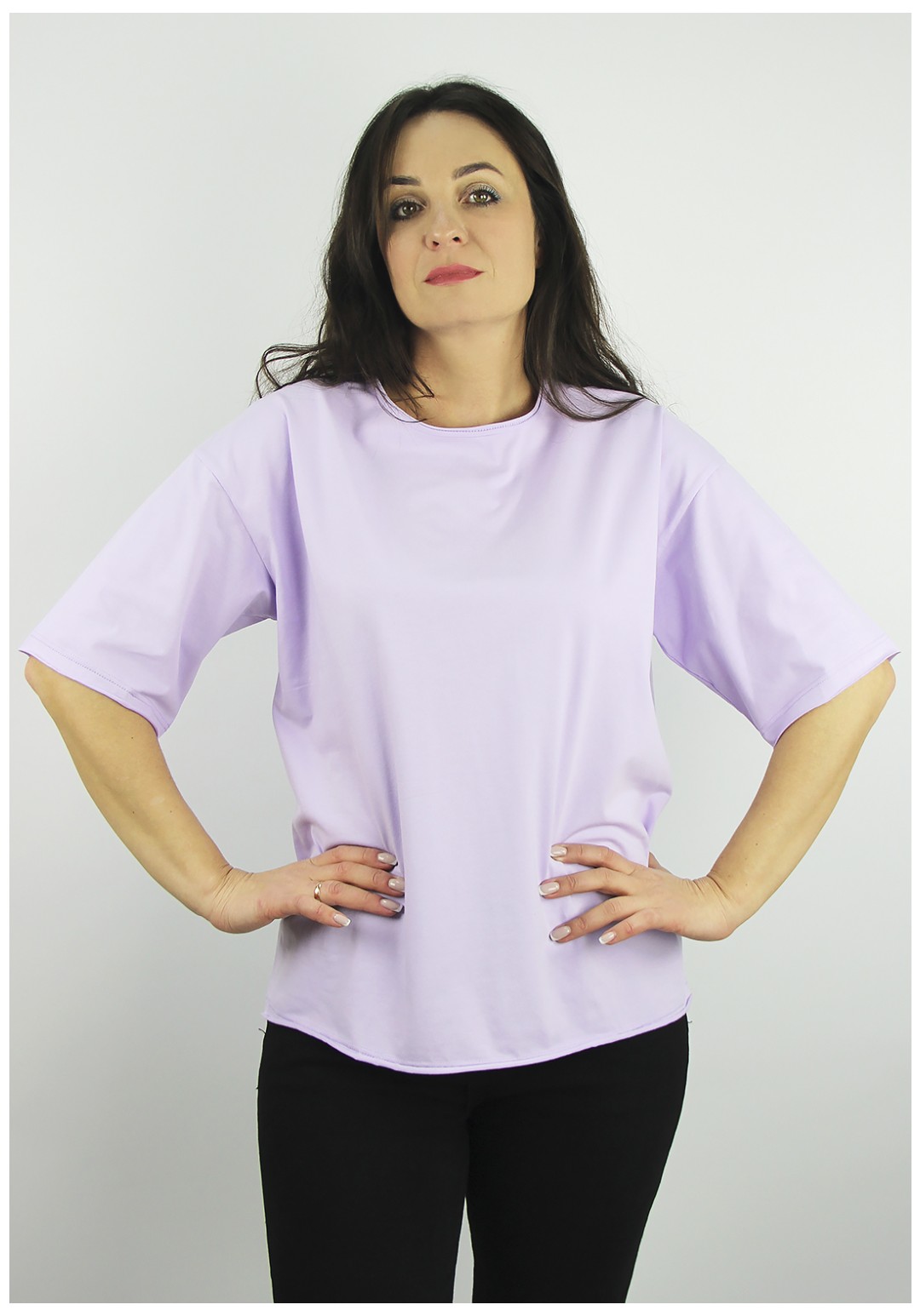 Джемпер второго слоя одежды, прямого силуэта, со спущеным плечем и коротким, до локтя, рубашечным рукавом. Вырез горловины окантован с открытым срезом. Низ стана и рукава - с открытым срезом, проложена отделочная строчка на спецмашине.