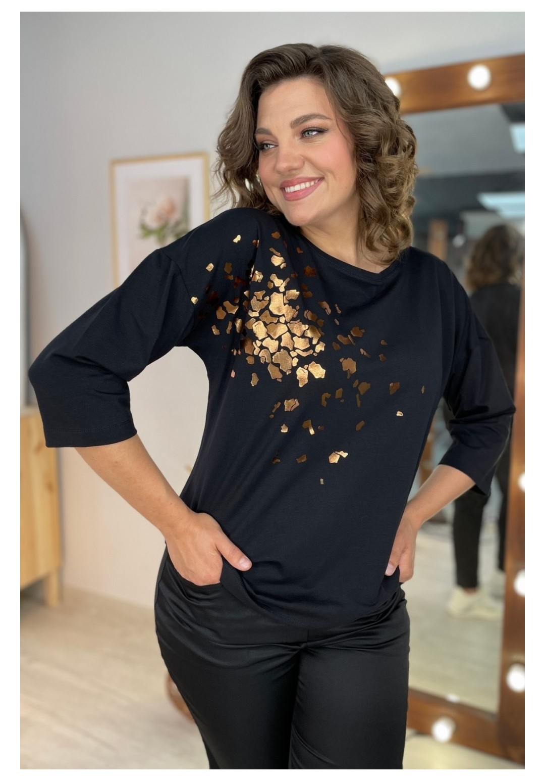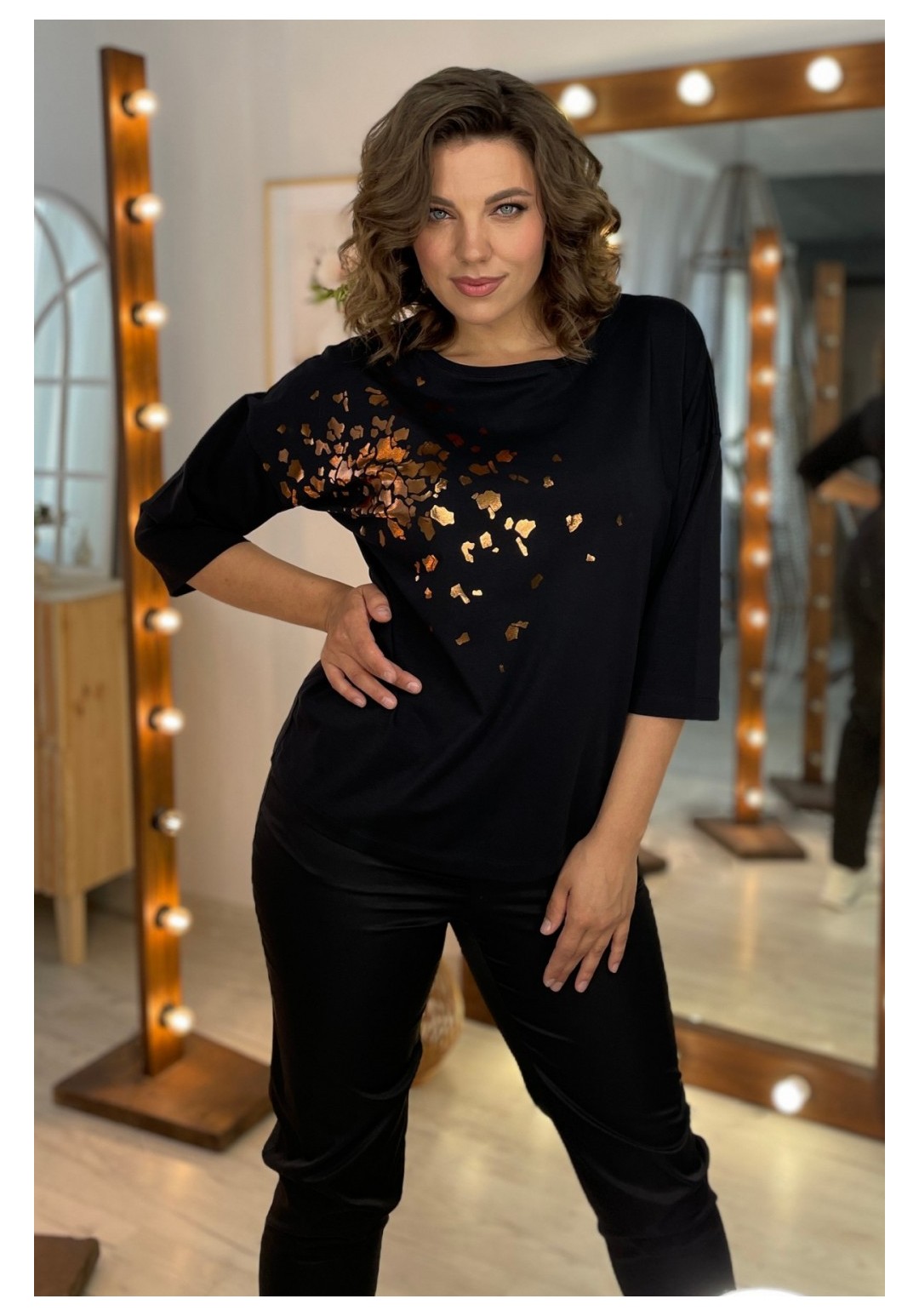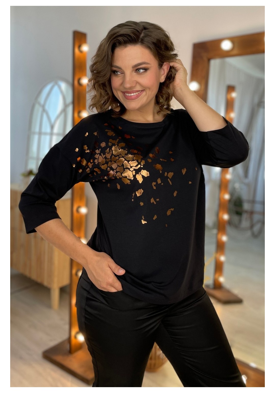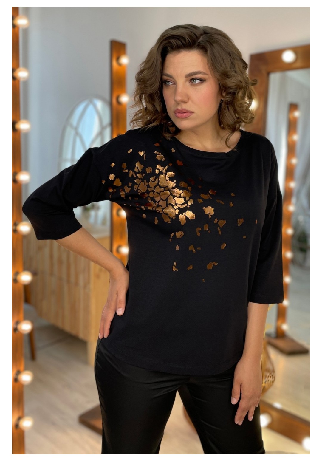 Джемпер женский из трикотажной ткани. По переду расположен принт. Спущенное плечо, рукав 3/4. Вырез горловины круглый, оформлен притачной бейкой. Рекомендации по уходу: стирка и глажка с изнаночной стороны. Промеры на примере 50 размера: ОГ - 110 см, ОБ - 112 см. Длина рукава от крайней точки шеи - 52 см. Длина изделия по спинке - 62 см