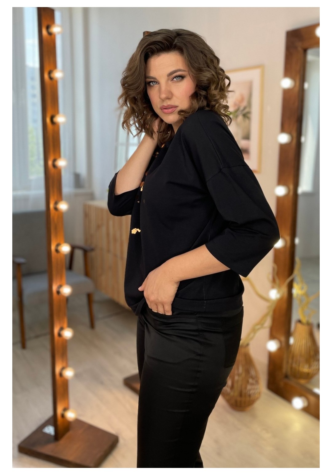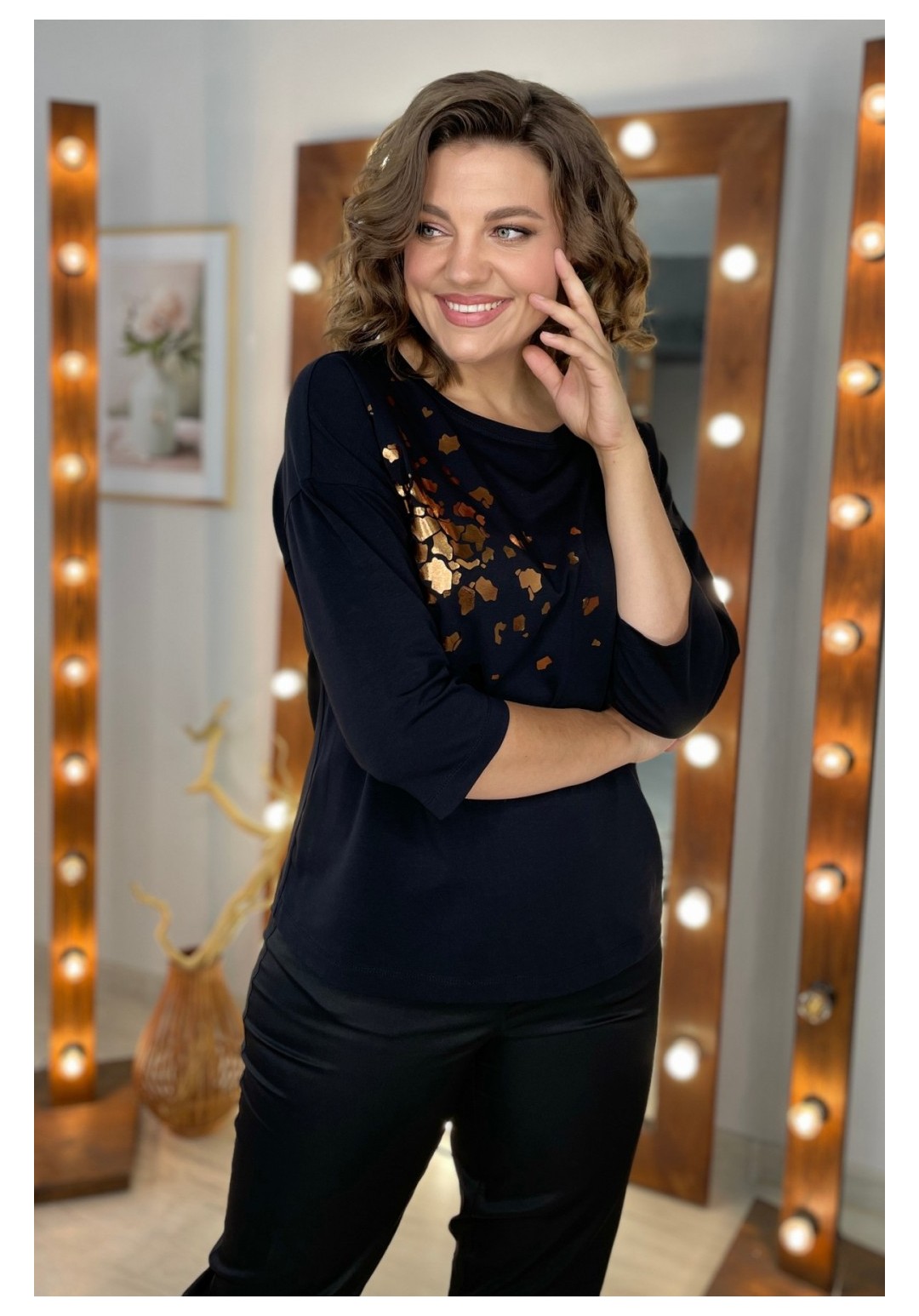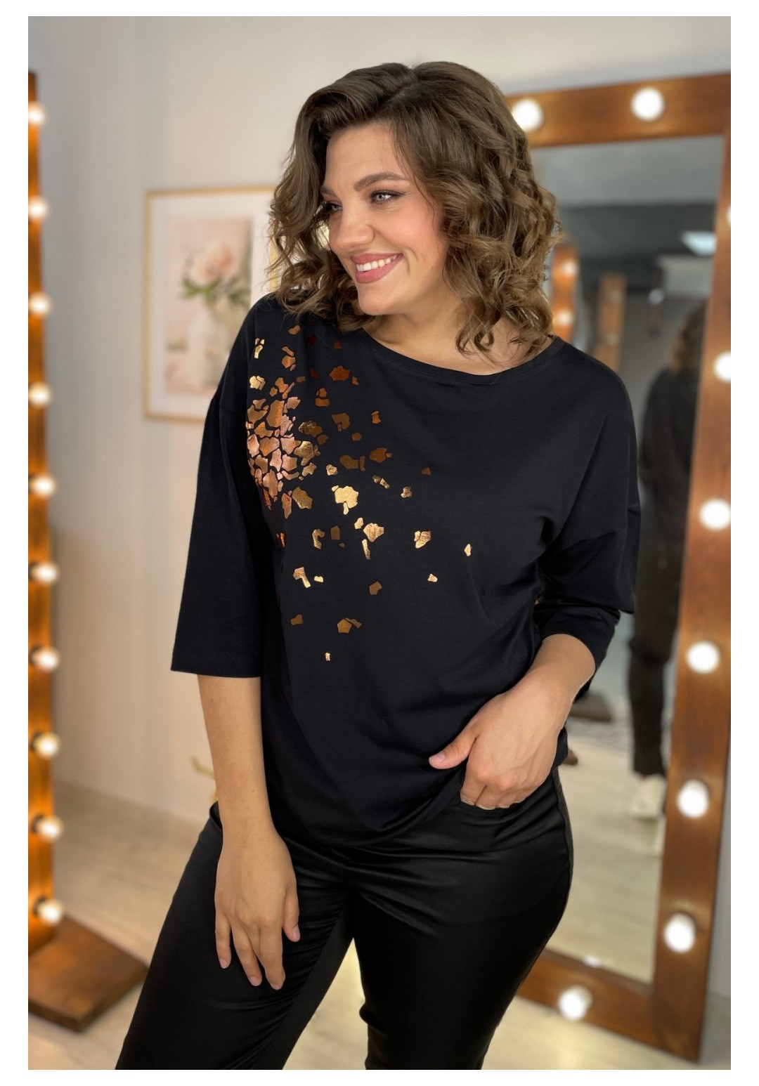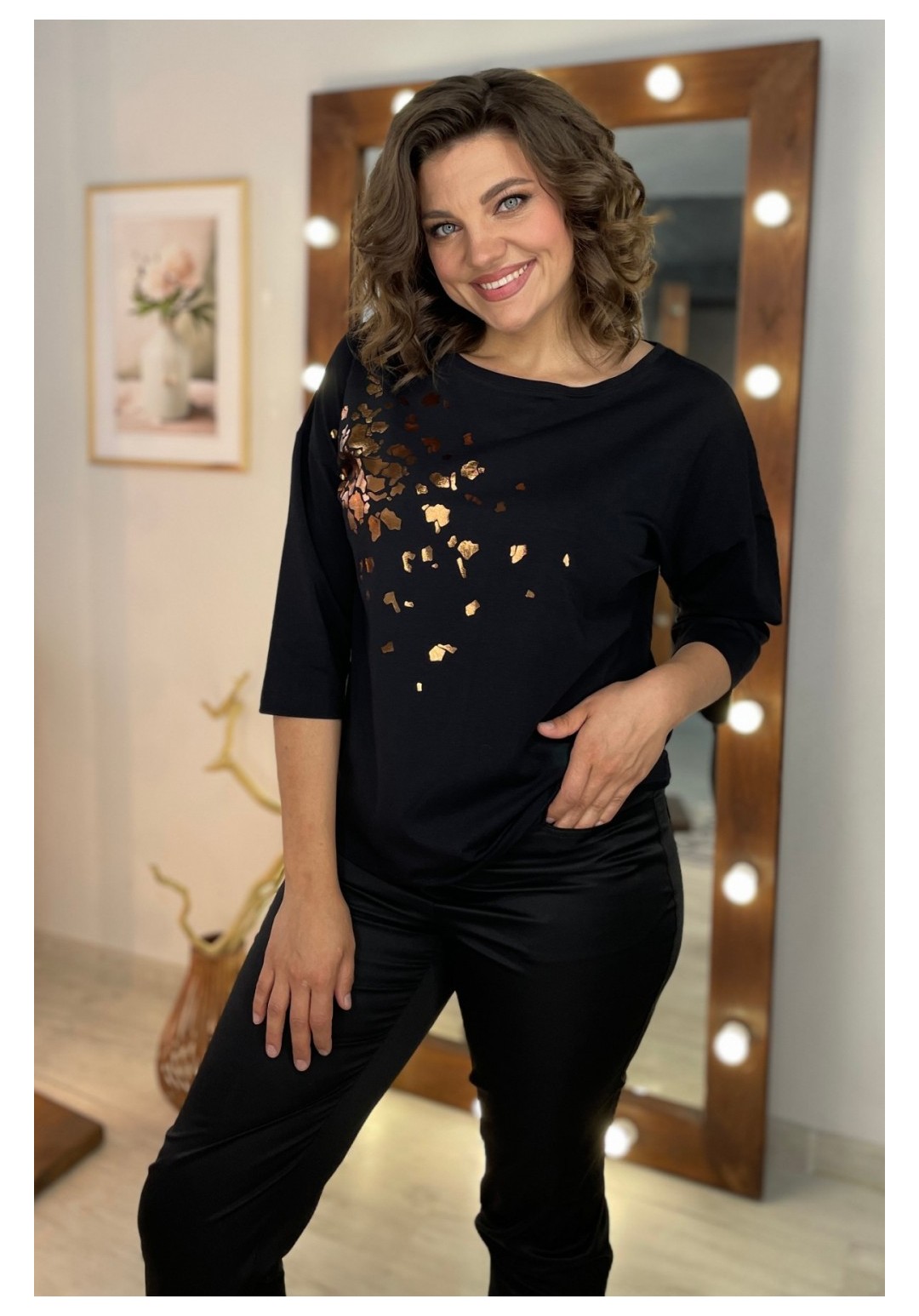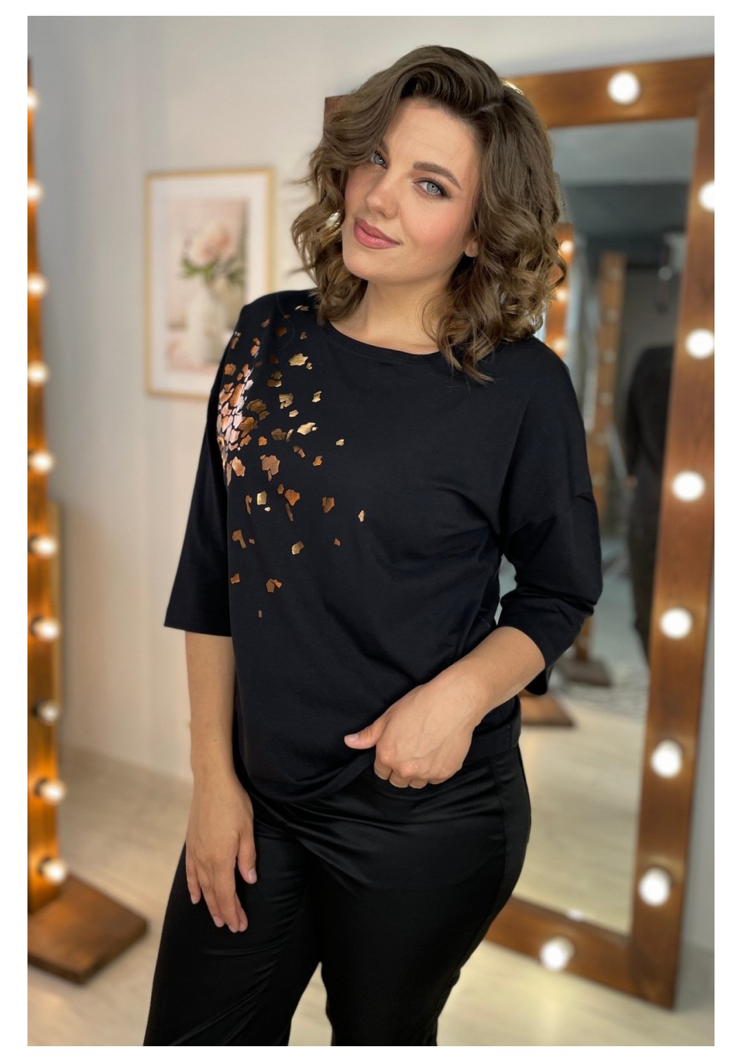 Джемпер женский из трикотажной ткани. По переду расположен принт. Спущенное плечо, рукав 3/4. Вырез горловины круглый, оформлен притачной бейкой. Рекомендации по уходу: стирка и глажка с изнаночной стороны. Промеры на примере 50 размера: ОГ - 110 см, ОБ - 112 см. Длина рукава от крайней точки шеи - 52 см. Длина изделия по спинке - 62 см