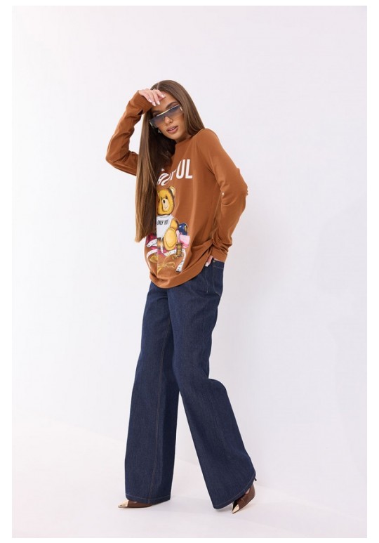 Джемпер прямого силуэта из трикотажного полотна. Горловина круглой формы. Рукав прямой удлинённый с отверстием для большого пальца. На переде выполнена печать. Длина рукава 68 см. 44 р-р: ОГ - 100 см., ОТ - 96 см., ОБ - 100 см. 46 р-р: ОГ - 104 см., ОТ - 100 см., ОБ - 104 см. 48 р-р: ОГ - 108 см., ОТ - 104 см., ОБ - 108 см. 50 р-р: ОГ - 112 см., ОТ - 108 см., ОБ - 112 см. 52 р-р: ОГ - 116 см., ОТ - 112 см., ОБ - 116 см.