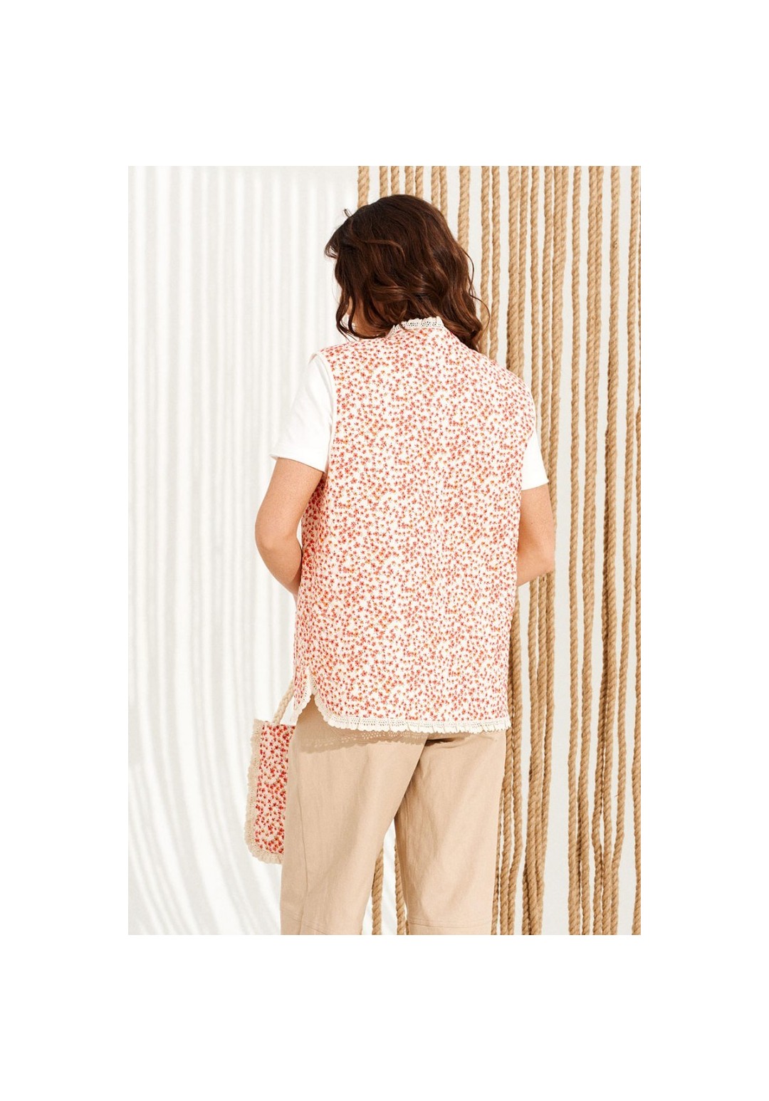 Жилет из стеганой ткани, свободного объема, прямого силуэта, с V-образным вырезом горловины. Детали переда с накладными карманами. Спинка цельная. Застежка центральная, на завязках с наконечниками. Горловина, борта, проймы и низ изделия обработаны окантовочной бейкой. Длина изделия на модели вдоль середины спинки с учетом кружева по низу — 67,5 см (допустимое отклонение +/- 1 см)